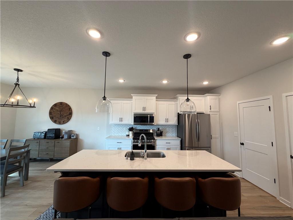 Modern kitchen with quartz countertops, stainless steel appliances, eat-in dining, and large pantry