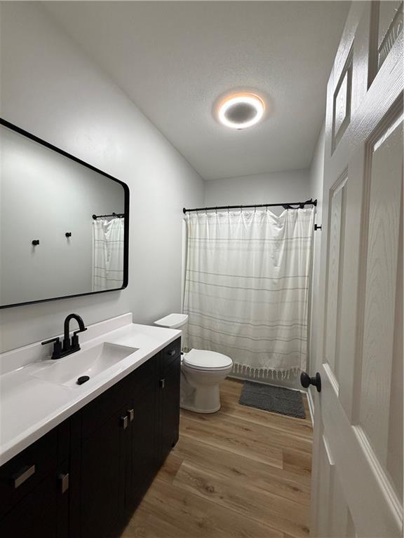 Open floor plan with gleaming hardwood floors and vaulted ceilings