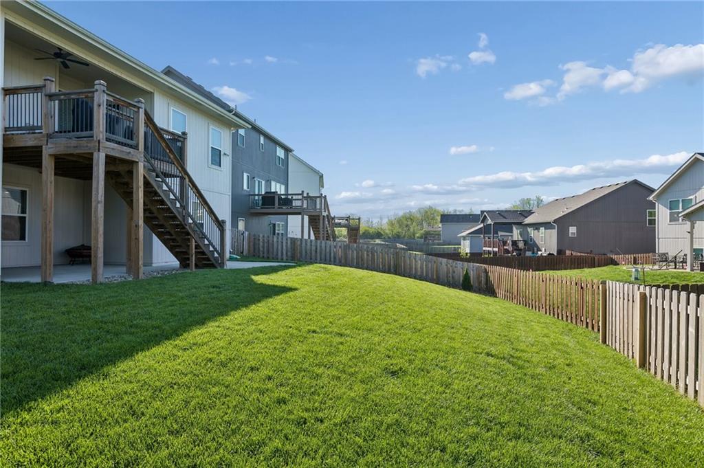 Covered deck overlooks beautifully maintained fenced yard