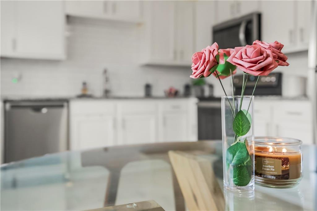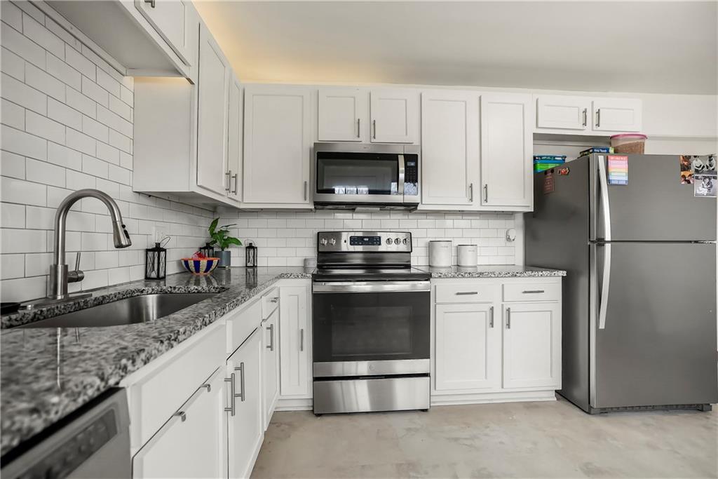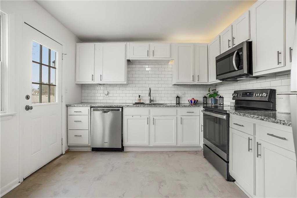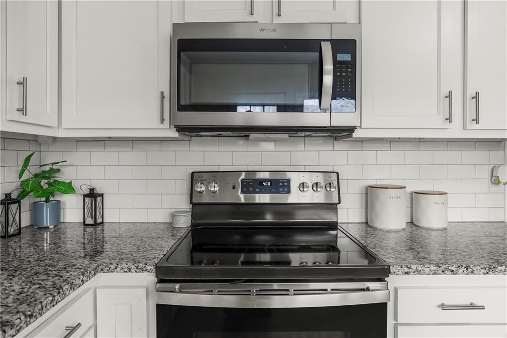 - Appliances Dishwasher, Disposal, Microwave, Electric Range, Stainless Steel Appliance(s)