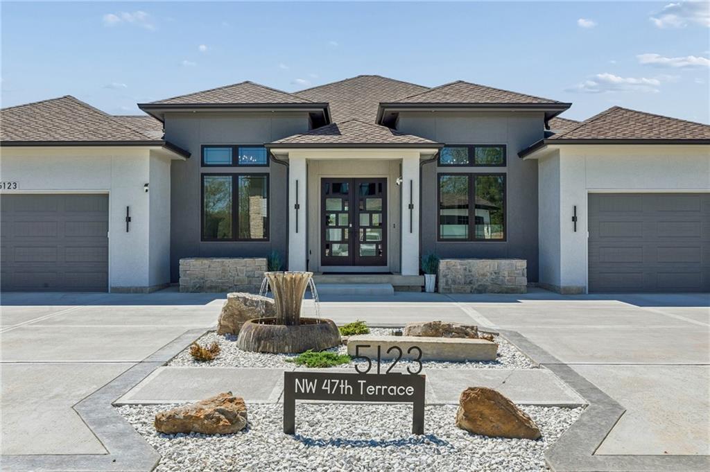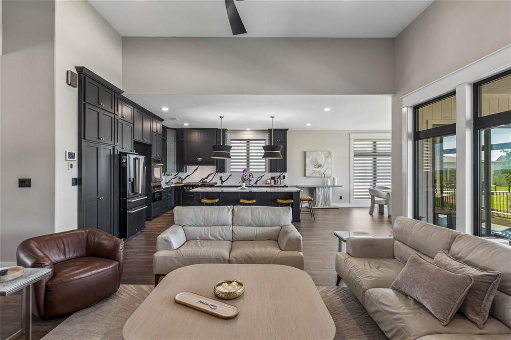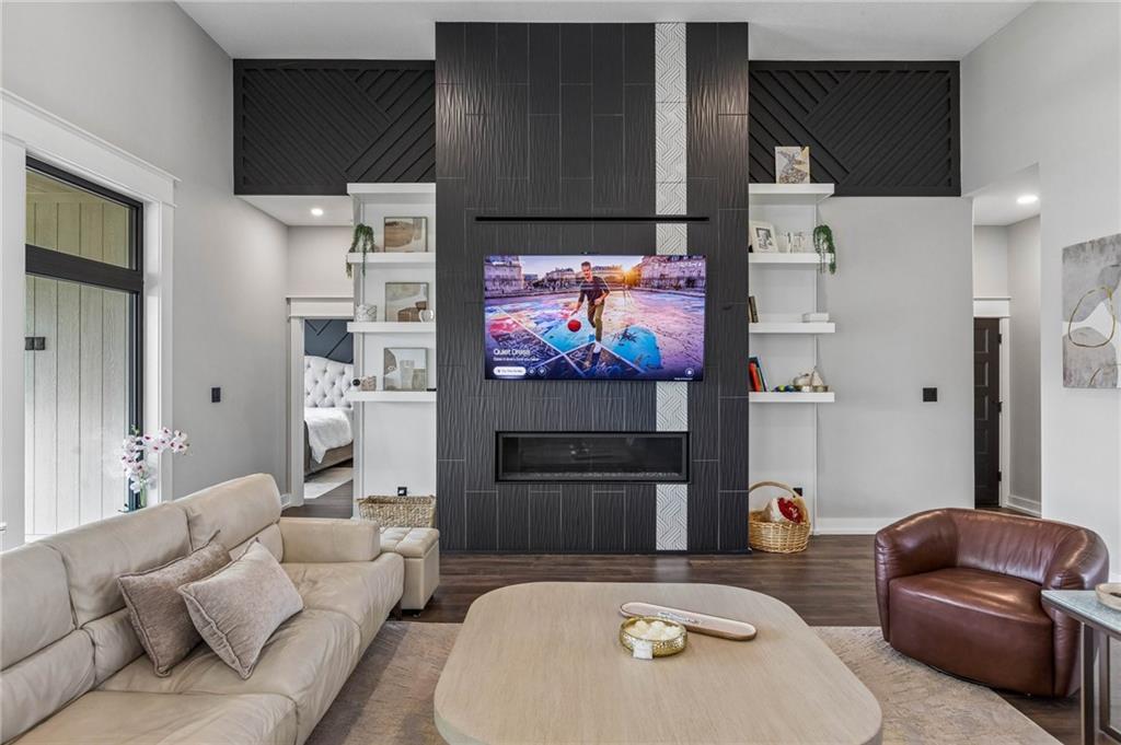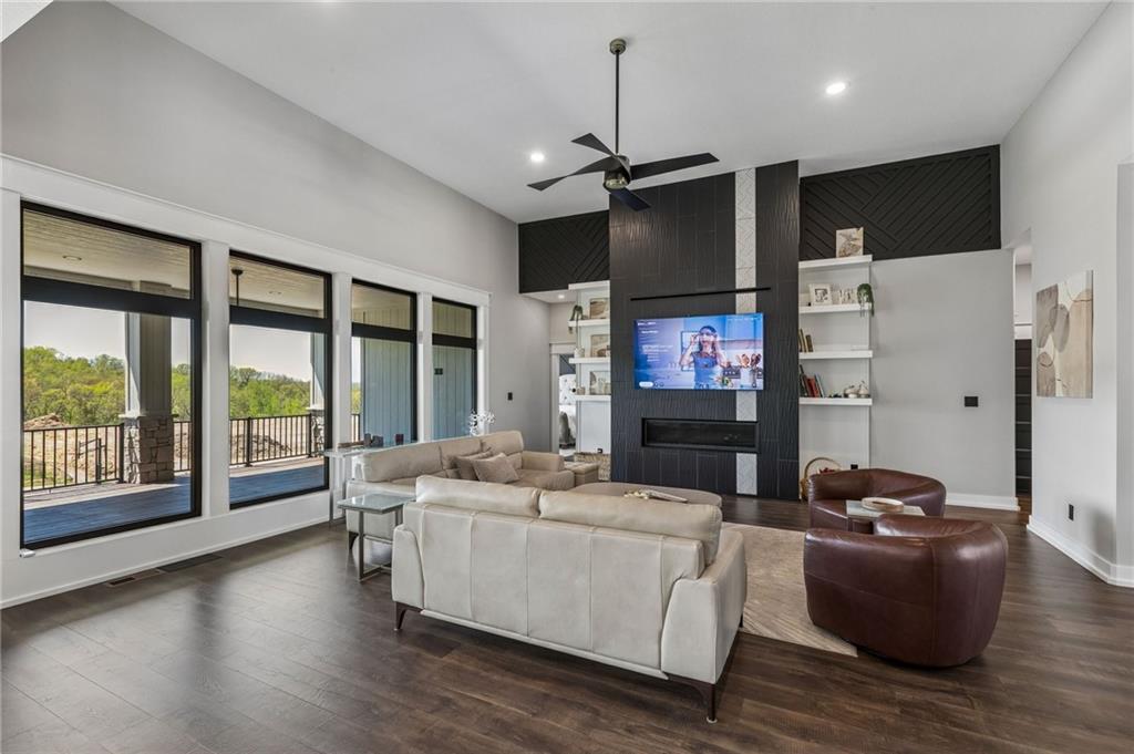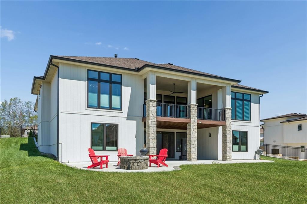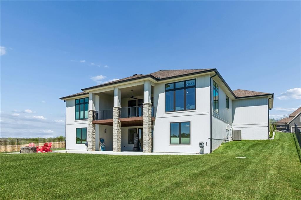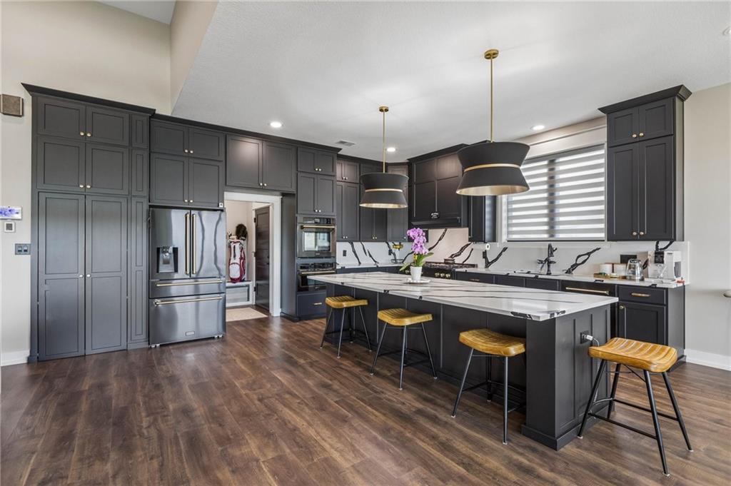 Located in the Highly Desirable Montebella Community. Only Minutes from both Downtown and MCI International Airport. This Luxury Home is a masterpiece of Modern Design! Experience a Bold first impression by entering through either the His-and-Her Garages or the Oversized Double Front Door. Be Welcomed by a Sleek and Stylish Kitchen featuring black ZLINE appliances including a double oven and a 8-burner gas stove. These match perfectly with the dramatic Quartz Countertops and Backsplash, combining form and factor for an elevated yet practical Home Cooking experience. Keep all your ingredients in the Custom pantry with a second full-sized refrigerator. Passing the Beautifully Designed Entertainment Wall with a linear fireplace, step into a Lavish Master Bedroom and Bathroom. Touting a One-of-a-kind Trim Wall, a Vanity with Individual Cabinet Towers and Personal Beauty Station, a Spacious Shower featuring a Rain Head and bench, and a HUGE Closet with 3rd tier mechanically assisted pull down rails, This Master leaves nothing to be desired. All Black Windows pull the Contemporary Aesthetic through the whole Home as you find yourself in the Lower Level. Two Bedrooms and 1.5 Bathrooms accompany a more versatile space for an office or exercise room. Spend time with family and guests in the rec area large enough for a full on Entertainment zone with a Home Theater and a Pool Table. Besides Looking Great outside, The Home offers a fenced in yard, no unusable space, and a gas fire pit. This Home truly is Better-Than-New with all the Bonus features like Epoxy Garage Floors, Fenced in yard, Additional Landscaping, Garage Heaters, and Window Treatments already in place. Here you can, Entertain in a Home your guests will remember, and Make Memories with your Family you will Cherish for a lifetime.