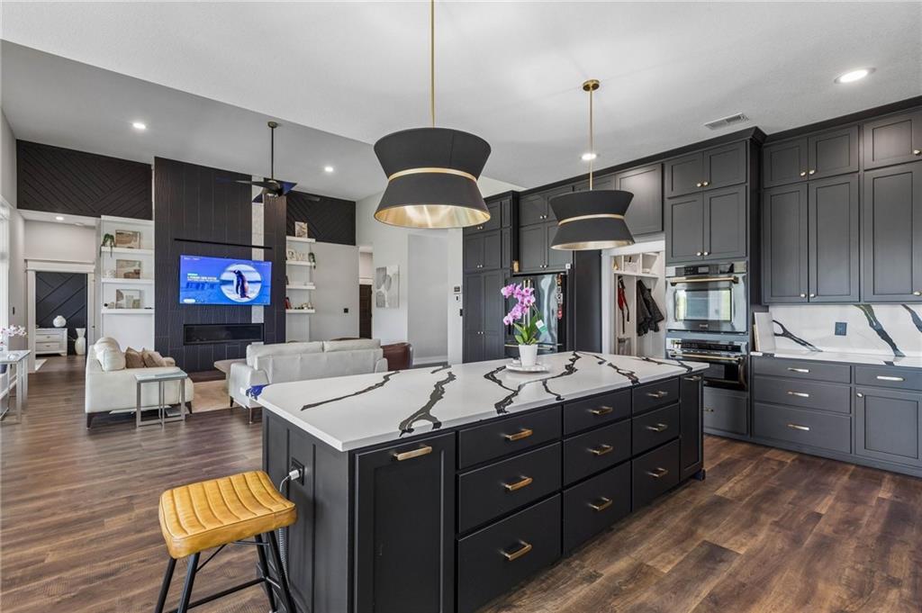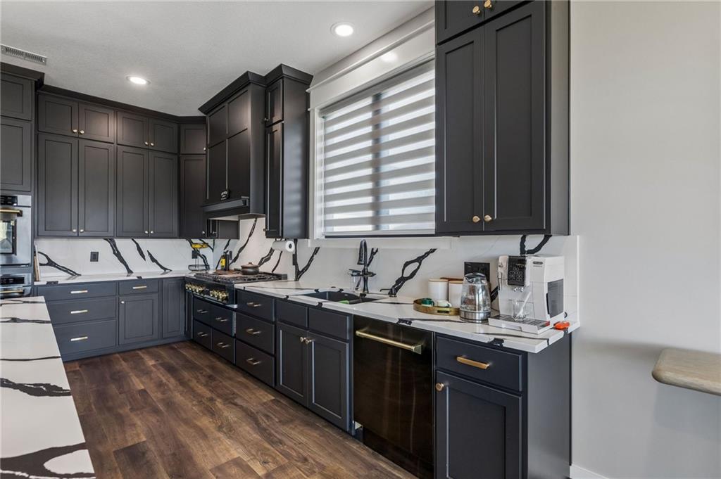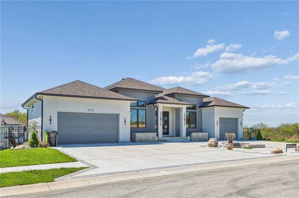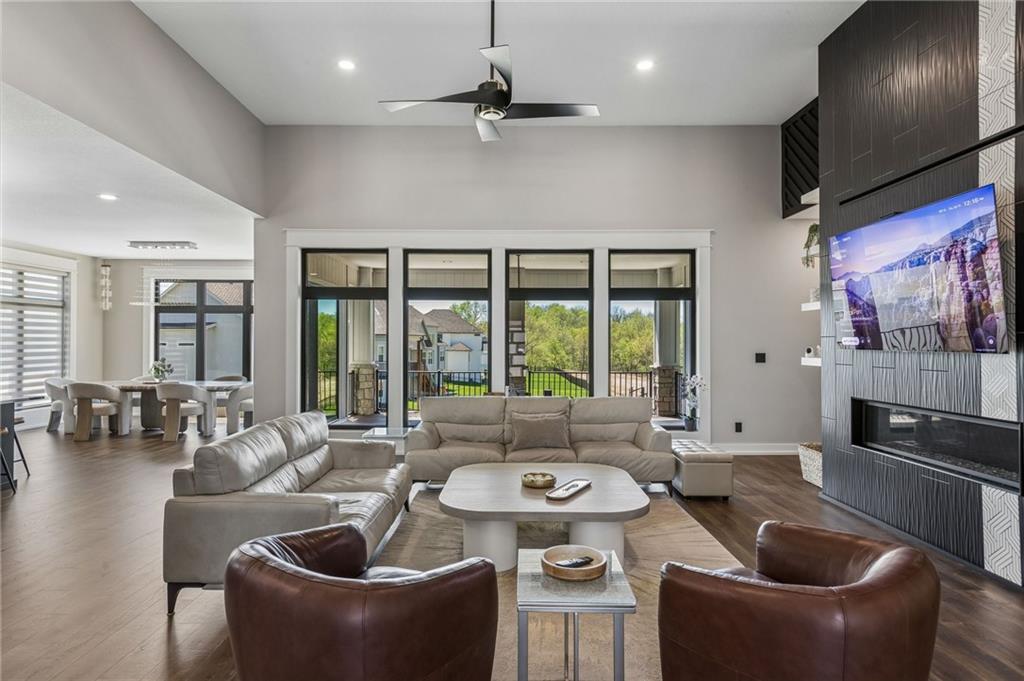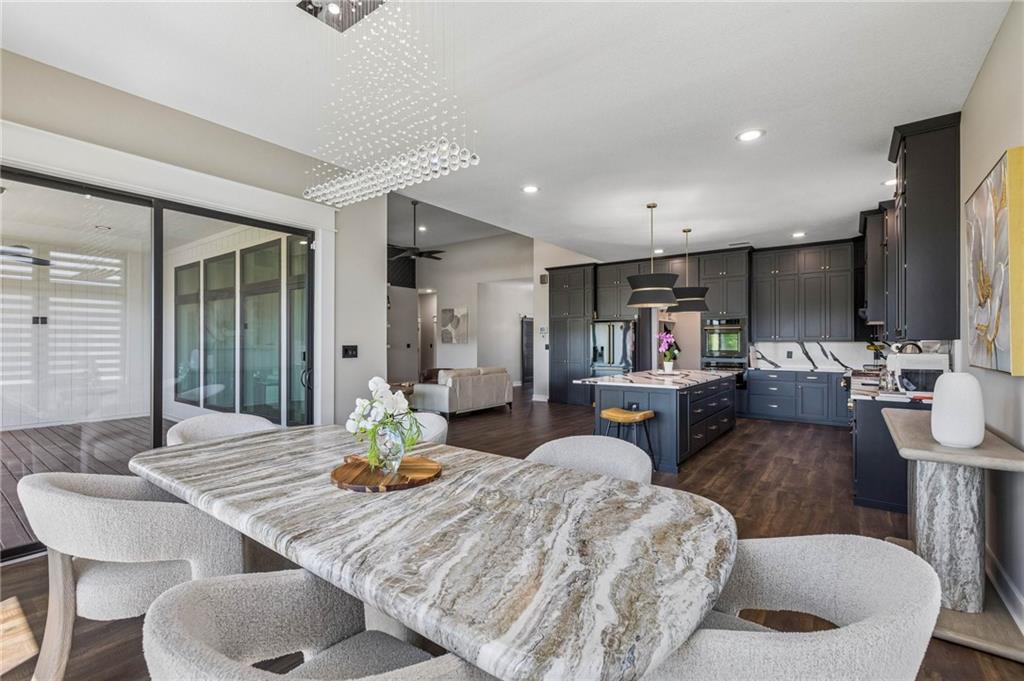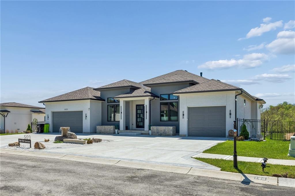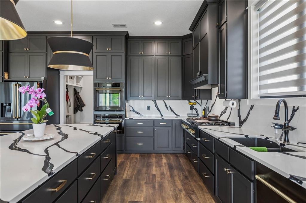 Located in the Highly Desirable Montebella Community. Only Minutes from both Downtown and MCI International Airport. This Luxury Home is a masterpiece of Modern Design! Experience a Bold first impression by entering through either the His-and-Her Garages or the Oversized Double Front Door. Be Welcomed by a Sleek and Stylish Kitchen featuring black ZLINE appliances including a double oven and a 8-burner gas stove. These match perfectly with the dramatic Quartz Countertops and Backsplash, combining form and factor for an elevated yet practical Home Cooking experience. Keep all your ingredients in the Custom pantry with a second full-sized refrigerator. Passing the Beautifully Designed Entertainment Wall with a linear fireplace, step into a Lavish Master Bedroom and Bathroom. Touting a One-of-a-kind Trim Wall, a Vanity with Individual Cabinet Towers and Personal Beauty Station, a Spacious Shower featuring a Rain Head and bench, and a HUGE Closet with 3rd tier mechanically assisted pull down rails, This Master leaves nothing to be desired. All Black Windows pull the Contemporary Aesthetic through the whole Home as you find yourself in the Lower Level. Two Bedrooms and 1.5 Bathrooms accompany a more versatile space for an office or exercise room. Spend time with family and guests in the rec area large enough for a full on Entertainment zone with a Home Theater and a Pool Table. Besides Looking Great outside, The Home offers a fenced in yard, no unusable space, and a gas fire pit. This Home truly is Better-Than-New with all the Bonus features like Epoxy Garage Floors, Fenced in yard, Additional Landscaping, Garage Heaters, and Window Treatments already in place. Here you can, Entertain in a Home your guests will remember, and Make Memories with your Family you will Cherish for a lifetime.