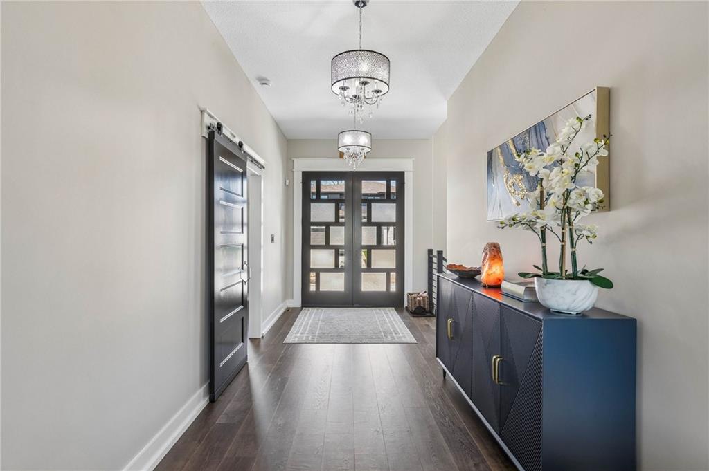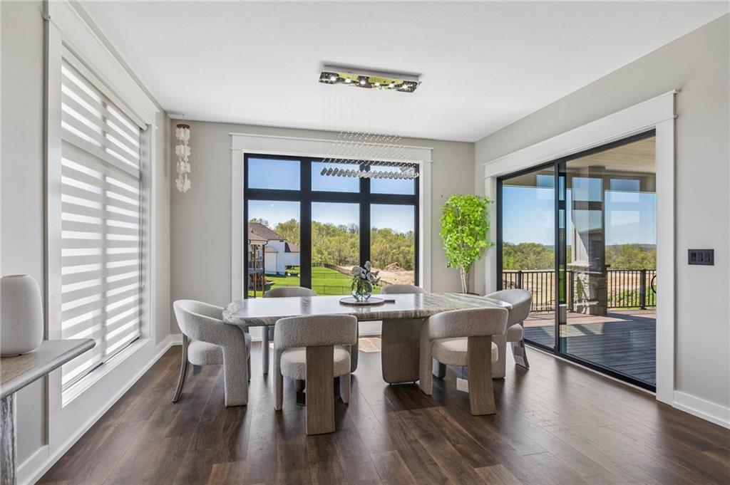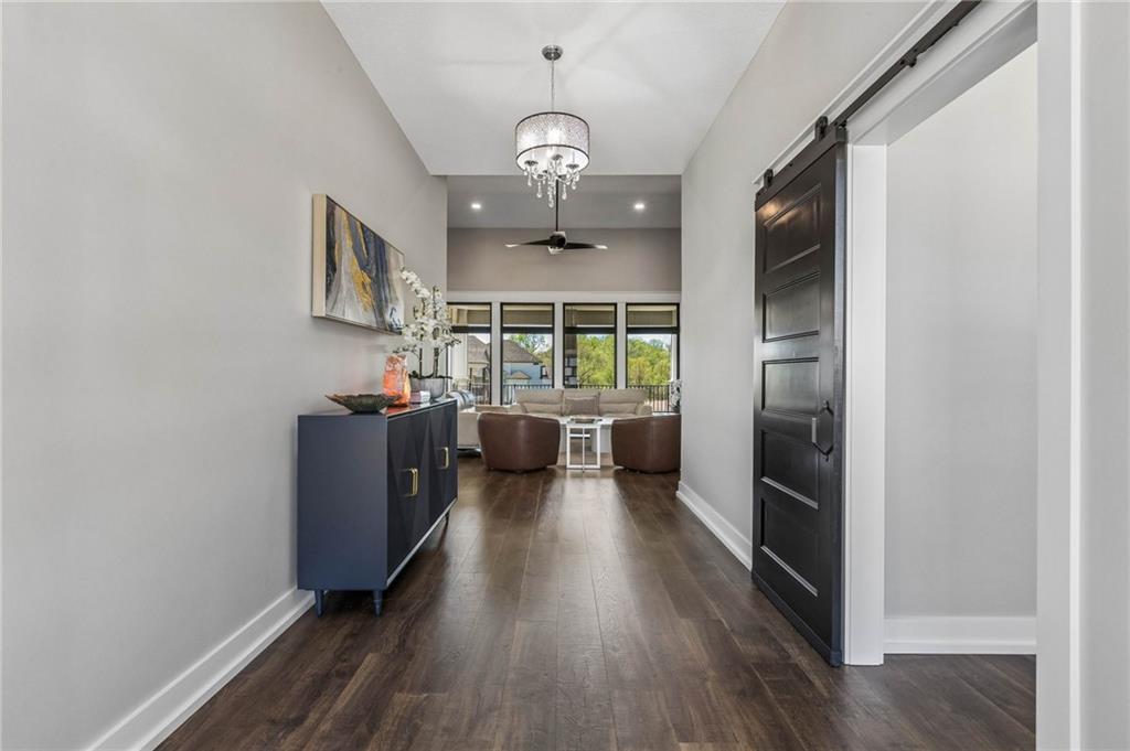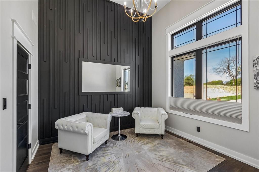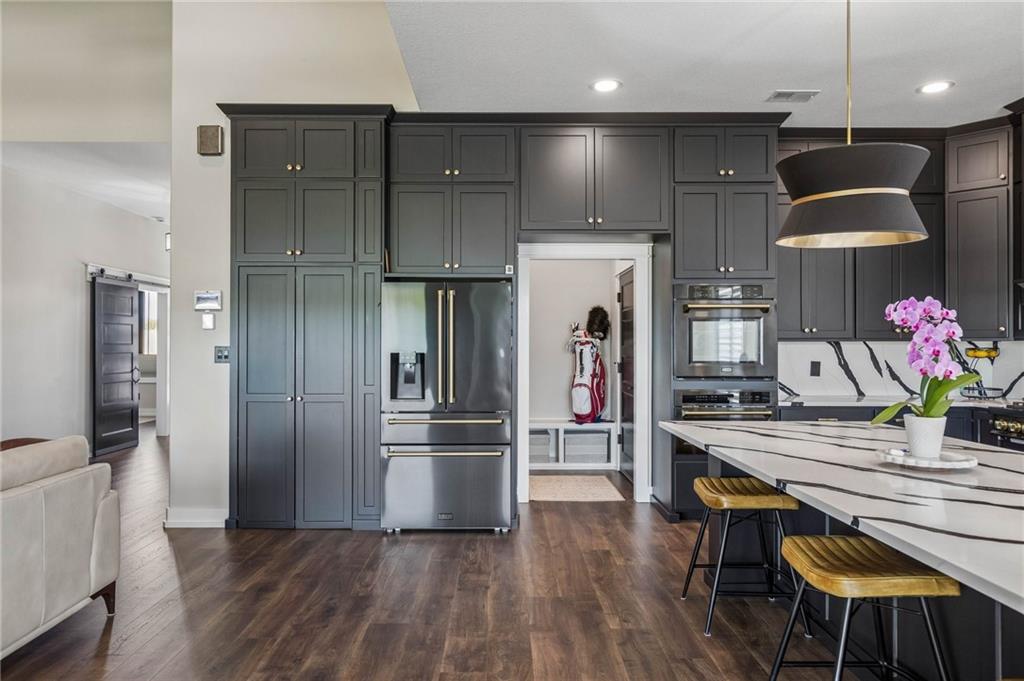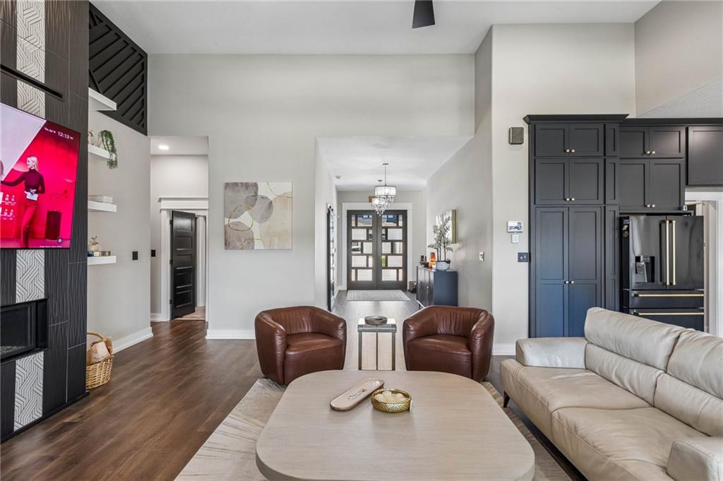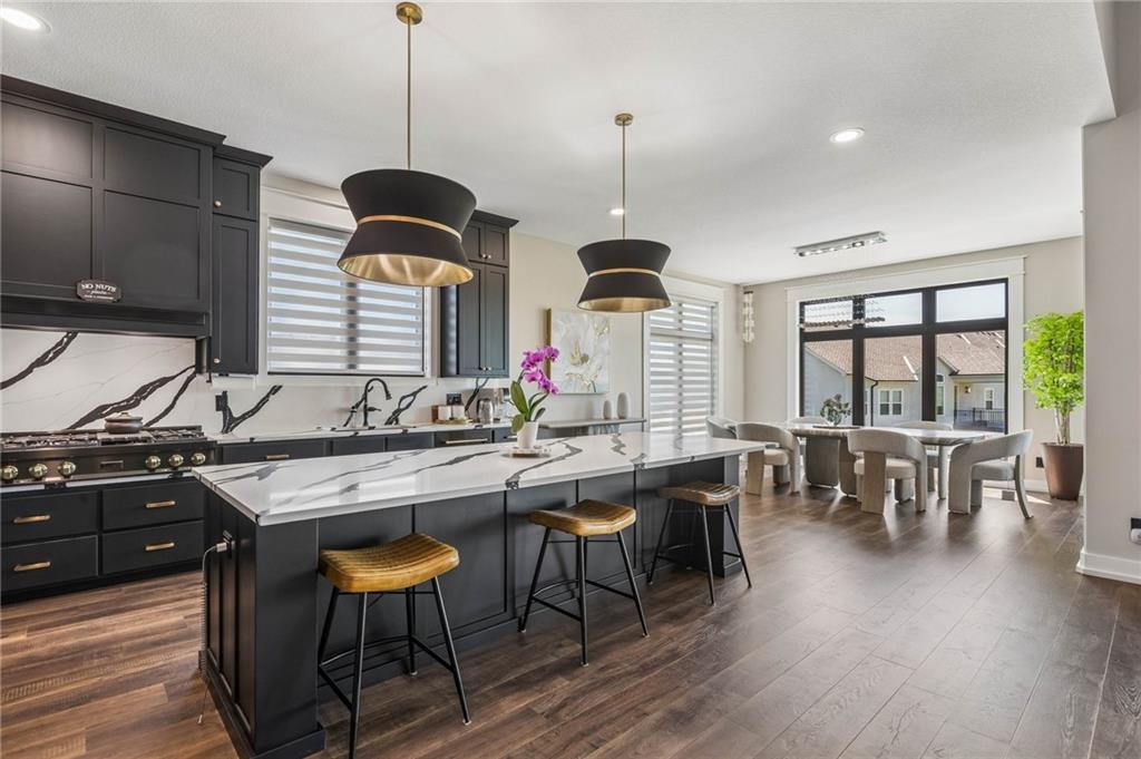 Located in the Highly Desirable Montebella Community. Only Minutes from both Downtown and MCI International Airport. This Luxury Home is a masterpiece of Modern Design! Experience a Bold first impression by entering through either the His-and-Her Garages or the Oversized Double Front Door. Be Welcomed by a Sleek and Stylish Kitchen featuring black ZLINE appliances including a double oven and a 8-burner gas stove. These match perfectly with the dramatic Quartz Countertops and Backsplash, combining form and factor for an elevated yet practical Home Cooking experience. Keep all your ingredients in the Custom pantry with a second full-sized refrigerator. Passing the Beautifully Designed Entertainment Wall with a linear fireplace, step into a Lavish Master Bedroom and Bathroom. Touting a One-of-a-kind Trim Wall, a Vanity with Individual Cabinet Towers and Personal Beauty Station, a Spacious Shower featuring a Rain Head and bench, and a HUGE Closet with 3rd tier mechanically assisted pull down rails, This Master leaves nothing to be desired. All Black Windows pull the Contemporary Aesthetic through the whole Home as you find yourself in the Lower Level. Two Bedrooms and 1.5 Bathrooms accompany a more versatile space for an office or exercise room. Spend time with family and guests in the rec area large enough for a full on Entertainment zone with a Home Theater and a Pool Table. Besides Looking Great outside, The Home offers a fenced in yard, no unusable space, and a gas fire pit. This Home truly is Better-Than-New with all the Bonus features like Epoxy Garage Floors, Fenced in yard, Additional Landscaping, Garage Heaters, and Window Treatments already in place. Here you can, Entertain in a Home your guests will remember, and Make Memories with your Family you will Cherish for a lifetime.