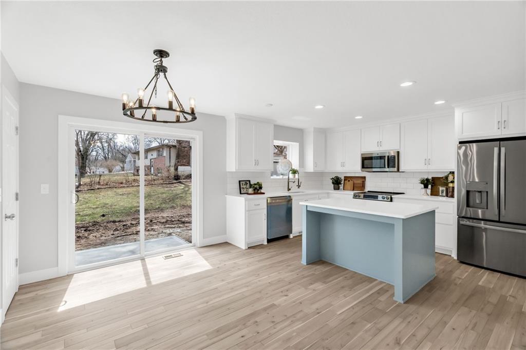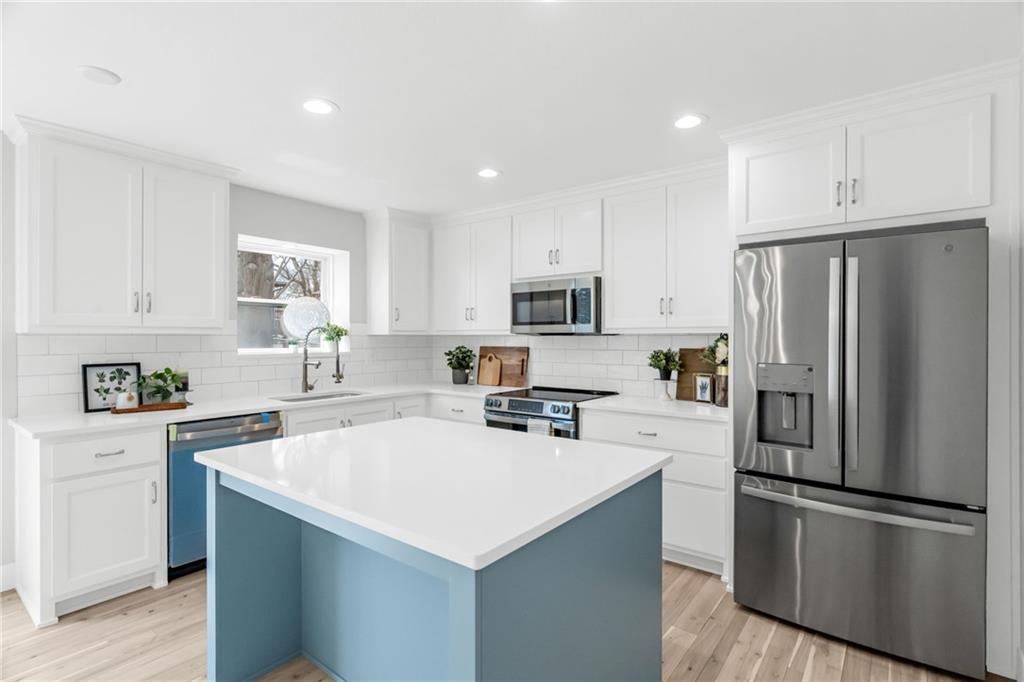 The **completely redesigned Kitchen is a true showstopper** boasting custom white cabinetry, a large center island, quartz countertops, tile backsplash and stainless-steel appliances—perfect for everyday living or hosting guests.
