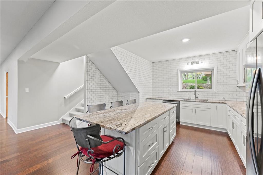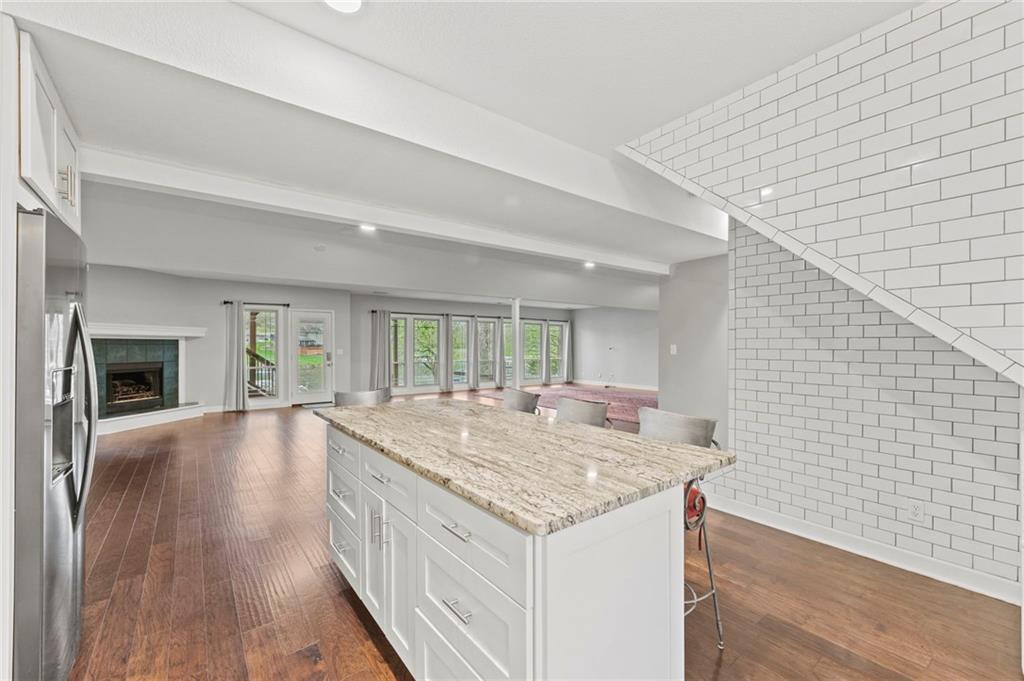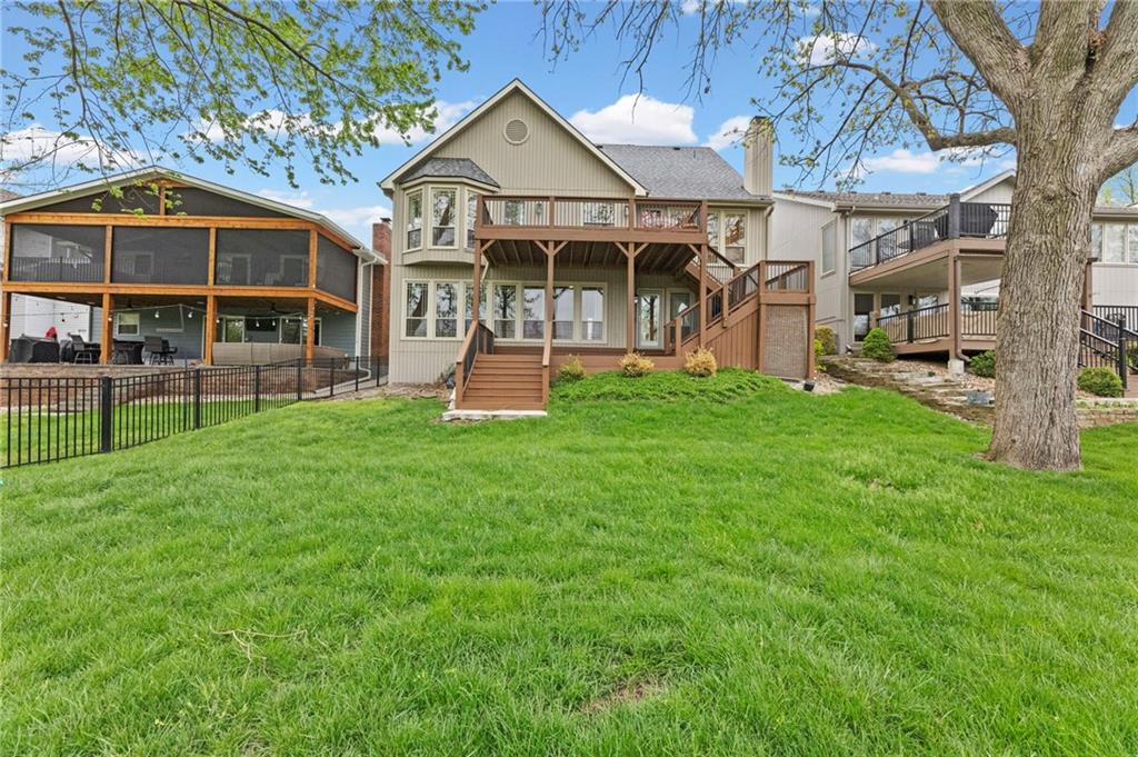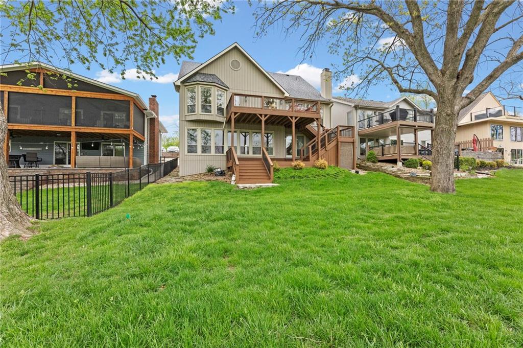Welcome to your Lakefront Retreat. There is nothing left to do but simply move in and enjoy lake living at its finest! This fully renovated 4 bedroom 3 bath home offers 3,136 sq ft of beautifully finished living space with sweeping lake views from nearly every room. Set on a quiet cul-de-sac in the desirable Park Hill School District, the property features deep-water access off your private dock, perfect for swimming, boating and outstanding fishing. Enjoy multiple outdoor living areas including new maintenance-free polymer decks, a connecting platform with storage below, and a large, flat backyard shaded by mature trees. Inside, a main-level kitchen and a second kitchen on the lake level make entertaining easy. All high-end appliances (Cafe in the main kitchen and Whirlpool in the second kitchen, both black stainless) staying with the home including Maytag washer and dryer. The open concept great room is 880+ sq ft with gas fireplace, generous windows, and walk-out deck creating the perfect gathering space. With a bedroom and bathroom on this level, this could easily become a second living area. Additional highlights include all appliances, a 2-car garage with storage loft, flat driveway, new 50-year roof being installed, and extensive remodels throughout. Originally custom-built with reinforced footings, this move-in-ready home combines quality construction with modern updates. Truly a wonderful community, Lake Waukomis offers a clubhouse, walking trails, tennis courts, a baseball field, pickleball court, 18-hole disc golf course, playground, community garden, two parks, week long 4th of July festivities and more! Golf carts are welcomed, and the cart in the garage can be purchased separately. Great highway access, close to downtown, the airport, retail and dining, you will find this to be an entire lifestyle. Visit lakewaukomis.org for more information on the community.