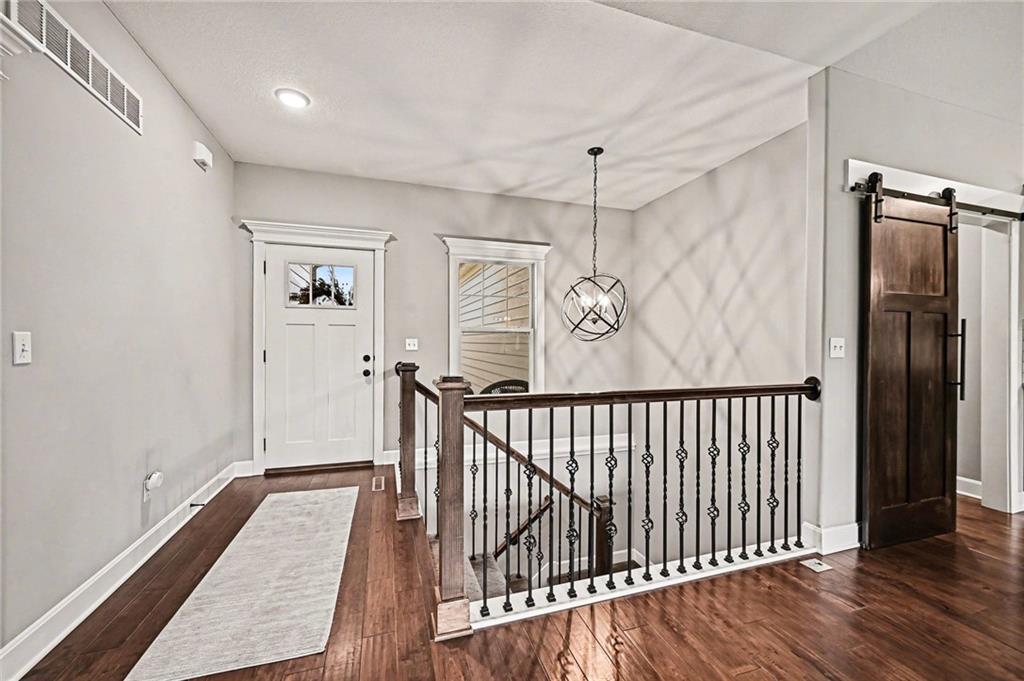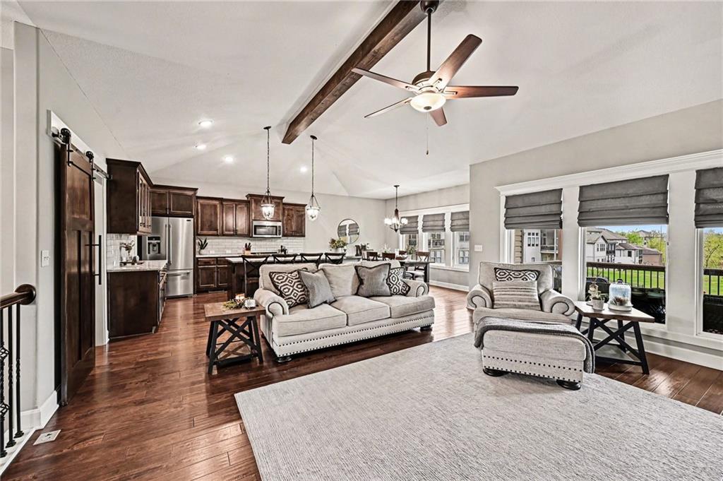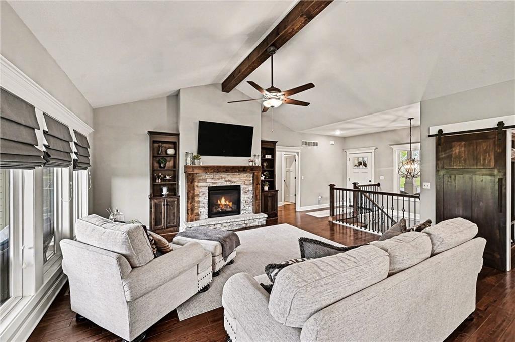 This cute home features meticulously maintained landscaping and great curb appeal. Upon entry, you are welcomed by vaulted ceilings, large windows, and an open, airy layout. Classic wood flooring complements the fireplace, barn doors, and a beautiful wooden beam across the ceiling, tying the space together.