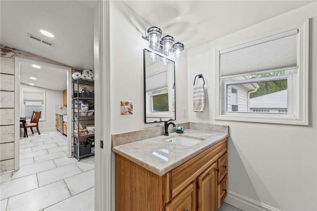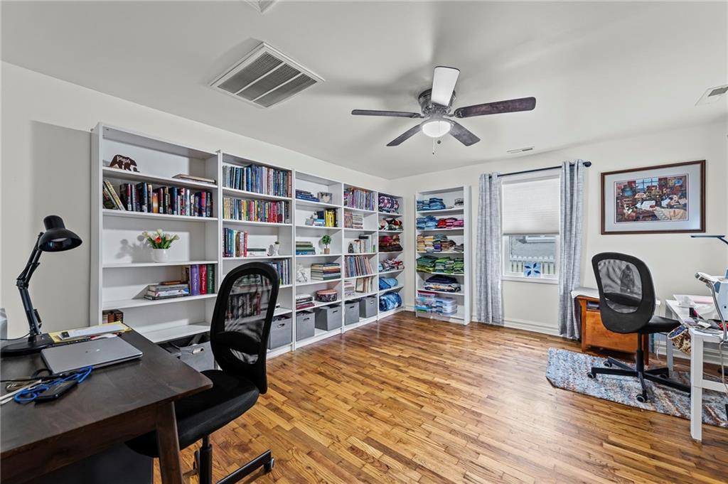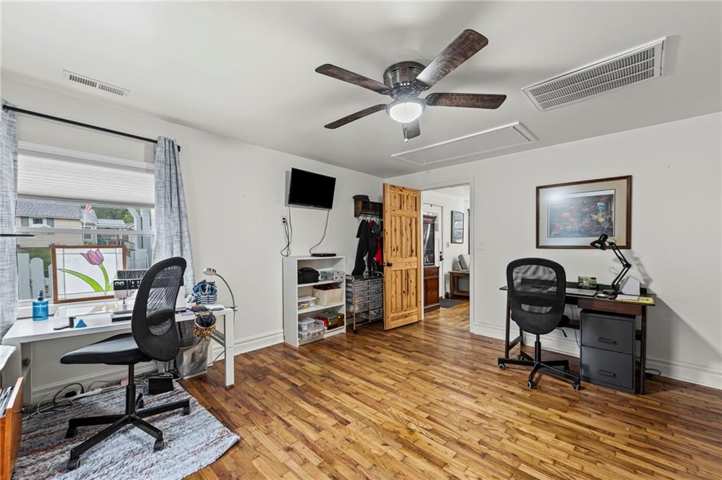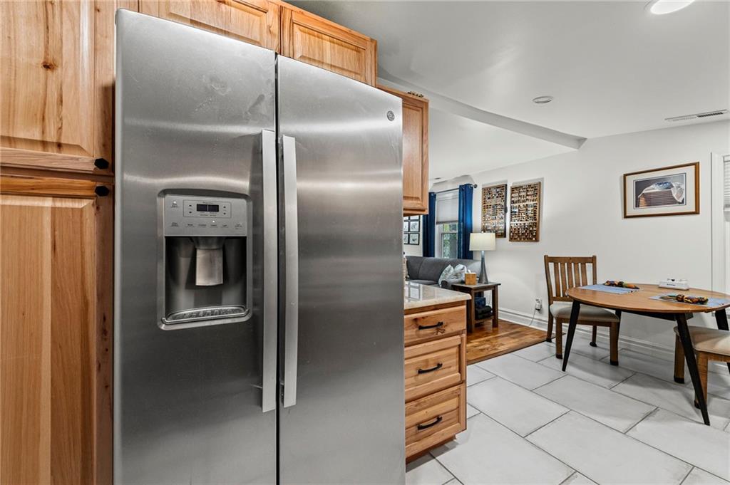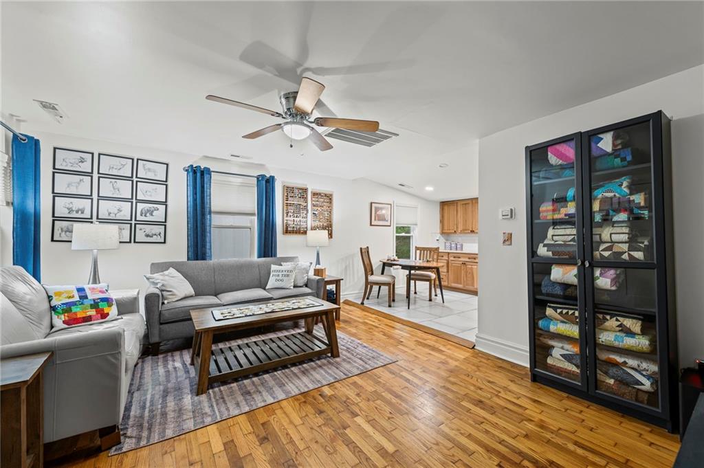 Inside, you’ll find warm hardwood floors and a bright living room that flows easily into the kitchen and dining area. The layout is functional and open, with natural light throughout and space that works well for both everyday living and hosting. The kitchen provides ample cabinetry and connects directly to the dining area for convenience.