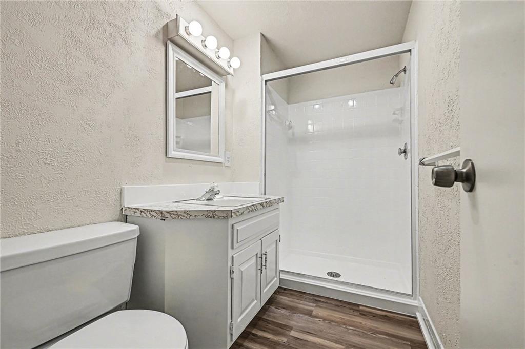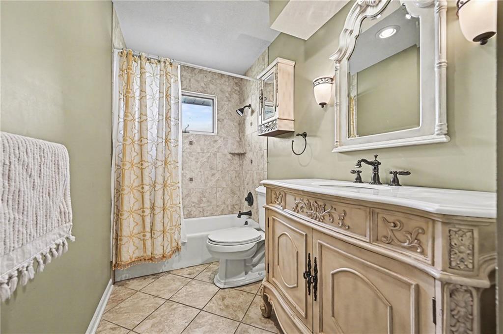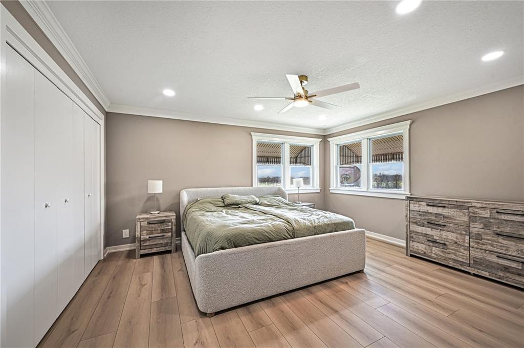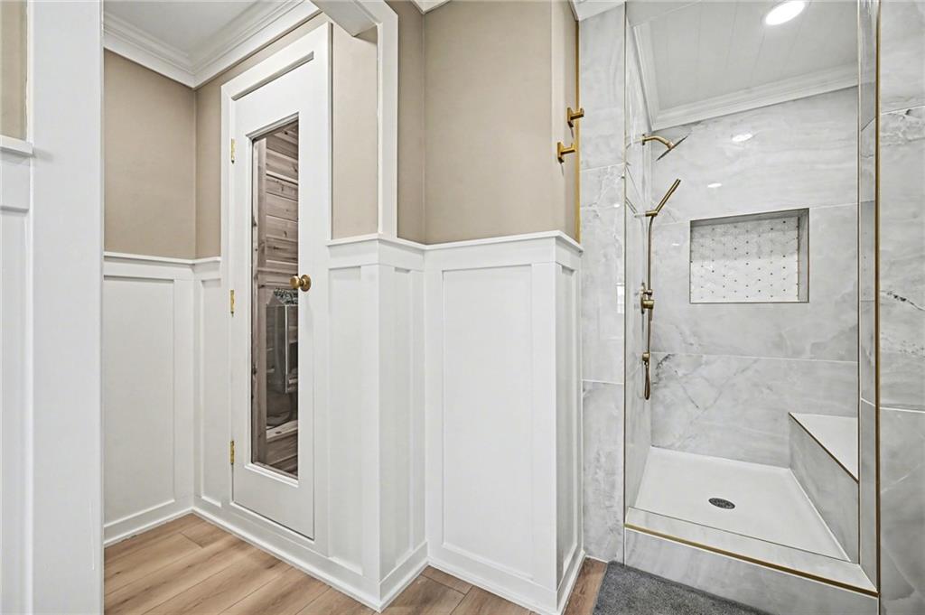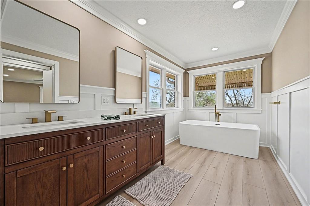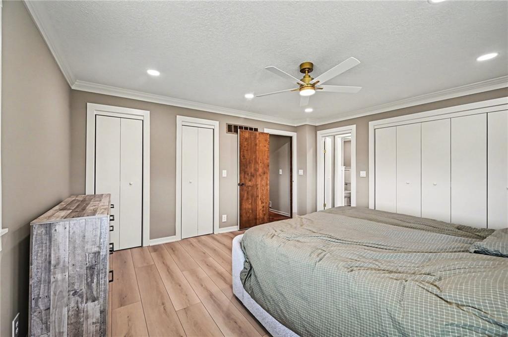 The spacious primary suite offers three closets and a luxurious bathroom complete with a soaking tub, separate shower, double sinks, and even a rare sauna. The main level also includes an additional bedroom and full bathroom, all carrying that same updated yet inviting style.