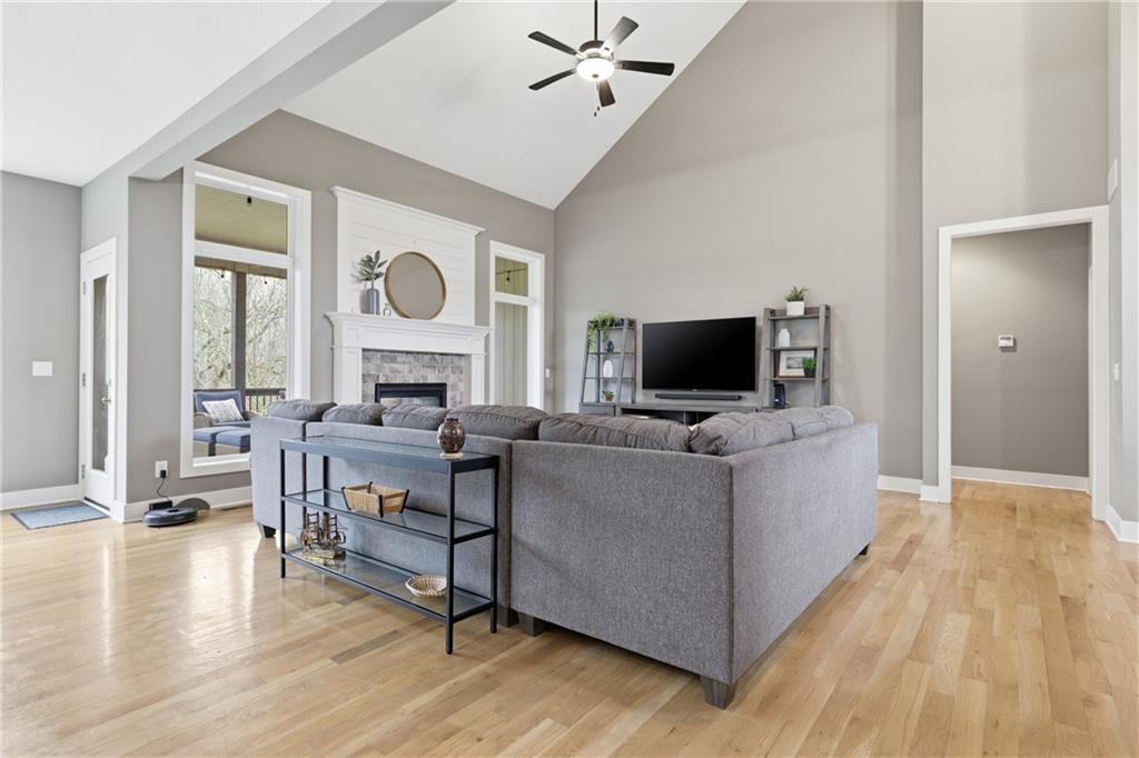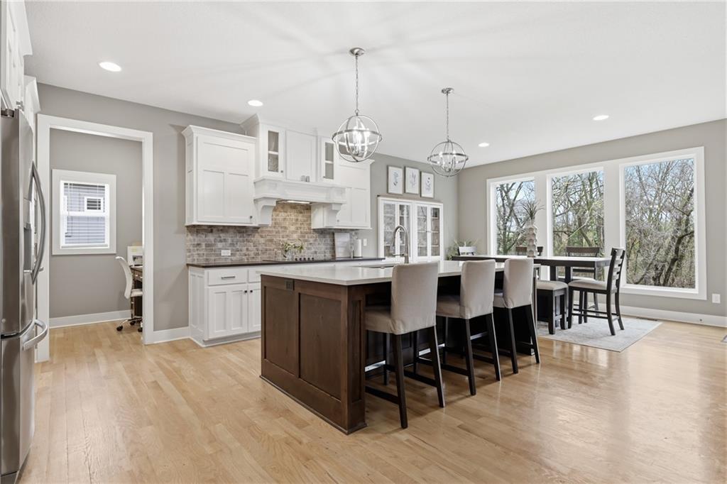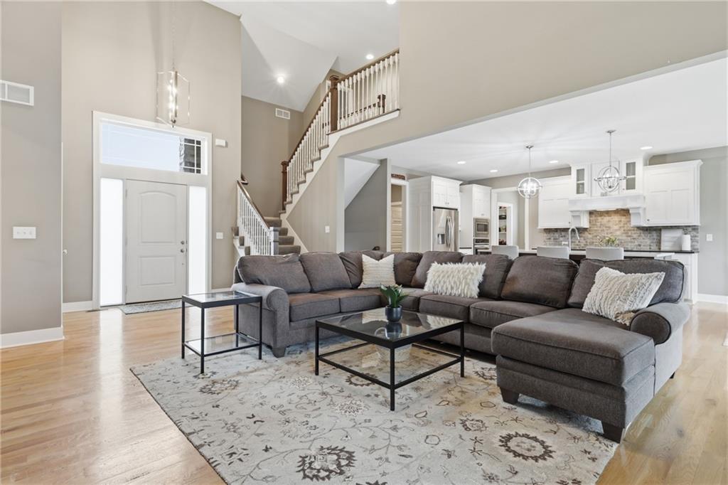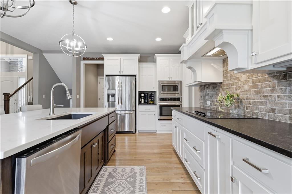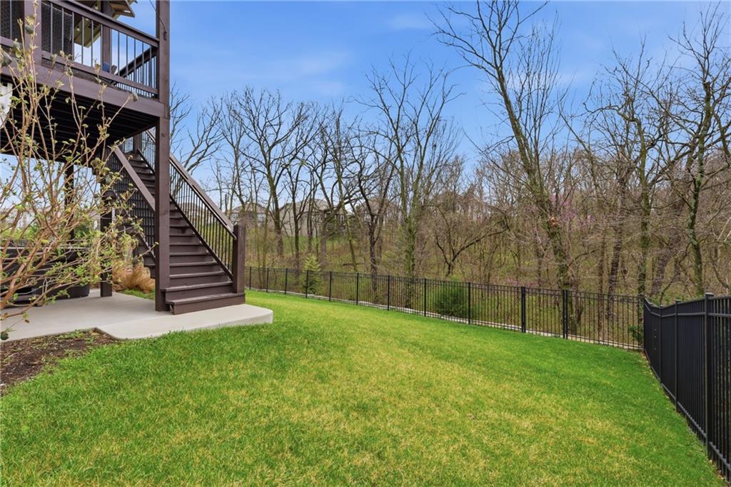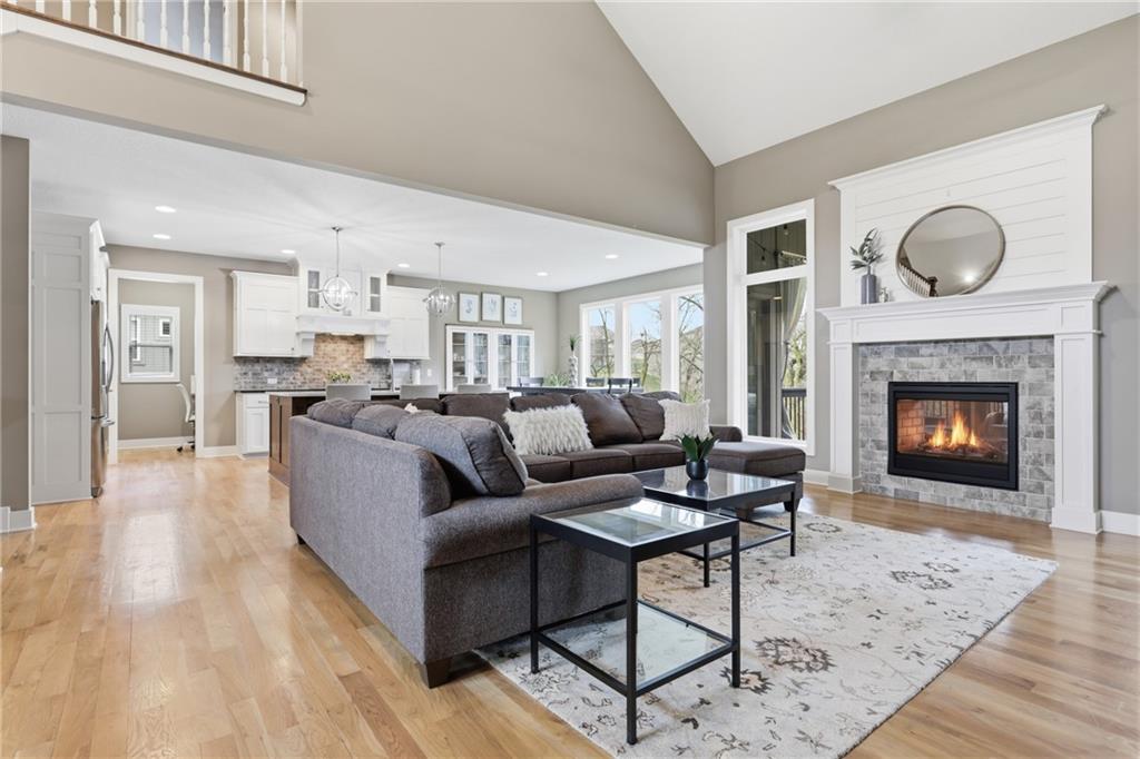 RARE 1.5 story, 5 br, 4 1/2 bath home in Chapel Ridge! Walk into soaring ceilings and windows with beautiful wooded views, light oak hardwood flooring, upgraded lighting, large stained island, upgraded vented hood, quartz and honed granite countertops, see-through gas fireplace from living to large outdoor covered deck, large pantry with pocket desk, large dining/eat-in kitchen. Primary suite with double vanity with tower storage, upgraded shower, and huge closet with conveniently attached laundry room. Upstairs has 3 large bedrooms all with walk-in closets, guest room with ensuite bath, and jack and jill bathroom with separate vanities. Beautifully finished walkout basement with huge rec room, 5th bedroom, full bathroom, wet bar with live edge wood/beverage fridge, ample unfinished storage, and under deck patio. Pristine 3 car garage, upgraded landscaping/retaining walls, metal fence. Come make it your dream home in highly sought after Chapel Ridge and Park Hill schools!