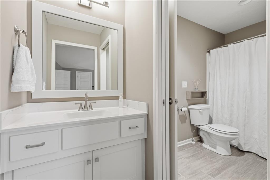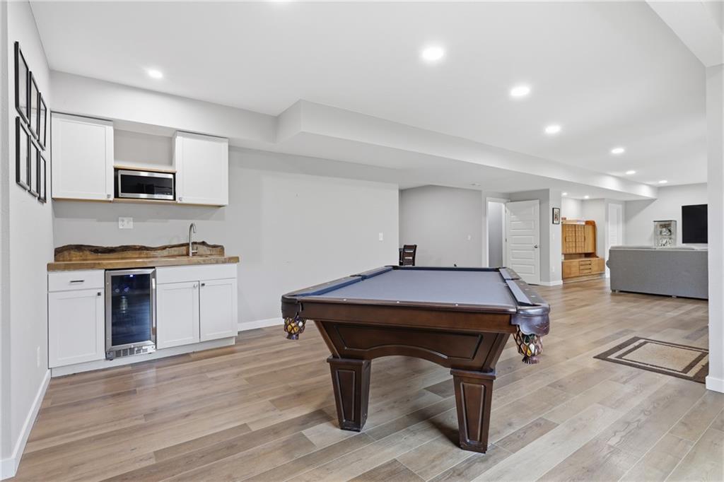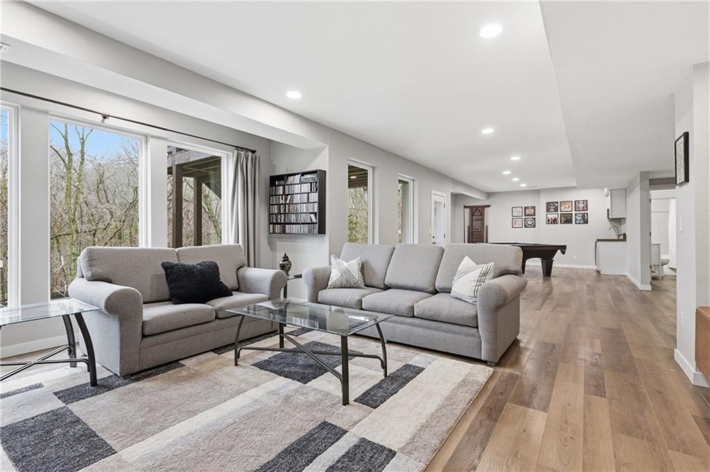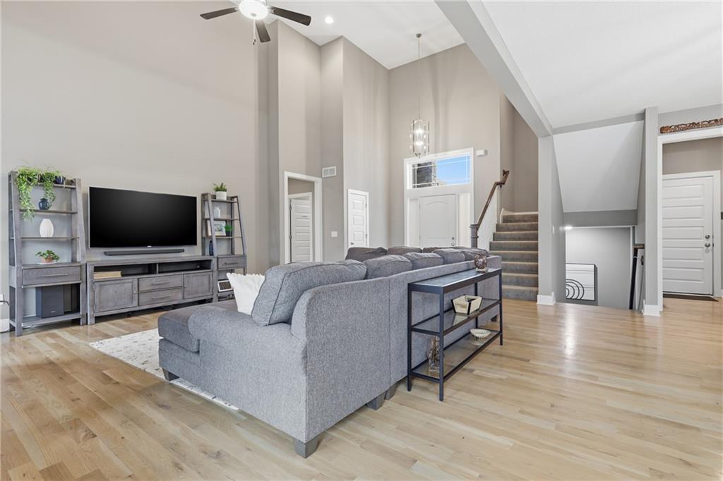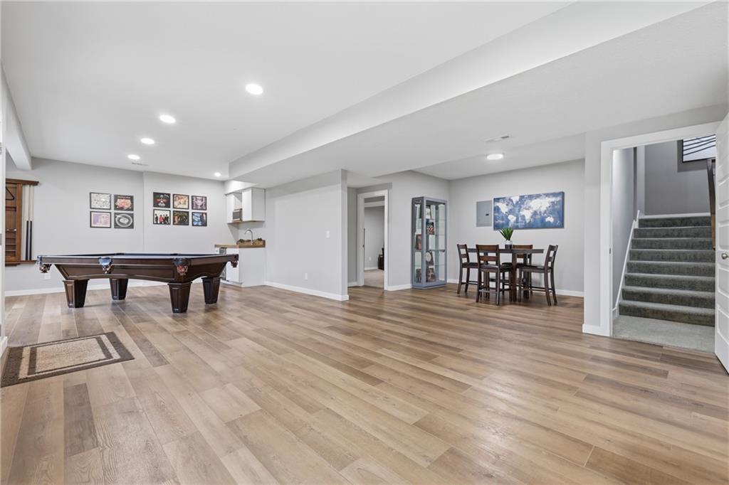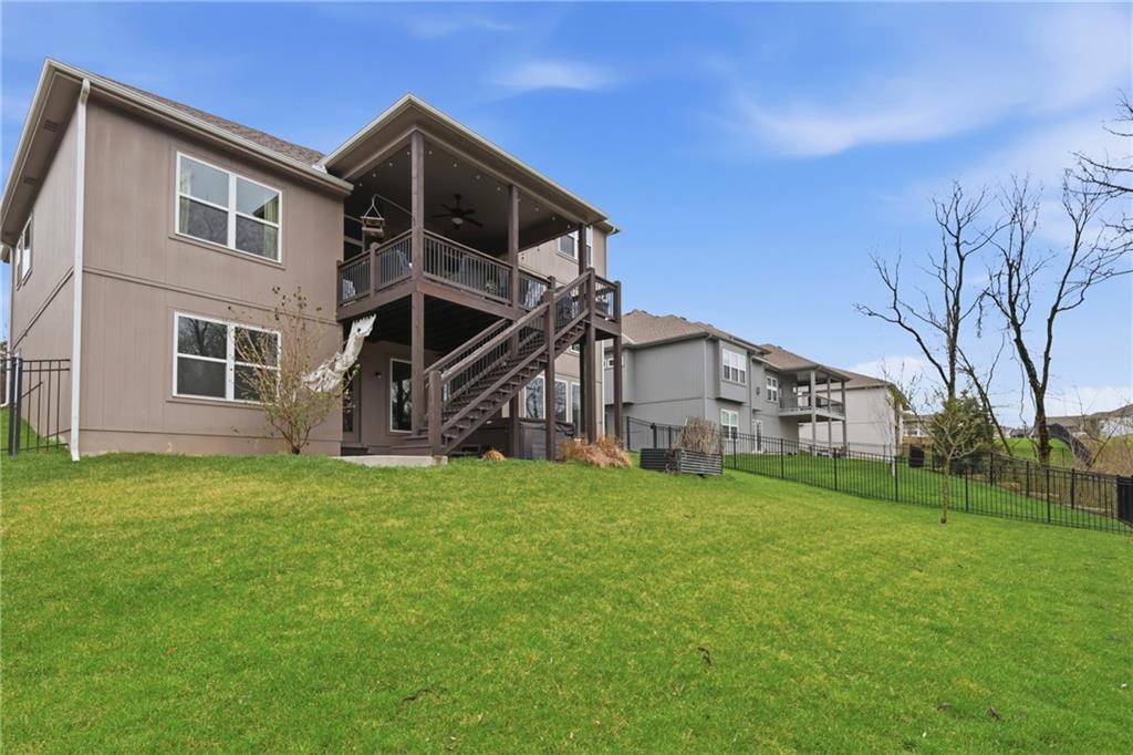 RARE 1.5 story, 5 br, 4 1/2 bath home in Chapel Ridge! Walk into soaring ceilings and windows with beautiful wooded views, light oak hardwood flooring, upgraded lighting, large stained island, upgraded vented hood, quartz and honed granite countertops, see-through gas fireplace from living to large outdoor covered deck, large pantry with pocket desk, large dining/eat-in kitchen. Primary suite with double vanity with tower storage, upgraded shower, and huge closet with conveniently attached laundry room. Upstairs has 3 large bedrooms all with walk-in closets, guest room with ensuite bath, and jack and jill bathroom with separate vanities. Beautifully finished walkout basement with huge rec room, 5th bedroom, full bathroom, wet bar with live edge wood/beverage fridge, ample unfinished storage, and under deck patio. Pristine 3 car garage, upgraded landscaping/retaining walls, metal fence. Come make it your dream home in highly sought after Chapel Ridge and Park Hill schools!