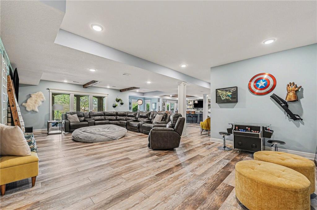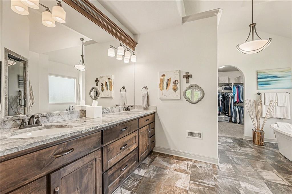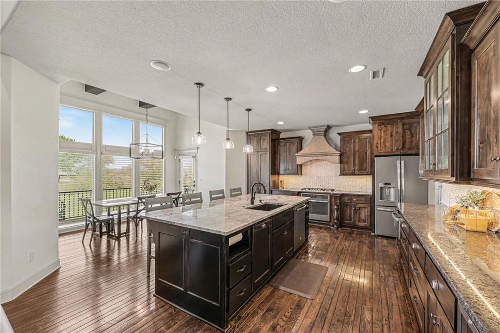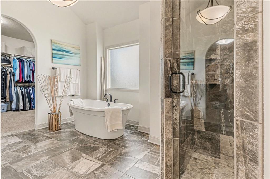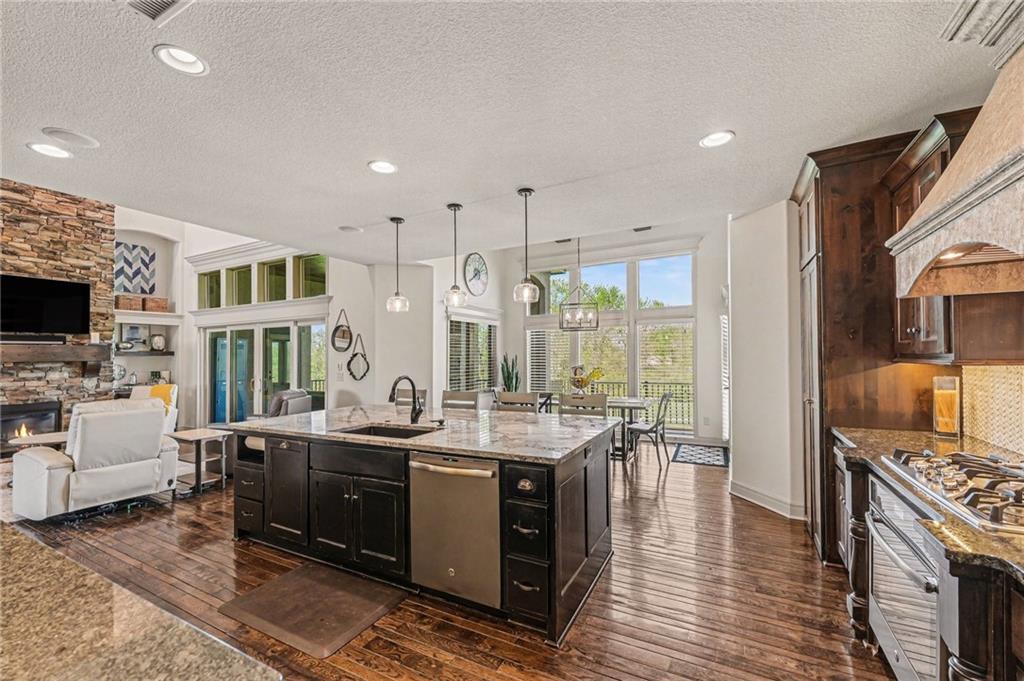 Rare, private 0.53-acre cul-de-sac lot backing to mature trees sets the stage for this custom-built 1.5-story home by Distinctive Homes in the sought-after Green Glades at The Masters. Designed for both everyday living and entertaining, the main level offers a spacious foyer with open sightlines and thoughtfully connected living spaces. A private office with French doors sits at the front of the home, while the formal dining room features a striking custom stone accent wall and flows seamlessly into the living room with a matching floor-to-ceiling stone fireplace. Large dual patio doors that fully open lead to a covered deck with an outdoor fireplace, creating an ideal space to enjoy the peaceful, private, tree-lined backyard. The kitchen includes a large island, granite countertops, gas range, custom vent hood, beverage fridge, and walk-in pantry, along with a second dining area overlooking the backyard. The primary suite offers a true retreat with a barrel ceiling, private access to the covered deck, and a spacious walk-in closet. The en-suite bath features heated tile floors, a soaking tub, walk-in shower, and dual vanities. Upstairs, each bedroom includes its own en-suite bath and walk-in closet. The upper level also features a loft space with a hidden bookcase door, a wet bar area, and an additional laundry option. The newly finished lower level is ideal for entertaining, complete with a large island, full wet bar, and expansive living space, along with two large storage areas. Additional features include a four-car garage, a suspended garage with exterior access ideal for a golf cart or additional storage, a drop zone off the garage, and multiple flexible living spaces throughout the home. Located in the highly regarded Park Hill School District.