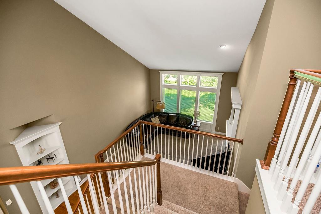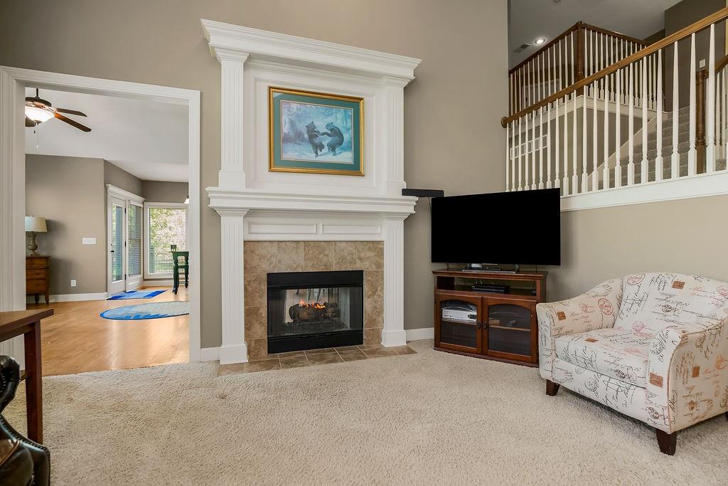 Beautiful 1 1/2 story home offers an exceptional floor plan, Dramatic open foyer has cathedral ceilings that flows into the Great room, offering a beautiful see through fireplace, full of natural light with floor to ceiling windows that carry throughout the home, Master suite on Main floor, offers his and her vanities, double entry shower with 2 shower heads, large luxurious tub, flows right into master large walk in closet with built ins. style Kitchen and large Hearth room has floor to ceiling windows, see through fireplace, beautiful Granite countertops, large Island with built-in cooktop and seating, large walk -in pantry, built-in desk in kitchen, open to back deck, great for outdoor entertaining, main floor laundry room with built- ins and 1/2 bath. Double entry from kitchen and entry foyer to 2nd level where there is an open area with built in desk and drawers, has 3 large bedrooms, a bonus room, jack n Jill bath with 2 separate vanity rooms, 3rd bedroom has private full bathroom. The basement is open the full size of home, has an egress window, and very tall ceilings used now as game room and work out room, could be finished out for a 5 the bedroom, media room, whatever you can vision. Has Zoned HVAC, 1 of the systems newer. Back yard is fenced, in ground lawn sprinklers, home has new roof. Very close to community private pool, walking trails, and a small lake.