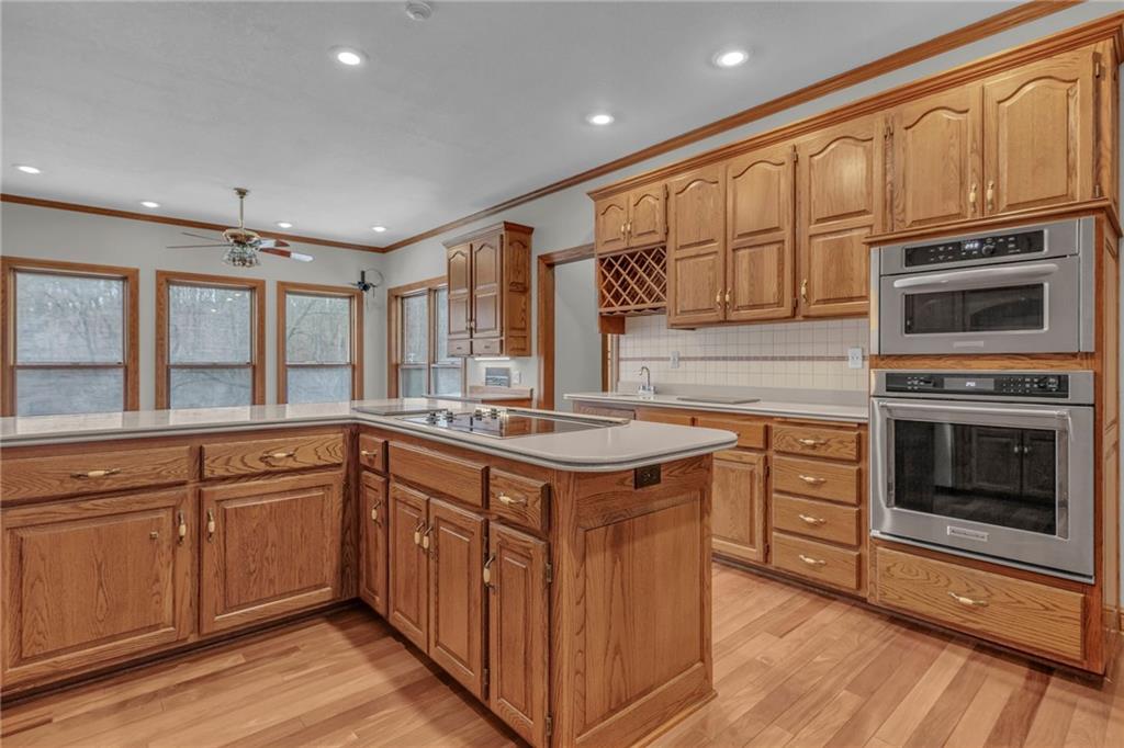 entryway, hallway and kitchen. The chef’s kitchen is a highlight, featuring custom-built cabinets, an eat-in dining area,