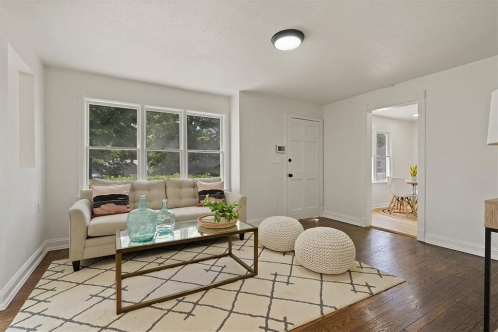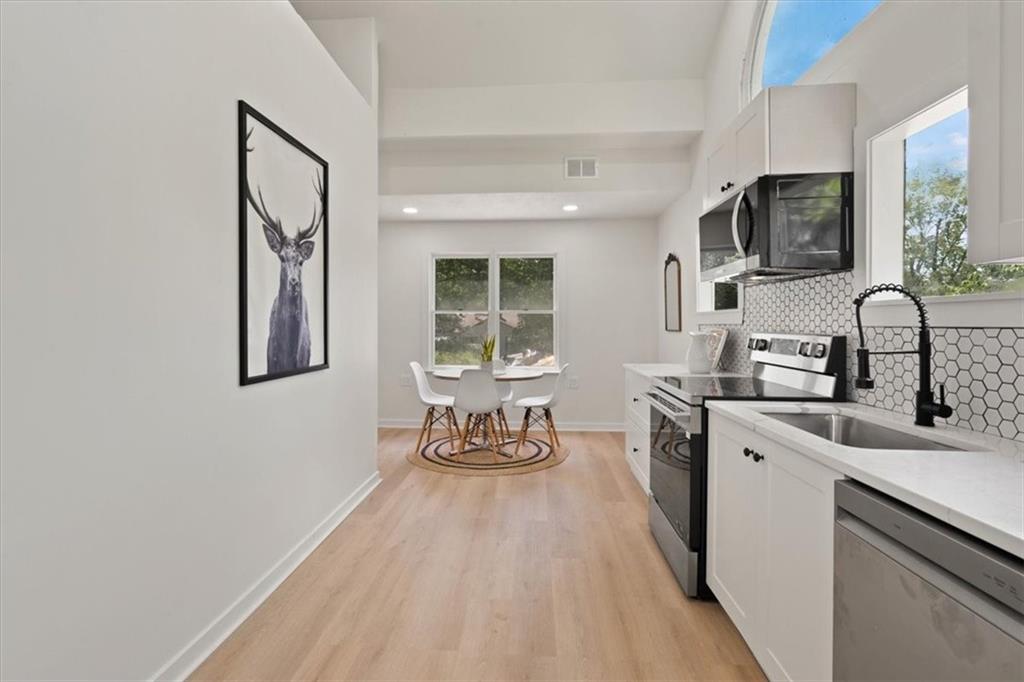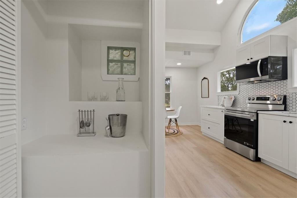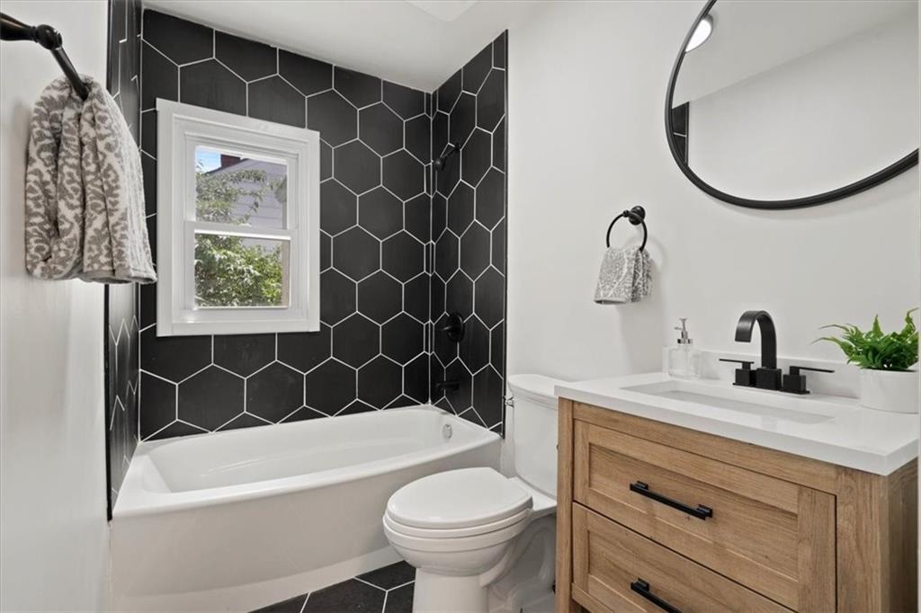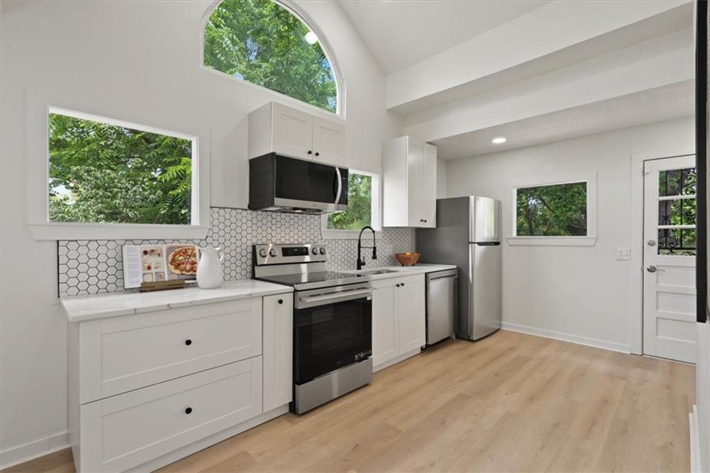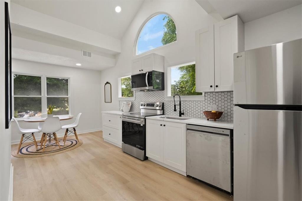 Step inside to find refinished hardwood floors, fresh paint, and a bright living area that flows seamlessly into the dining space and updated kitchen. The kitchen features quartz countertops, stainless steel appliances, custom cabinetry, a hex-tile backsplash, and vaulted ceilings with arched windows that add character and charm.
