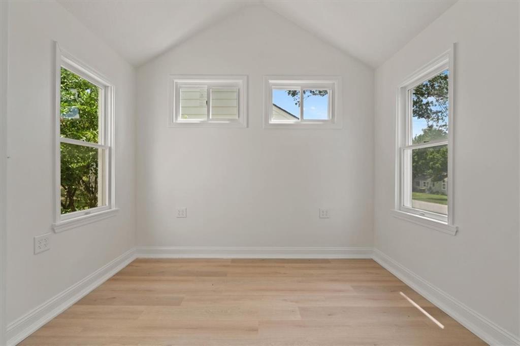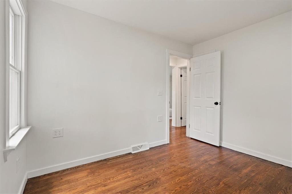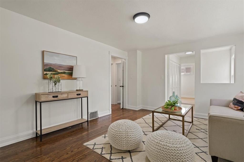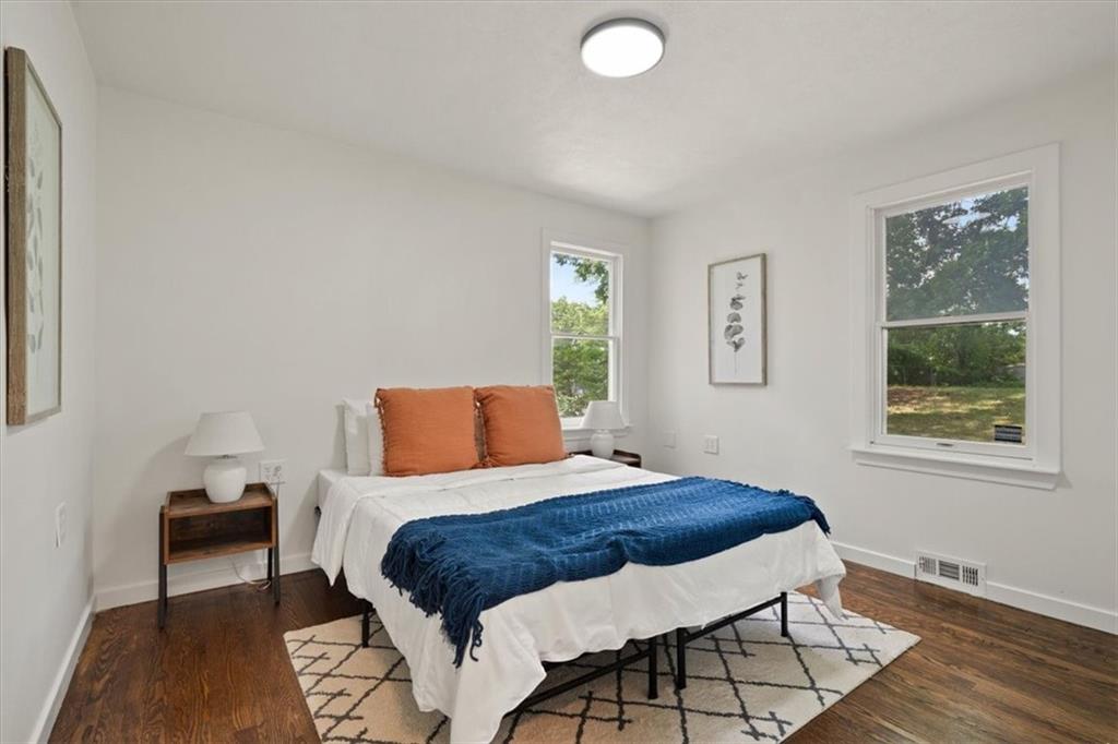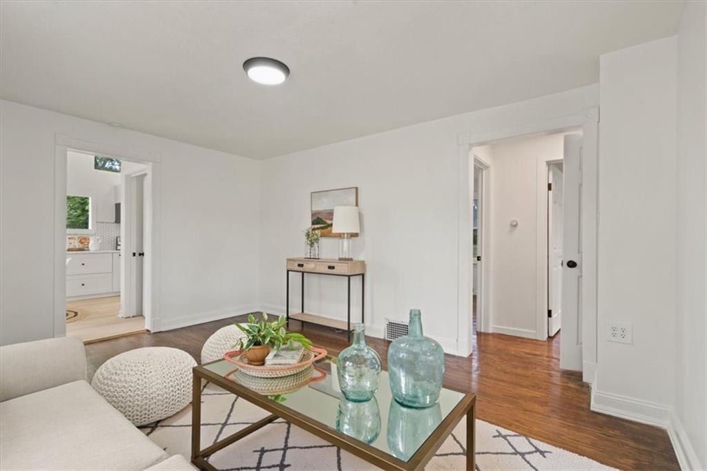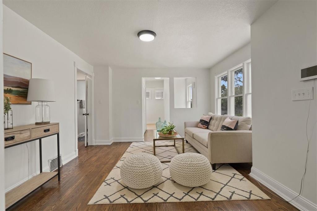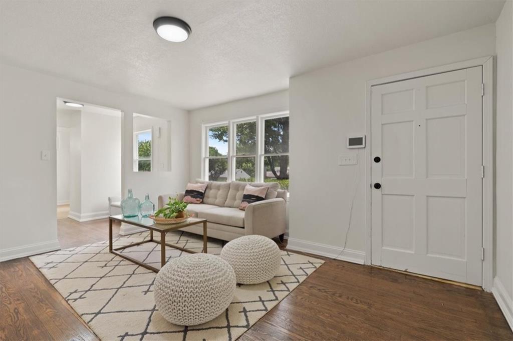 Step inside to find refinished hardwood floors, fresh paint, and a bright living area that flows seamlessly into the dining space and updated kitchen. The kitchen features quartz countertops, stainless steel appliances, custom cabinetry, a hex-tile backsplash, and vaulted ceilings with arched windows that add character and charm.
