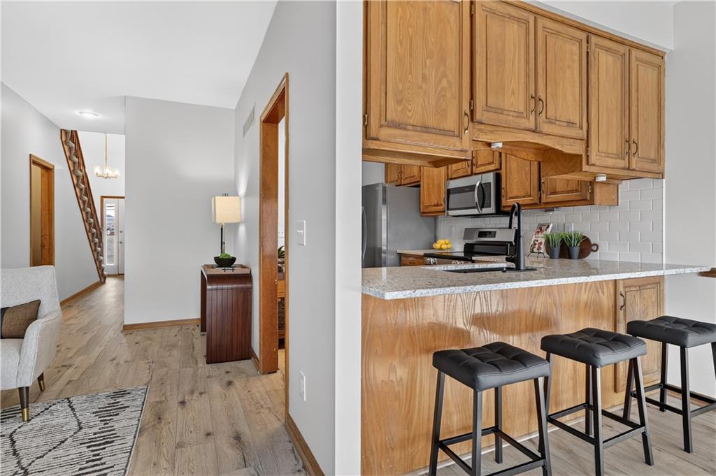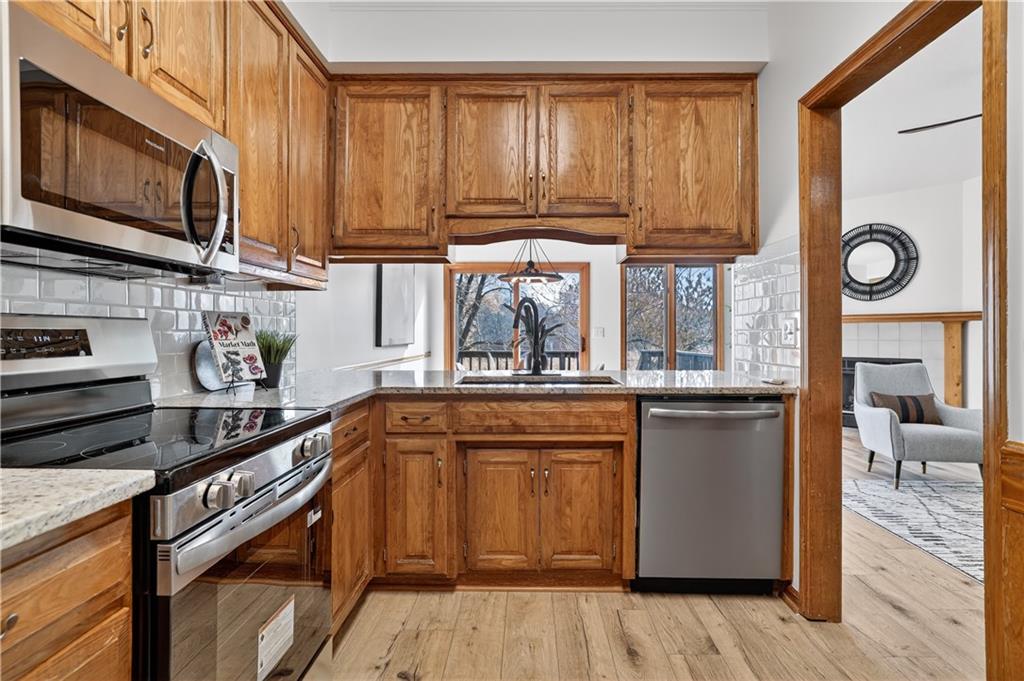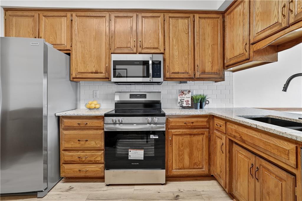 The kitchen shines with new countertops, backsplash, new appliances, new flooring and updated light fixtures. Bathrooms feature new toilets and flooring—everything is fresh and move-in ready.