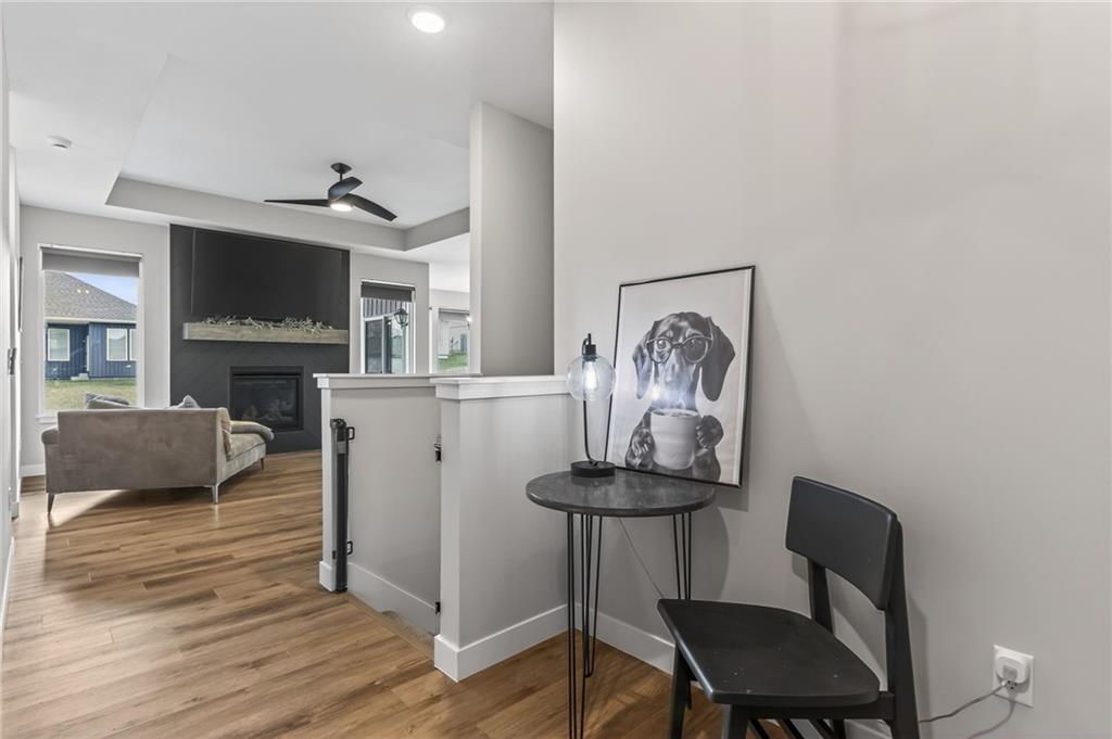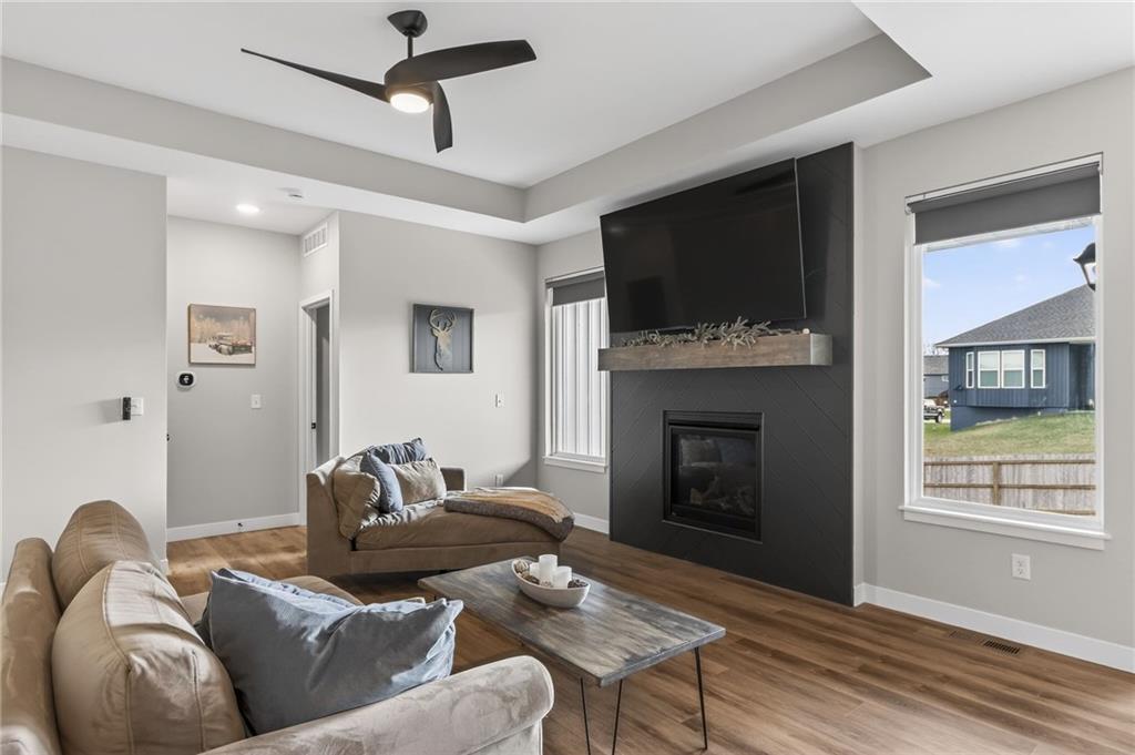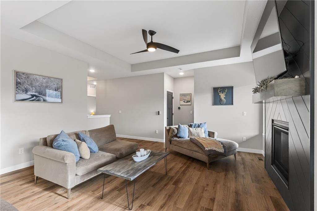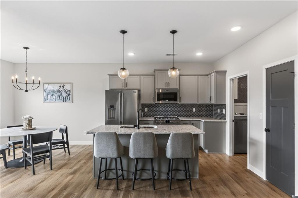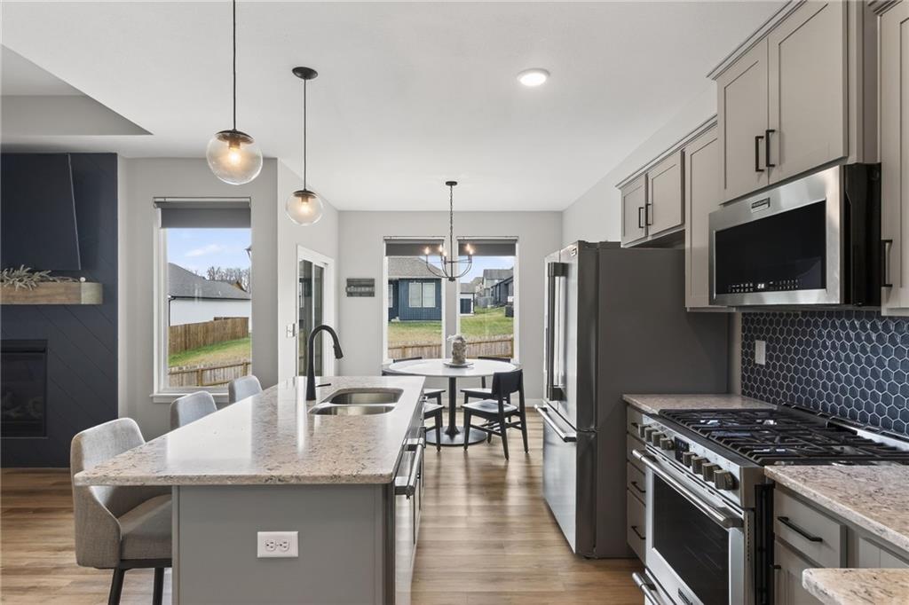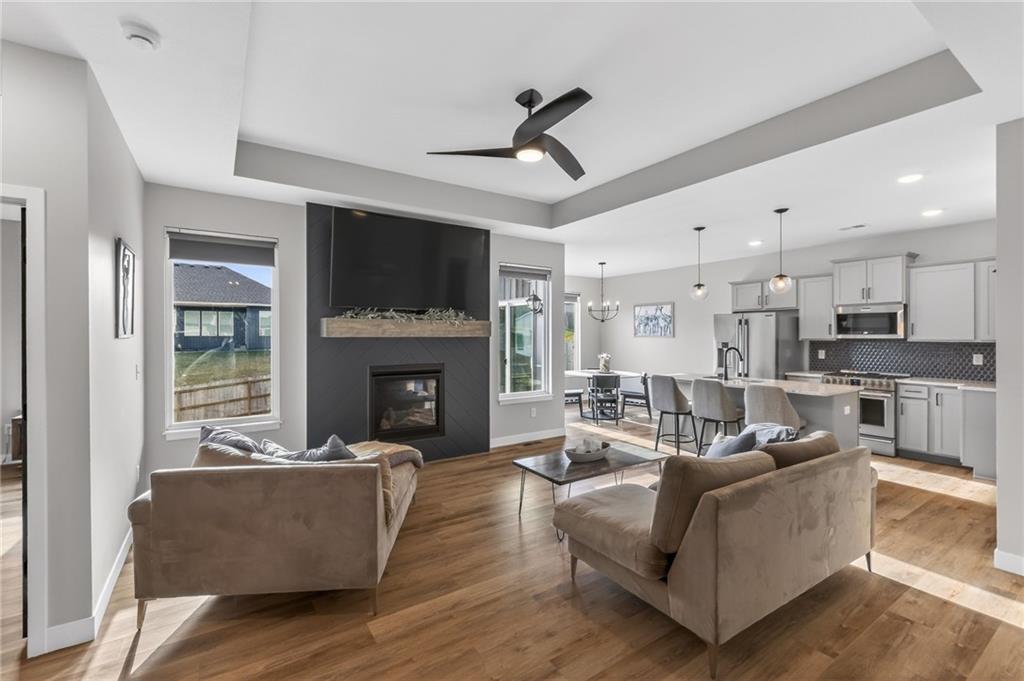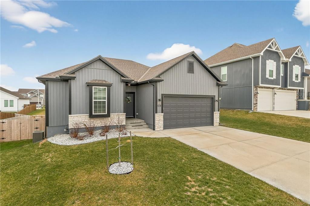 Three bedrooms upstairs in this new ranch, a 4th bed and bathroom downstairs. All high end LVP flooring on both levels. Smart finish upgrades. The walls have the smooth, pure look of fresh flat paint but it’s a very high-end wipeable matte. Other choices that set this nearly new house apart are the extended rear porch slab, the high grade of appliances (gas range included, air fryer option in both microwave and oven), the door slab accent color, the wainscot and tile accent wall in the mudroom/laundry room, and two charging receptacles in the garage for EVs. Backyard is fully fenced. Come see a rare ‘bedrooms up’ ranch with a near zero maintenance exterior and an upgraded kitchen. Quiet neighborhood connects to the Line Creek trail system. Quick access to hwys between I-29 and 169 make this house ideal for errands or commuters. Other upgrades: Smart blinds in master and common areas, all installed blinds match style. Natural gas quick connect line for the covered porch, sturdier panty shelving, higher grade quartz selection on counter tops throughout, tile bathrooms. And of course, the finished rec-room, bathroom and day-lit bedroom in basement. Walk in pantry, walk in closets upstairs and down.