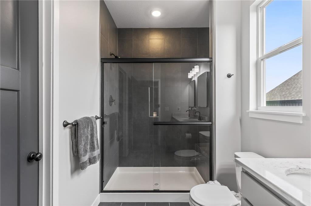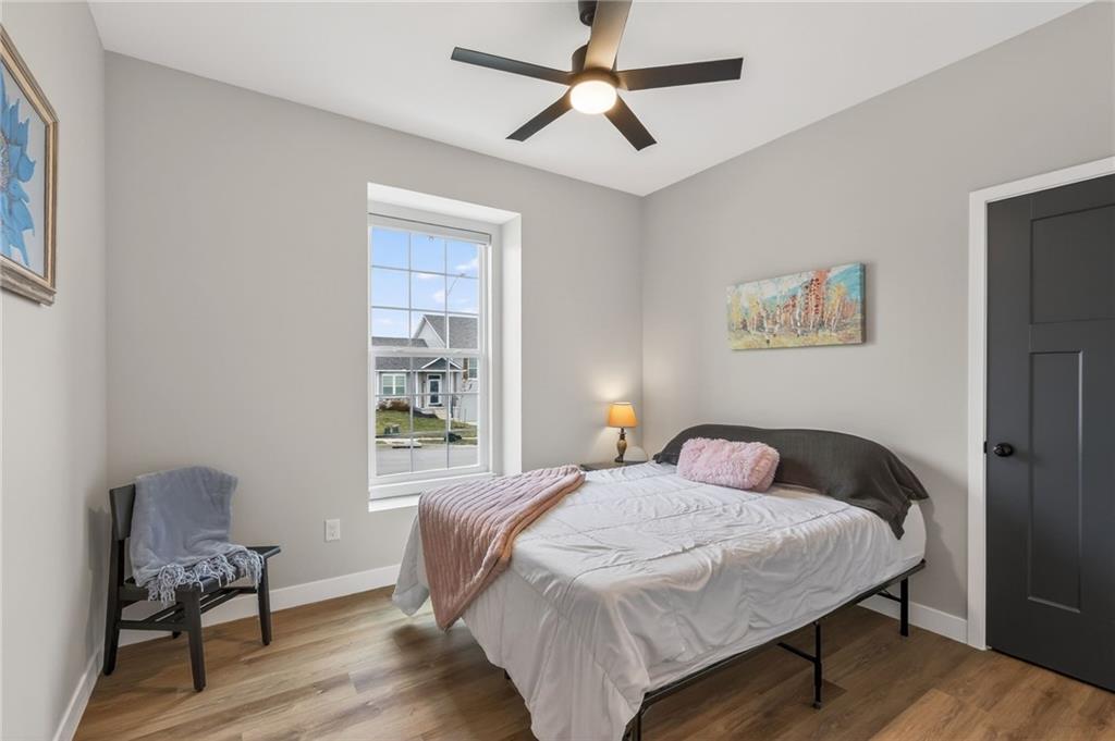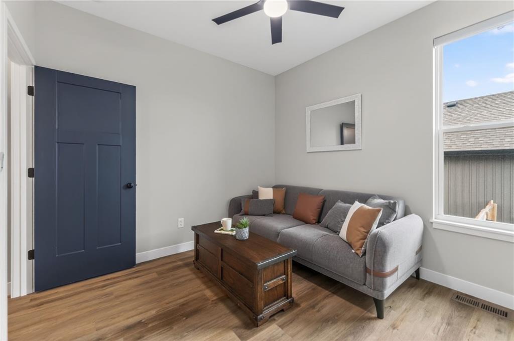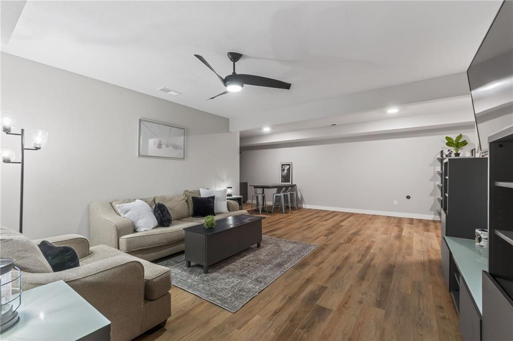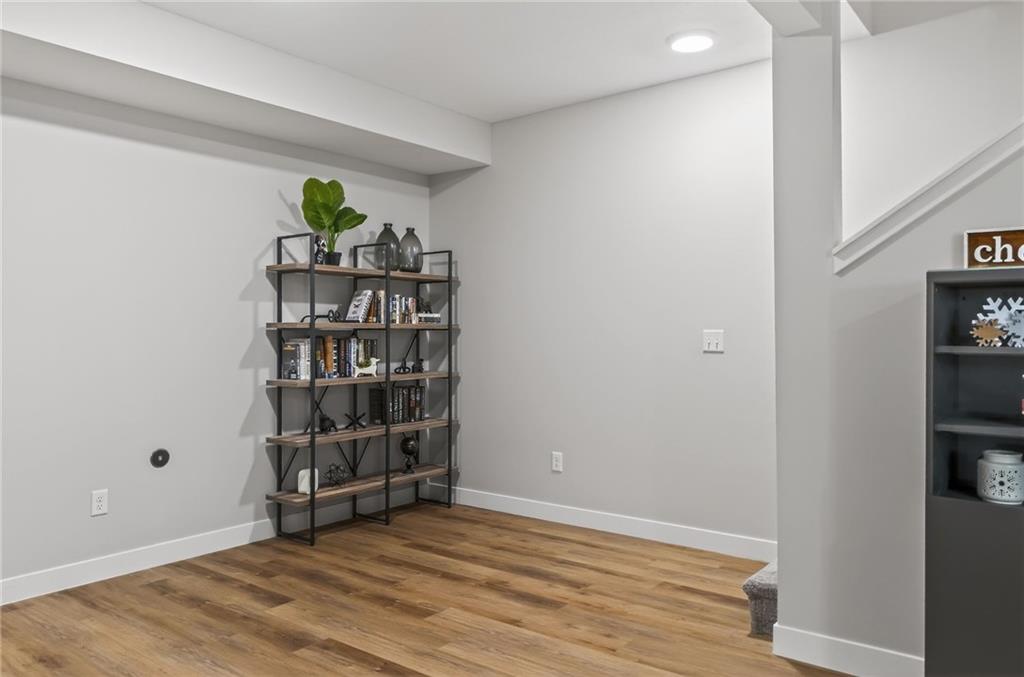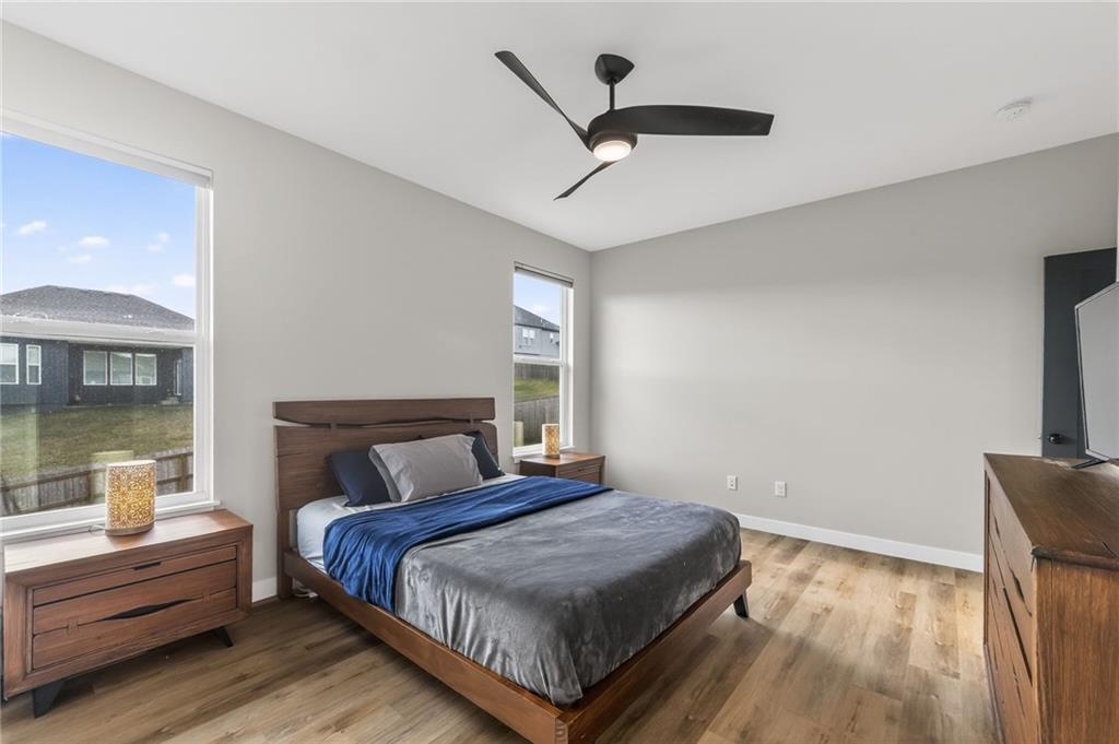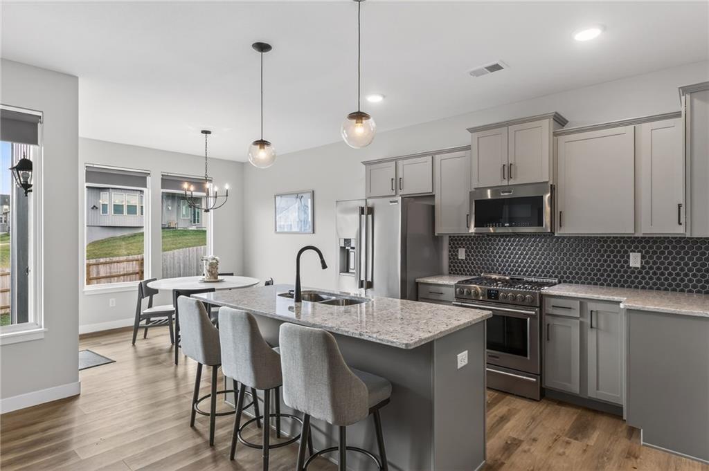 Three bedrooms upstairs in this new ranch, a 4th bed and bathroom downstairs. All high end LVP flooring on both levels. Smart finish upgrades. The walls have the smooth, pure look of fresh flat paint but it’s a very high-end wipeable matte. Other choices that set this nearly new house apart are the extended rear porch slab, the high grade of appliances (gas range included, air fryer option in both microwave and oven), the door slab accent color, the wainscot and tile accent wall in the mudroom/laundry room, and two charging receptacles in the garage for EVs. Backyard is fully fenced. Come see a rare ‘bedrooms up’ ranch with a near zero maintenance exterior and an upgraded kitchen. Quiet neighborhood connects to the Line Creek trail system. Quick access to hwys between I-29 and 169 make this house ideal for errands or commuters. Other upgrades: Smart blinds in master and common areas, all installed blinds match style. Natural gas quick connect line for the covered porch, sturdier panty shelving, higher grade quartz selection on counter tops throughout, tile bathrooms. And of course, the finished rec-room, bathroom and day-lit bedroom in basement. Walk in pantry, walk in closets upstairs and down.