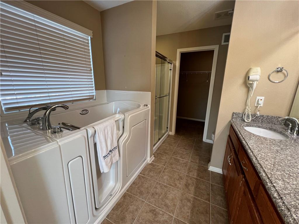 The primary suite is a standout, offering a walk-in bathtub and a separate shower for ultimate comfort and accessibility.