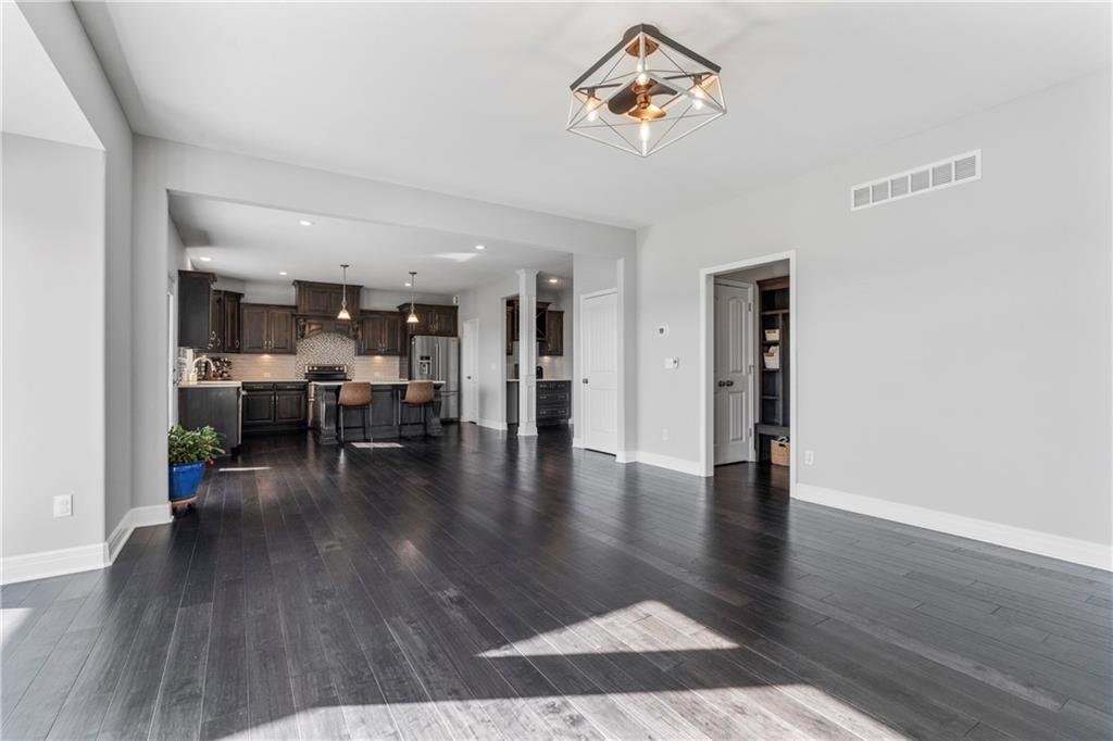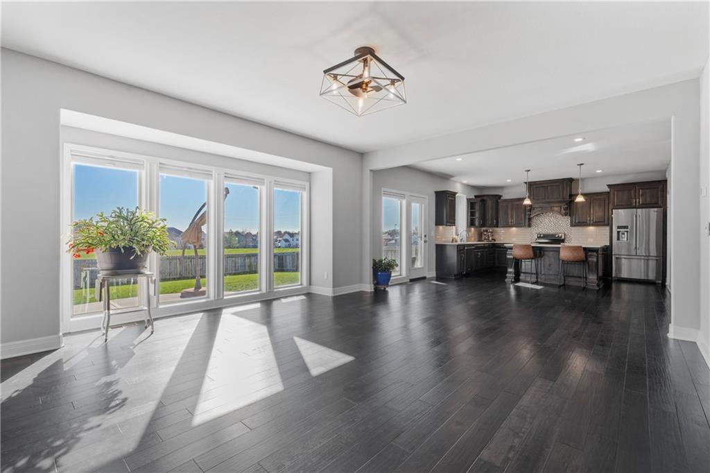 Inside, enjoy hardwood floors throughout the living room, quartz countertops, new light fixtures in the living and dining rooms, new dishwasher, new refrigerator, and new microwave (all replaced in 2024, receipts attached). A spacious Great Room with abundant natural lighting. The layout includes a convenient laundry room off the primary suite, which features a soaker tub, tiled shower, and a generous walk-in closet.
