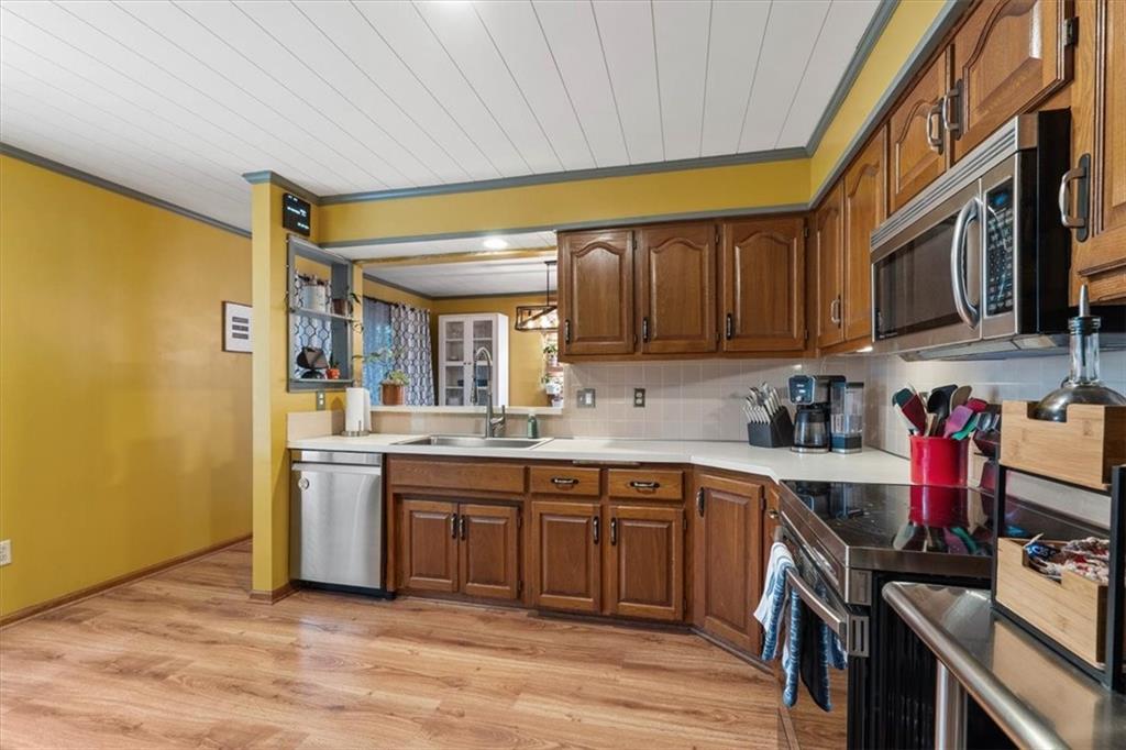 Welcome to Highland View! 3 BR, 3.5 ba, 1900+ sqft home on wooded lot. Less than a block to Highland View Park with neighborhood walking trail. Vaulted ceiling living room with skylight and fireplace with new liner installed in 2020. Great circular flow with must see plant display wall in dining room. Fun shiplap ceiling in kitchen, dining, hall, and laundry rooms. Three bedrooms upstairs (including primary en-suite with more vaulted ceilings). Carpet on second level and living room (recent professional cleaning) Extensive updates done in 2020 including finishing out the lower level (LVP floors) with a walkout to a patio under the deck, new bathroom, and wood burning insert in the 2nd working fireplace. Open space for office, den, and/or 4th bedroom. It even has a stainless utility sink just inside slider doors for easy plant repotting and/or smaller dog wash station. Water heater changed in 2020 as well. Furnace is 2 yo and AC is 8 yo (and serviced annually entire time of ownership. Smart home (Nest thermostat, ring doorbell, keypad locks on front door and garage entry door, and lots of smart switches throughout the house); plus a central vacuum system. Brand new garage door on order and will be installed prior to closing. Freshly painted exterior. Back deck overlooking wooded lot. Established neighborhood just minutes from Barry Rd and Hwy 169.