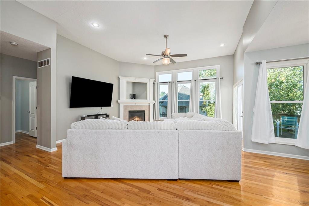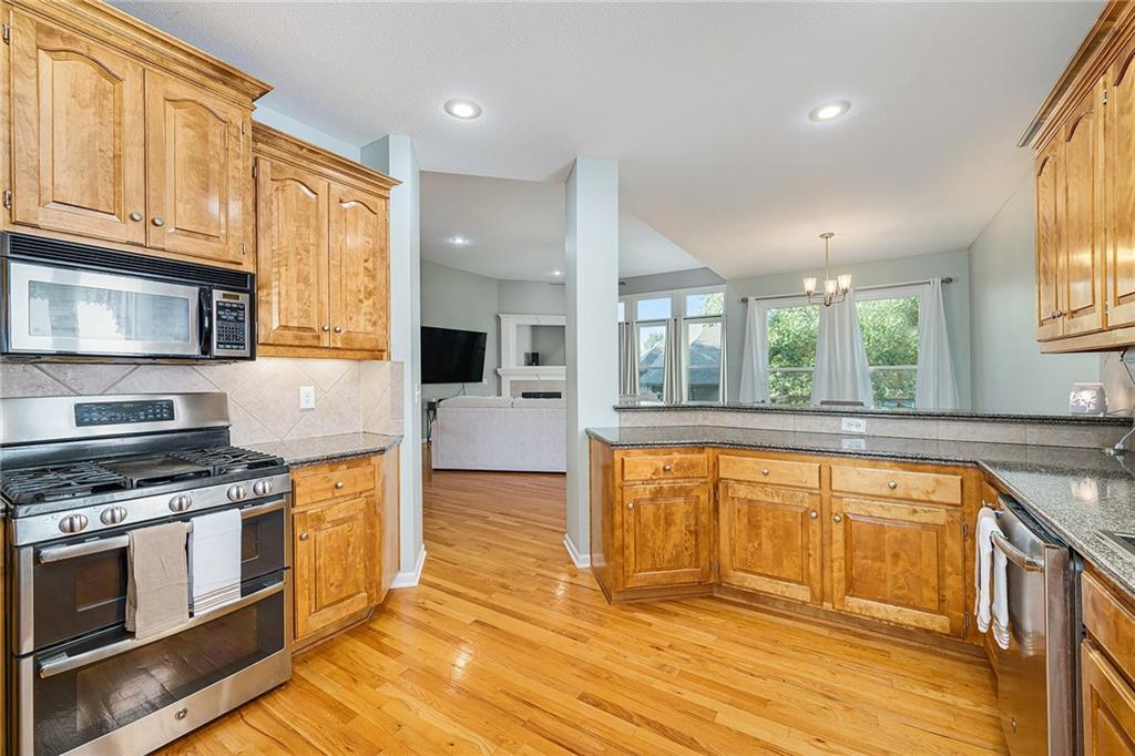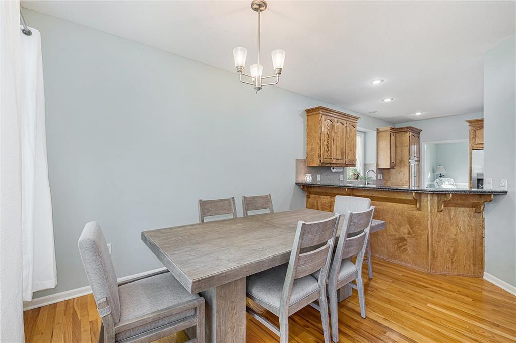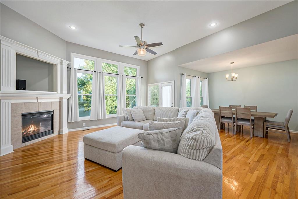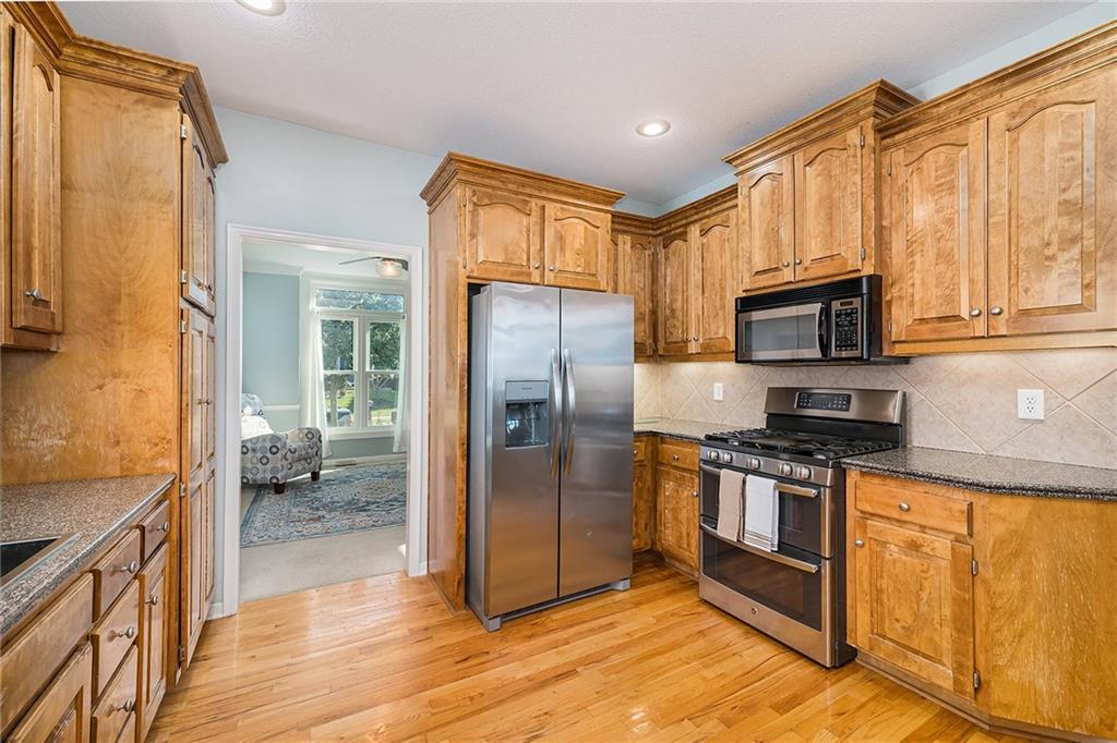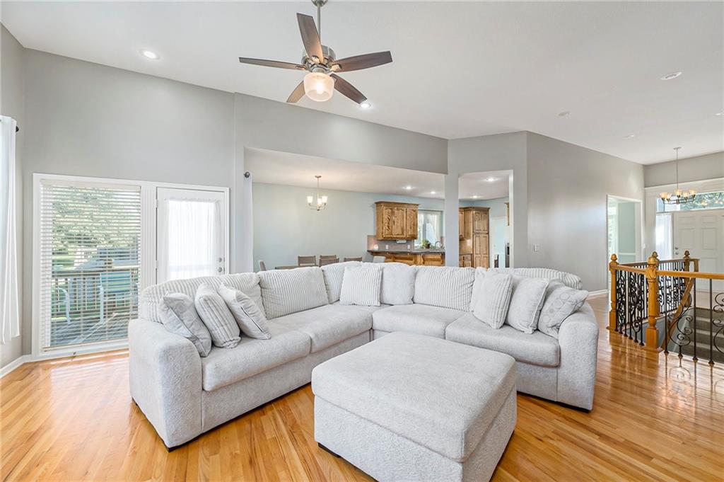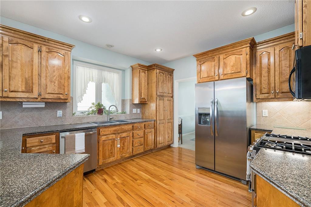 3 bedroom, 3 bath reverse 1.5 story home in Pembrooke Estates. Walk into a spacious foyer that opens to a dining room. Dining room leads to an open kitchen with hardwood floors, stainless steel appliances including refrigerator, gas stove, dishwasher, & microwave. Second dining space and a large living room with fireplace walk out onto a deck overlooking the back yard. Primary bedroom with en-suite. En-suite complete with dual vanities, walk-in closet, whirlpool tub, & walk-in shower. 1/2 bath & laundry room finish out main level. Lower-level hosts a large rec room perfect for a second entertaining space, 2 additional bedrooms both with walk-in closets, 2 full bathrooms, & a large storage space. Lower level patio. 3 car garage. North Kansas City School District.