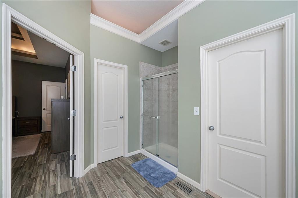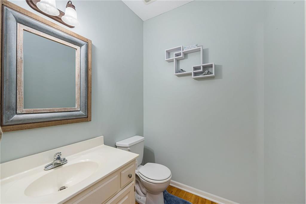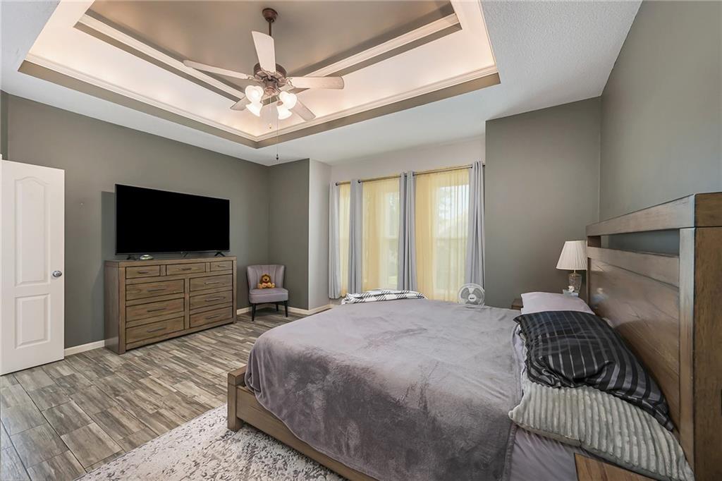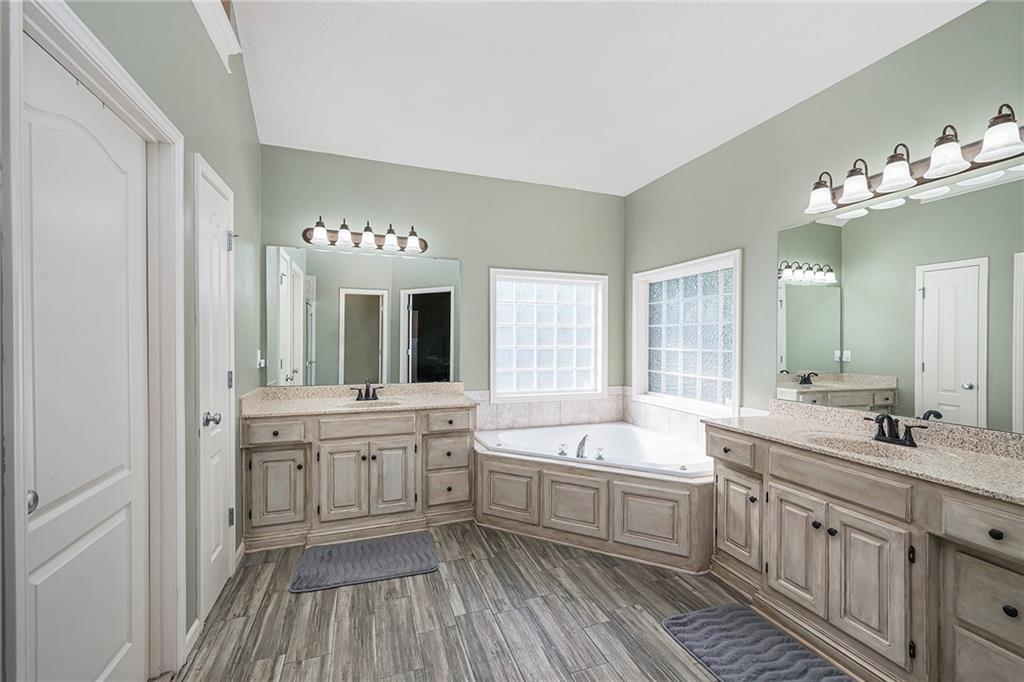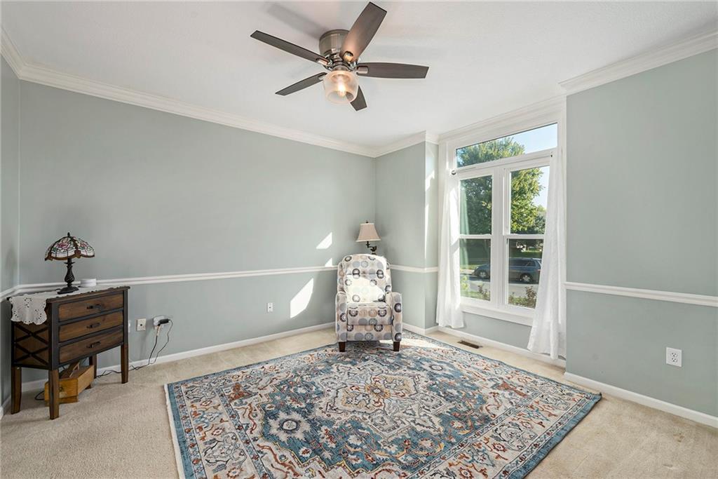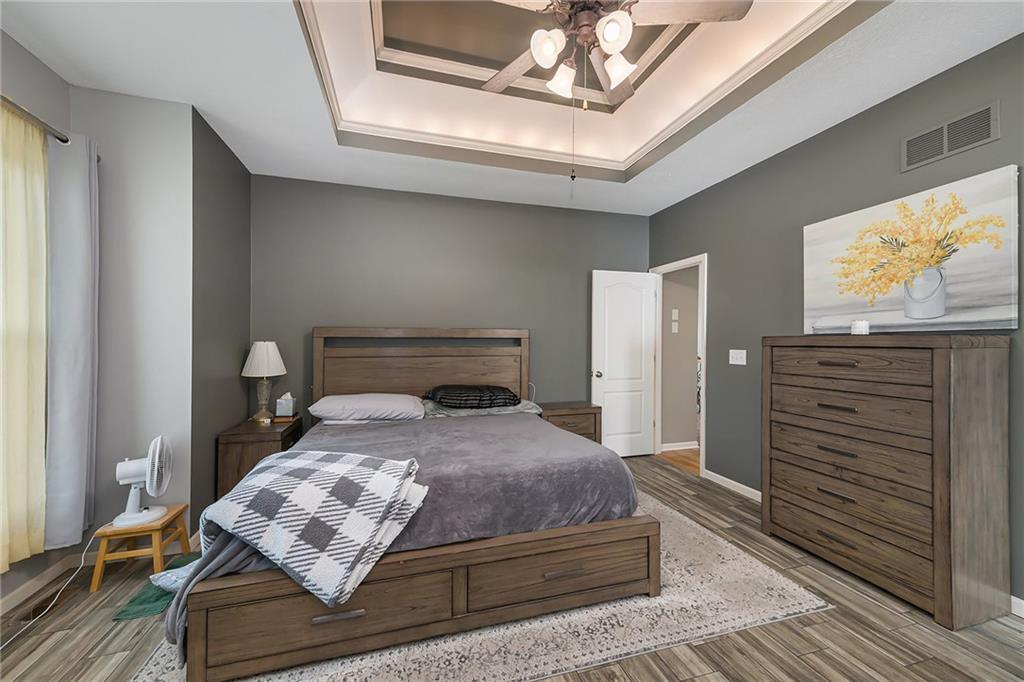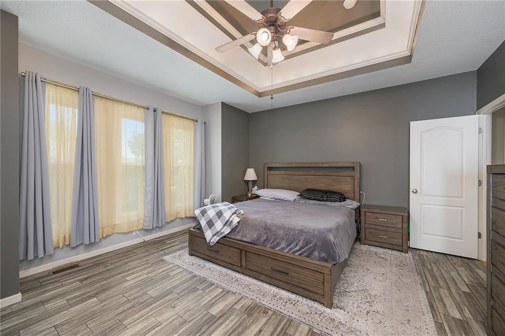 3 bedroom, 3 bath reverse 1.5 story home in Pembrooke Estates. Walk into a spacious foyer that opens to a dining room. Dining room leads to an open kitchen with hardwood floors, stainless steel appliances including refrigerator, gas stove, dishwasher, & microwave. Second dining space and a large living room with fireplace walk out onto a deck overlooking the back yard. Primary bedroom with en-suite. En-suite complete with dual vanities, walk-in closet, whirlpool tub, & walk-in shower. 1/2 bath & laundry room finish out main level. Lower-level hosts a large rec room perfect for a second entertaining space, 2 additional bedrooms both with walk-in closets, 2 full bathrooms, & a large storage space. Lower level patio. 3 car garage. North Kansas City School District.