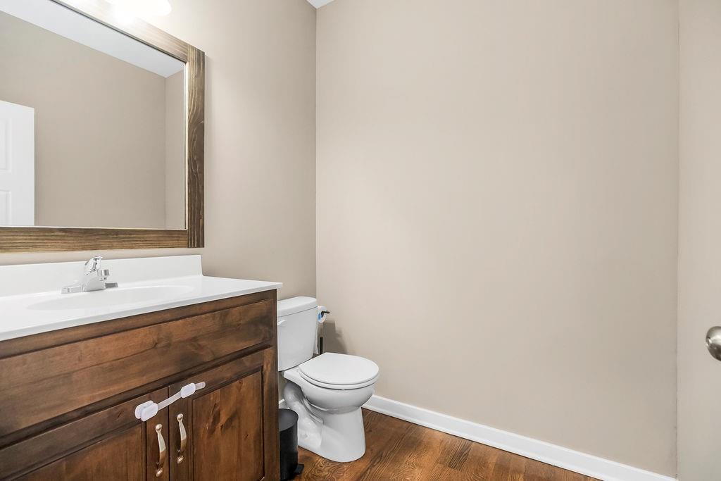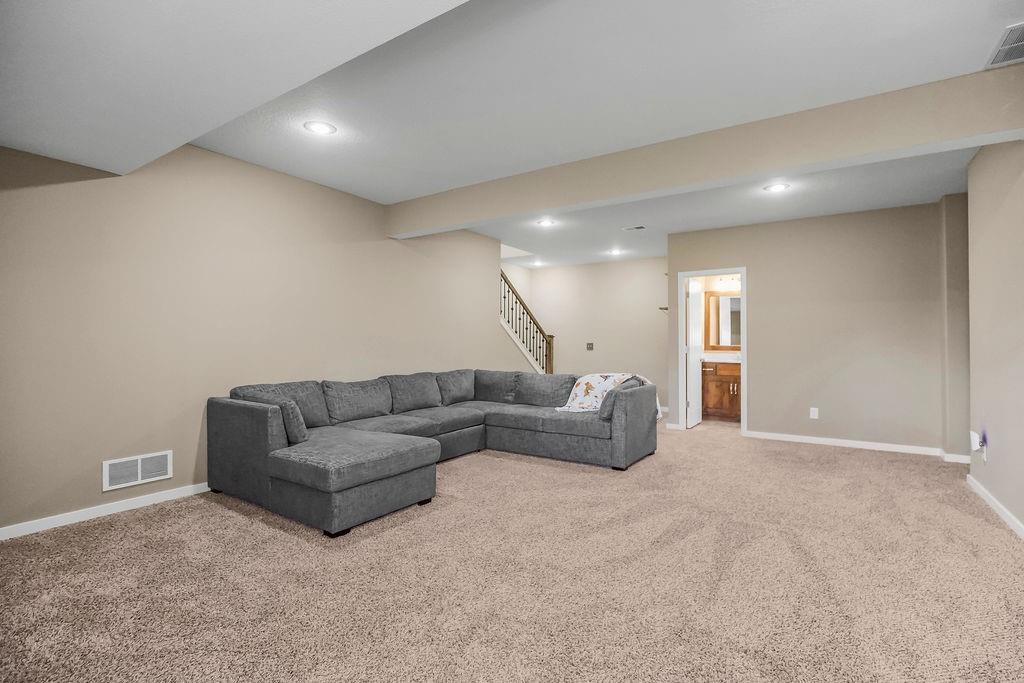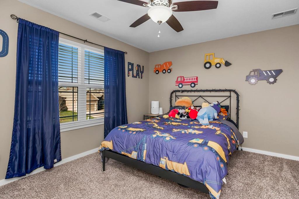 Welcome to this beautiful 2-story home in the desirable Trails of Brentwood subdivision. The main level offers an open-concept layout with carpeted living room anchored by a cozy fireplace. The spacious kitchen features hardwood floors, granite countertops, a large island, modern stainless steel appliances, and easy access to the new composite deck, making it perfect for gatherings. Upstairs, all bedrooms are conveniently located together along with the laundry room which includes additional storage. The large primary suite features a walk-in closet and a private bath with a double vanity and separate water closet. The finished basement offers plush carpet, a full bath, and plenty of extra storage. Off the garage, you will also find a drop zone and an additional half bath that add everyday convenience for busy households. Located close to schools, shopping, and major highways within the Liberty School District, this home blends comfort, functionality, and modern living.