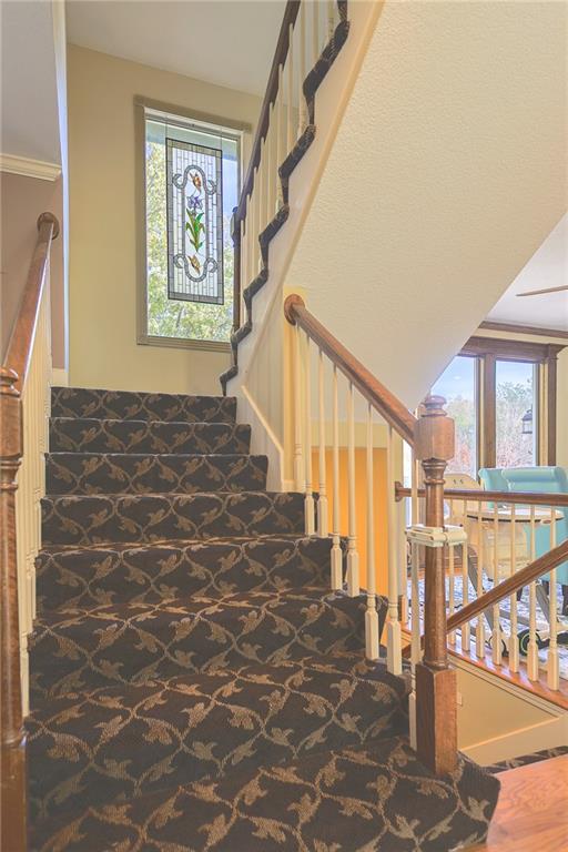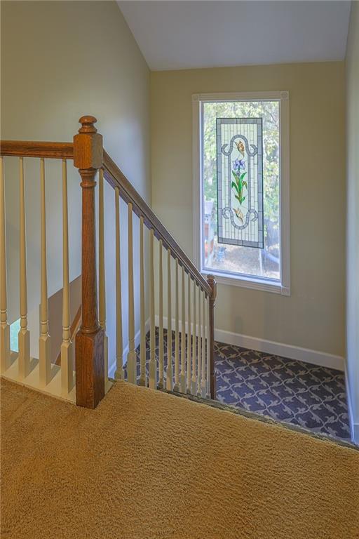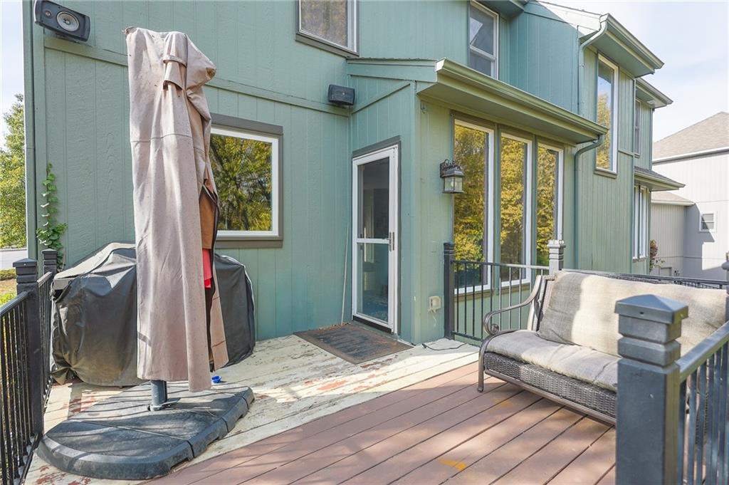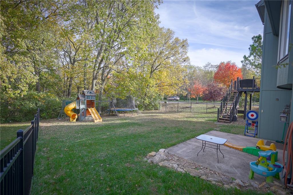 Enjoy the attractive metal fencing around the backyard and deck, with plenty of room for family gatherings and outdoor fun. The yard backs to green space and connects to scenic neighborhood trails. Inside, large east-facing windows fill the great room, stairway, and lower-level recreation room with natural light. The traditional kitchen features hardwood flooring, an island, and updated thermal windows overlooking the backyard. Laundry and a powder room are conveniently located off the kitchen.