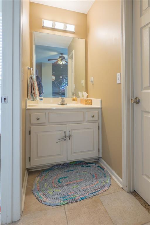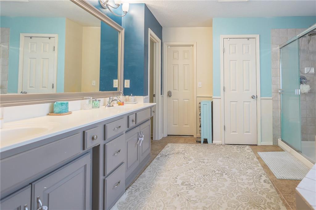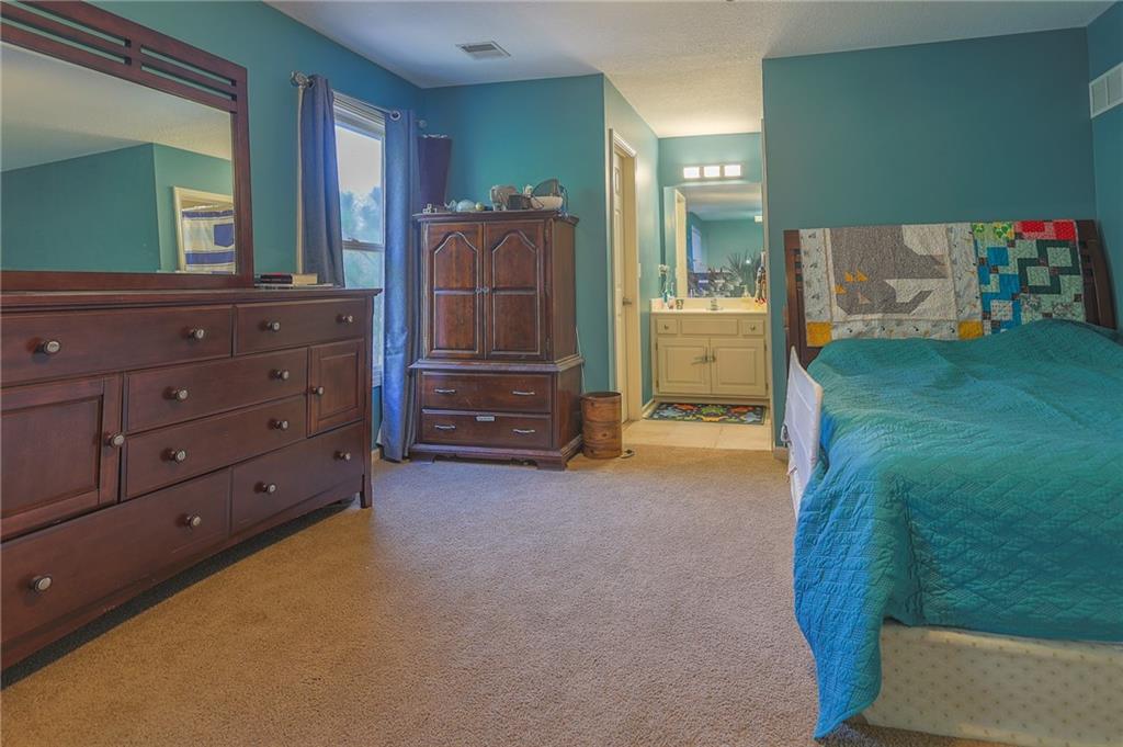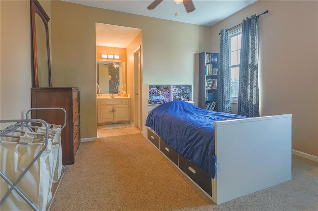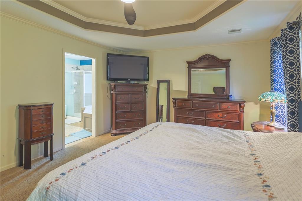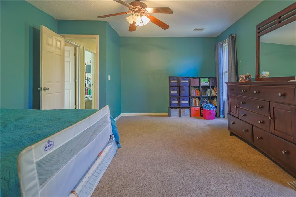 Upstairs, you’ll find four carpeted bedrooms, all with ceiling fans and easy access to bathrooms. The spacious primary suite offers a detailed ceiling, double vanity, whirlpool tub, separate shower, and walk-in closet. Two of the bedrooms share a Jack-and-Jill bath.