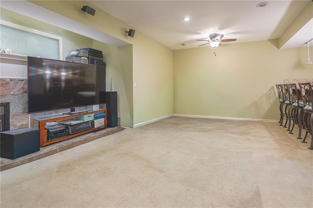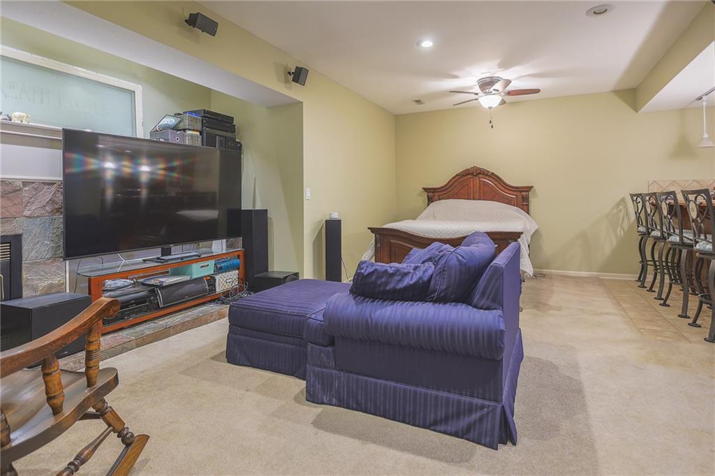 The fully finished basement includes a recreation room with big windows, a door to the patio, a bonus area with a second fireplace, and a wet bar—perfect for entertaining.