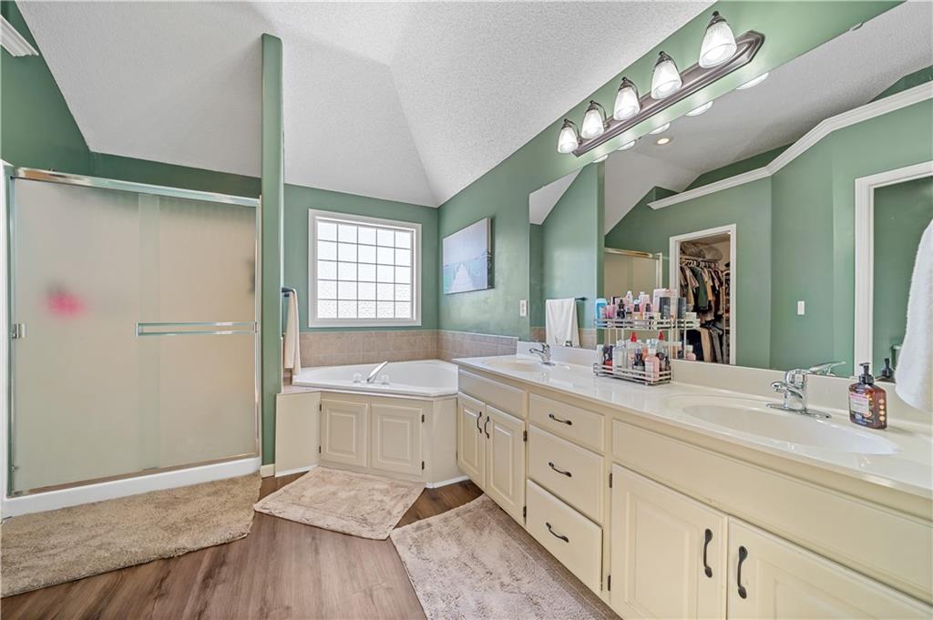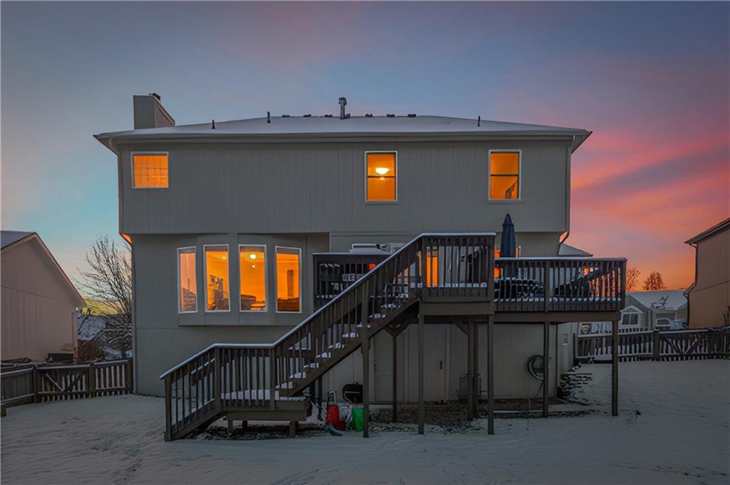 Welcome home to this stunning 2 story in Benson Place! Updated with Fresh Exterior Paint, NEW roof, and NEW Deck Stain. Home backs to Green Space and trail access. Enjoy open concept living on the main level with hardwood floors, stainless steel appliances, kitchen island, walk in pantry, open great room with huge windows that let in lots of natural light, fireplace, and formal dining/den. Home also features a large master suite with double vanities, large walk in closet, shower, and whirlpool tub. Laundry is conveniently located at bedroom level. Enjoy entertaining friends and family in your finished walk out basement! Basement is complete with bar, bathroom, and plenty extra space for storage. Community Amenities include walking trails, swimming pools, splash park, play area, and picnic grounds. This is a clean place ready for the next owner to call home!
