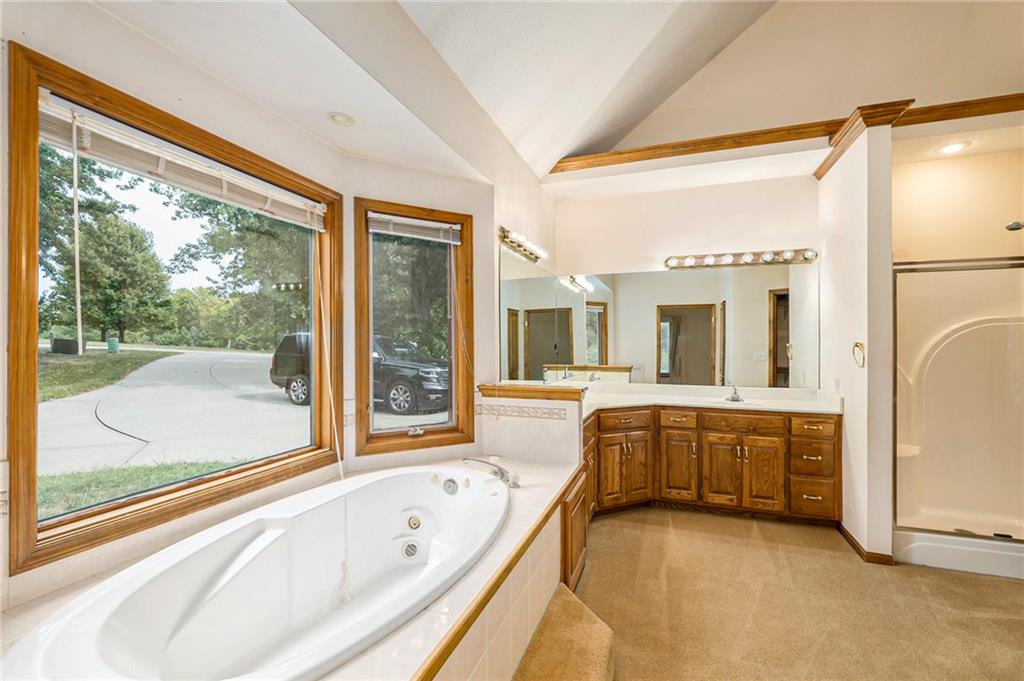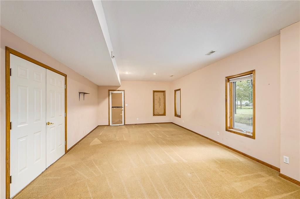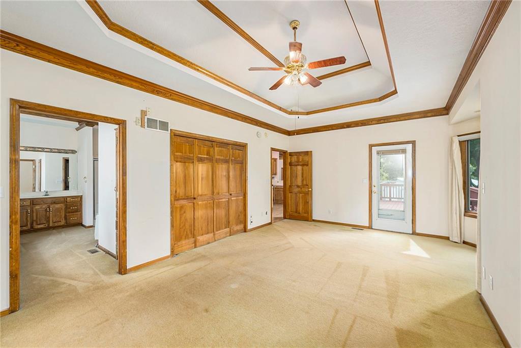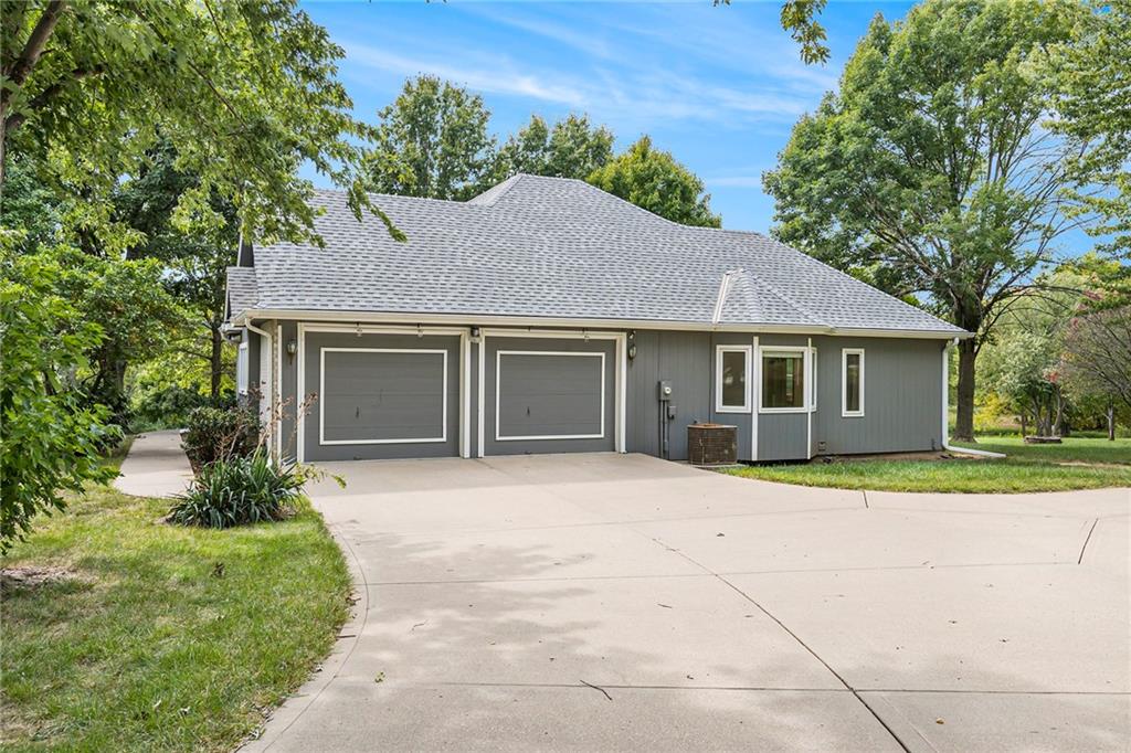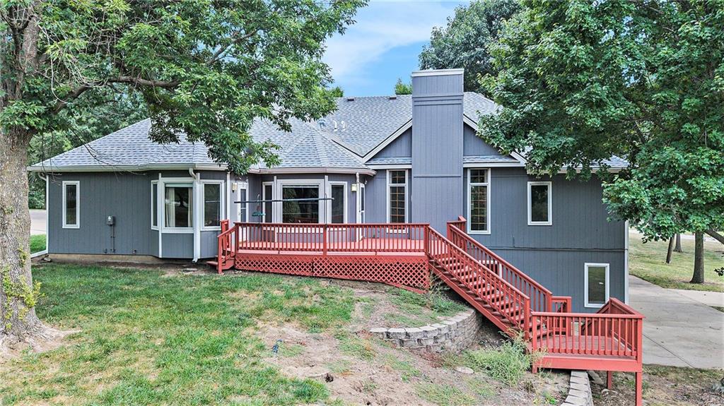 2.5 ACRES, HOLMES CREEK, KEARNEY SCHOOLS, 36X54 OUTBUILDING w/RV DOORS, SHARED POND, MATURE TREES, REVERSE 1.5!! HIGHLY MOTIVATED SELLER, BRING US AN OFFER!! Bring your vision and make this your own! GORGEOUS TREED LOT that shares a LARGE POND w/ neighbors. RELAX ON THE DECK & TAKE IN THE VIEWS! 3 car garage on main w/4th on LL. The SPACIOUS MAIN LEVEL features great room w/BEAMED CEILING, BRICK FIREPLACE & lots of windows for NATURAL LIGHT along w/ formal dining room or office. Kitchen features LOADS OF CUSTOM CABINETS, island, pantry, GAS COOKTOP, eating space and more! MAIN LEVEL PRIMARY ENSUITE has 2 closets, jetted tub, double vanity & separate shower. 2 secondary bedrooms, 2nd bath & laundry also on the main for convenience. LL is partially finished w/full bath & rec room area. SO MUCH SPACE to finish to your liking or use for storage. New roof in 2020. HURRY!!