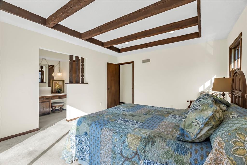 The primary suite featuring striking exposed wood beam ceiling detail, walk-in closet and en-suite. Two additional bedrooms, a full bath and convenient main-floor laundry complete the upper level.