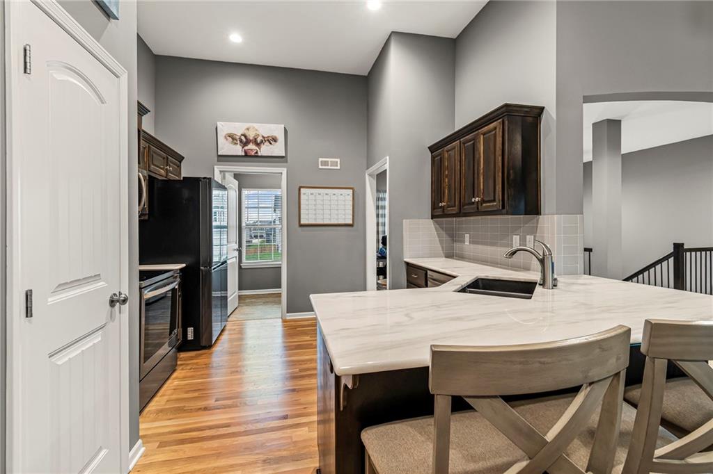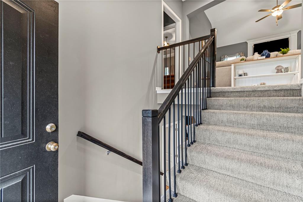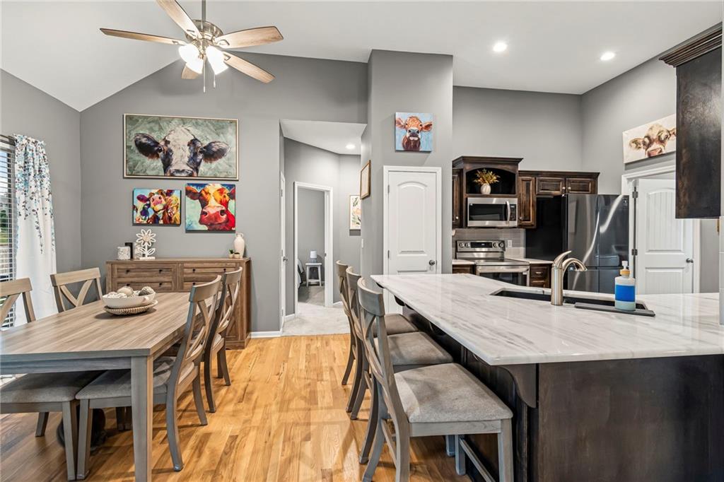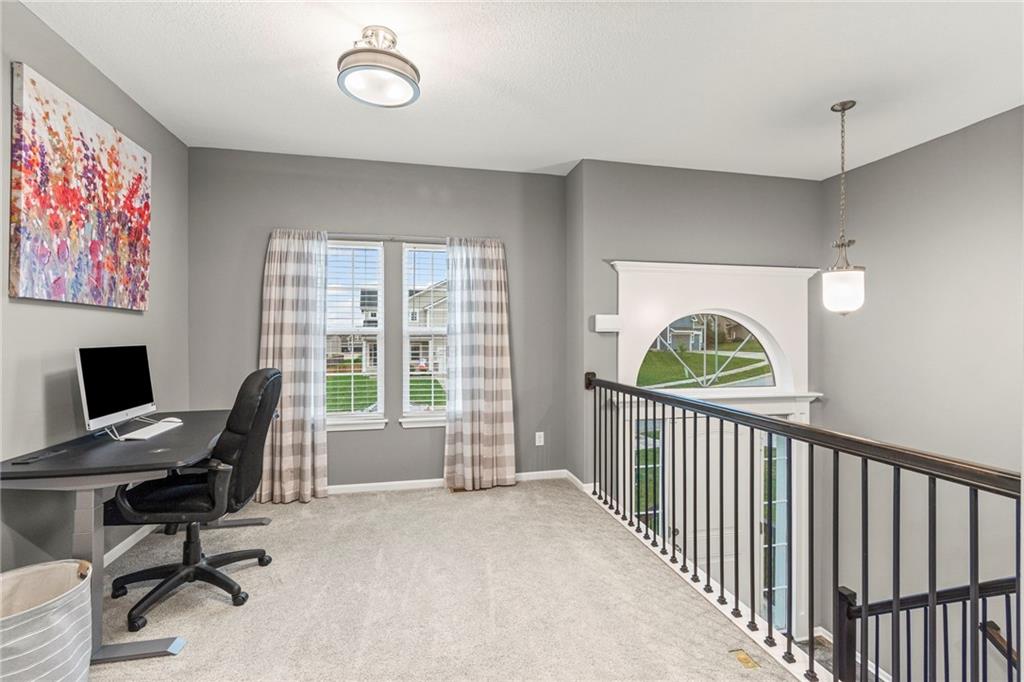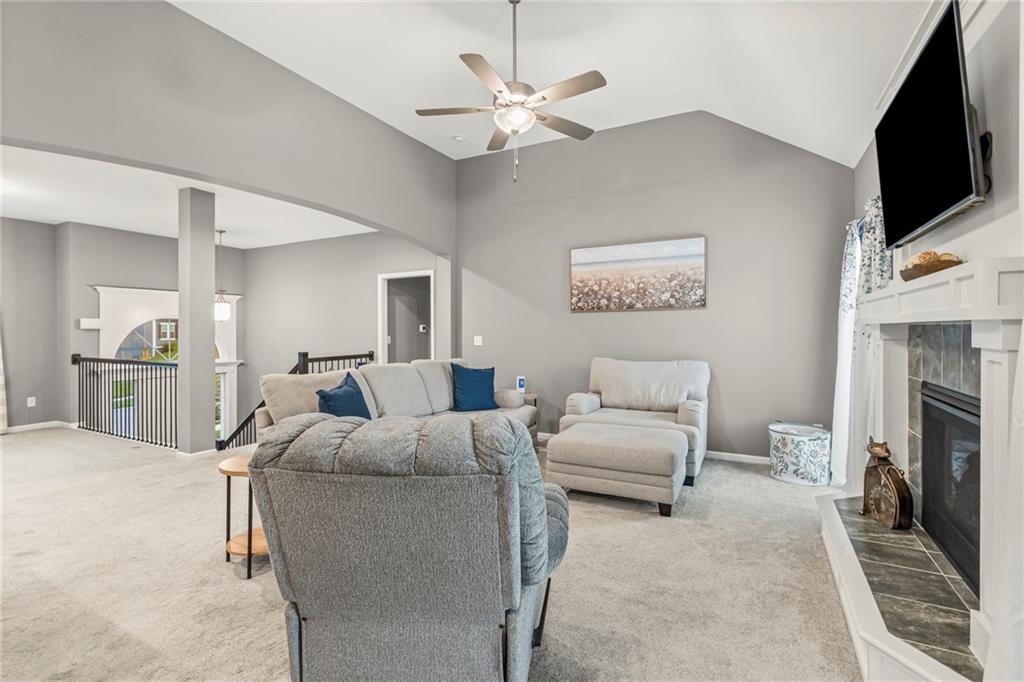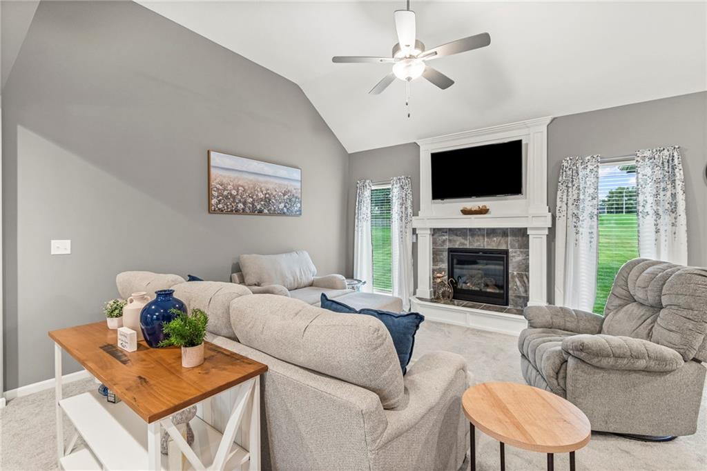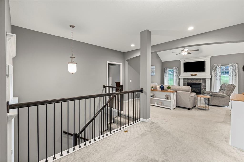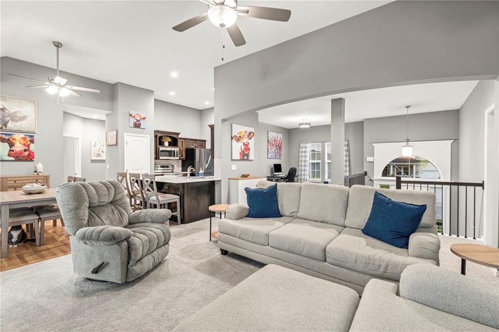 Step inside this nearly new Liberty home where thoughtful design and everyday comfort come together. The main level greets you with a spacious, light-filled living room anchored by a cozy gas fireplace and plush carpet that invites you to kick off your shoes and stay awhile. Just beyond, warm hardwood floors carry through the kitchen and dining area—an open, seamless space perfect for gatherings. The kitchen shines with quartz countertops, stainless steel appliances, ample cabinetry, and a pantry, while the conveniently located laundry room just off the kitchen keeps everything practical and within reach.