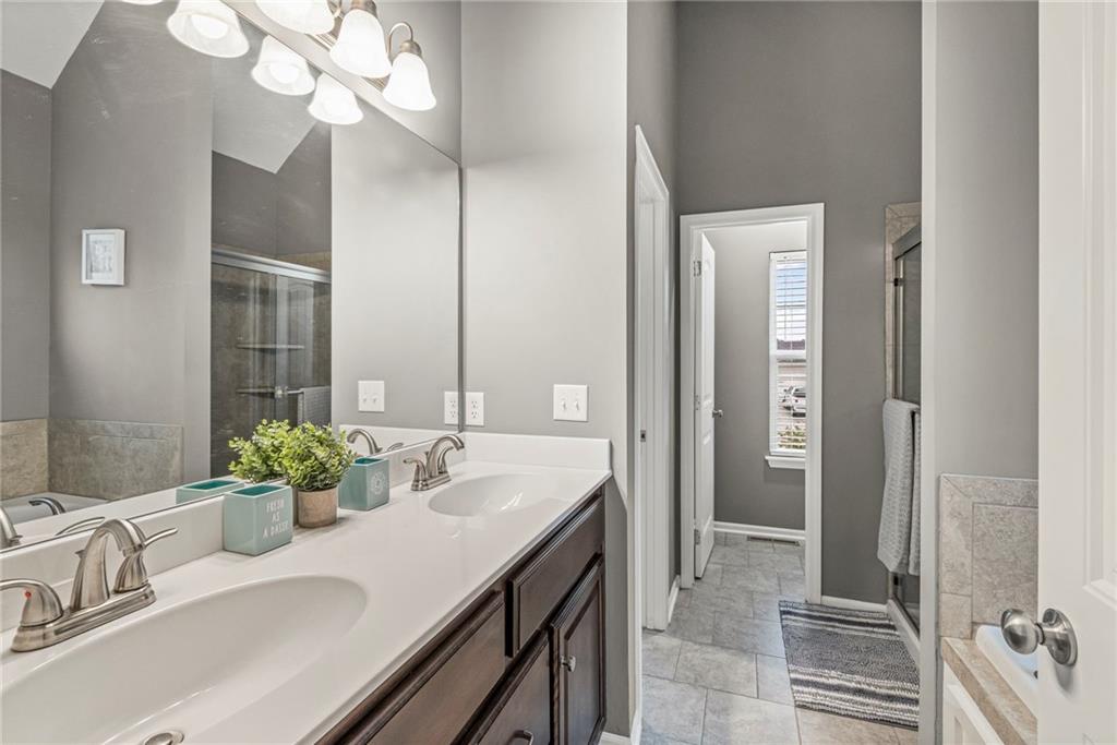 The primary suite is privately tucked away, offering a peaceful retreat with a large walk-in closet and a spa-inspired bath complete with dual sinks, soaking tub, and separate shower. Two additional bedrooms and a full bath round out the main level.