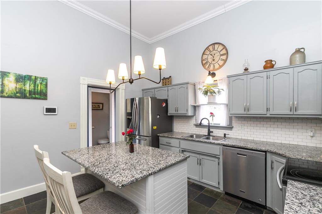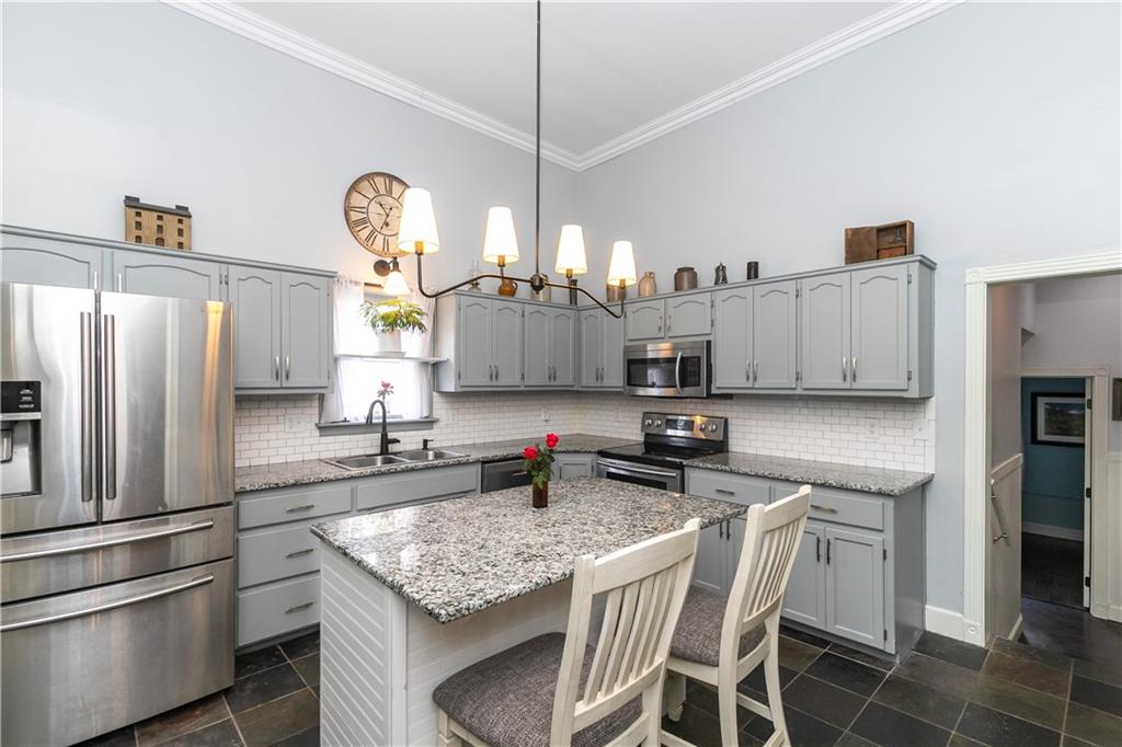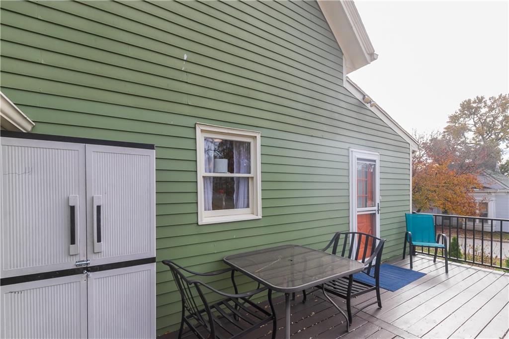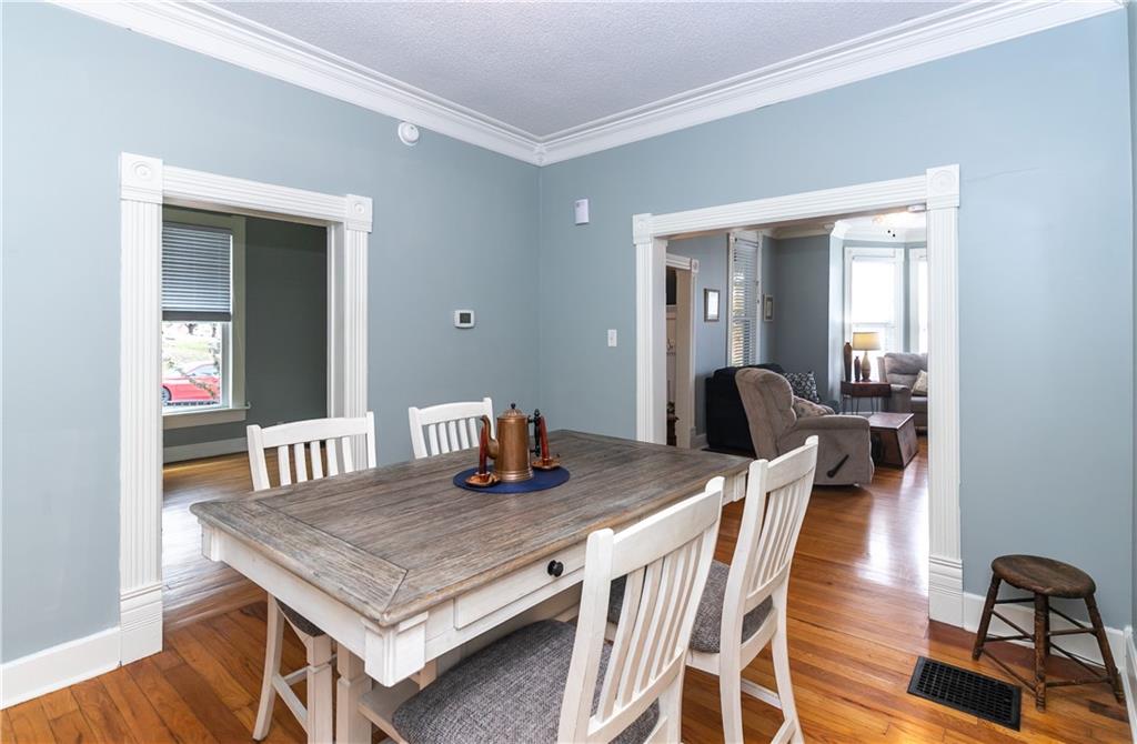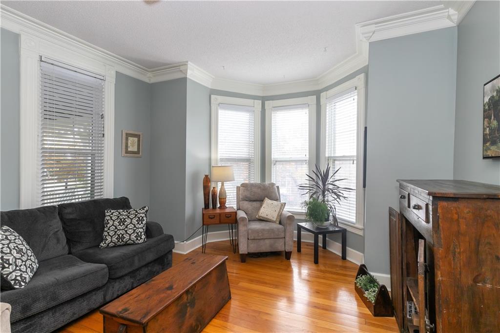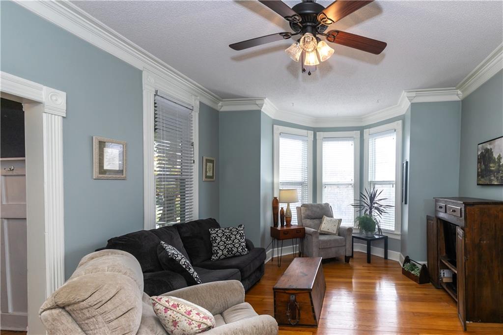 This beautifully updated century home seamlessly blends historical character w/modern comforts. Showcasing classic Queen Anne architecture, the residence features original moldings, refinished pine floors, & spacious bay windows that flood the living spaces w/natural light. Three spacious bedrooms & two and a half bath, including a private primary suite w/an adjacent bedroom and full bath. The open-concept layout offers a harmonious balance of expansive living areas & well-defined rooms: the living room, dining room, & east bedroom. The original fireplace, which anchors the living room & highlights the inviting bay window, is a focal point. Classic elements such as ornate moldings and Queen Anne flourishes enhance the home’s unique character. The modern kitchen boasts granite countertops, a central island, stainless steel appliances, ample counter space, redone cabinets, and a slate floor. The soaring 12-foot kitchen ceiling adds to the spacious & airy ambiance. A formal dining room is perfect for entertaining. A separate first-floor bedroom offers flexibility as a guest room or office; all conveniently located near the main floor laundry area with additional storage. Relax on the welcoming front porch or enjoy outdoor gatherings on the new back deck—ideal spaces for grilling & entertaining. A new two-car driveway was added in 2020. The corner lot is situated on a desirable historic street, just three blocks from Liberty Square and William Jewell College.