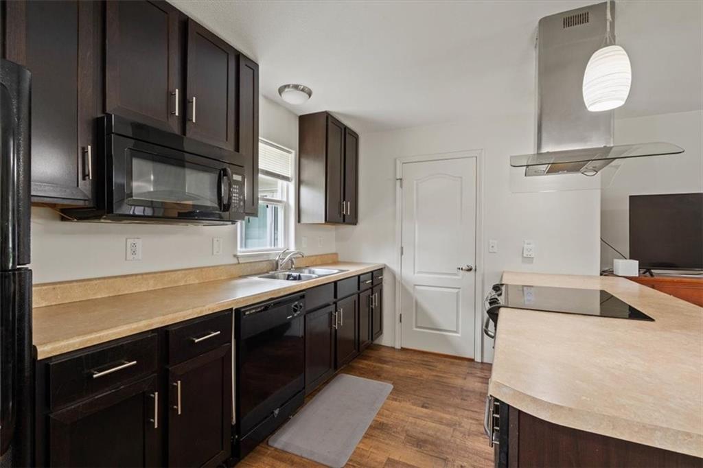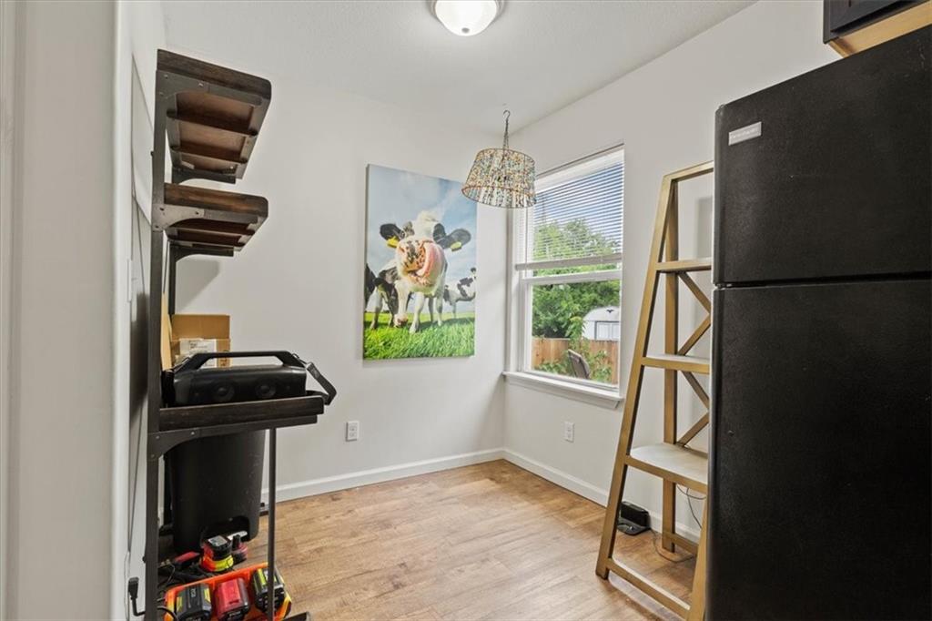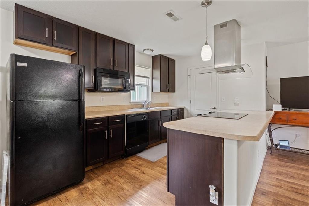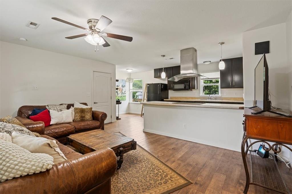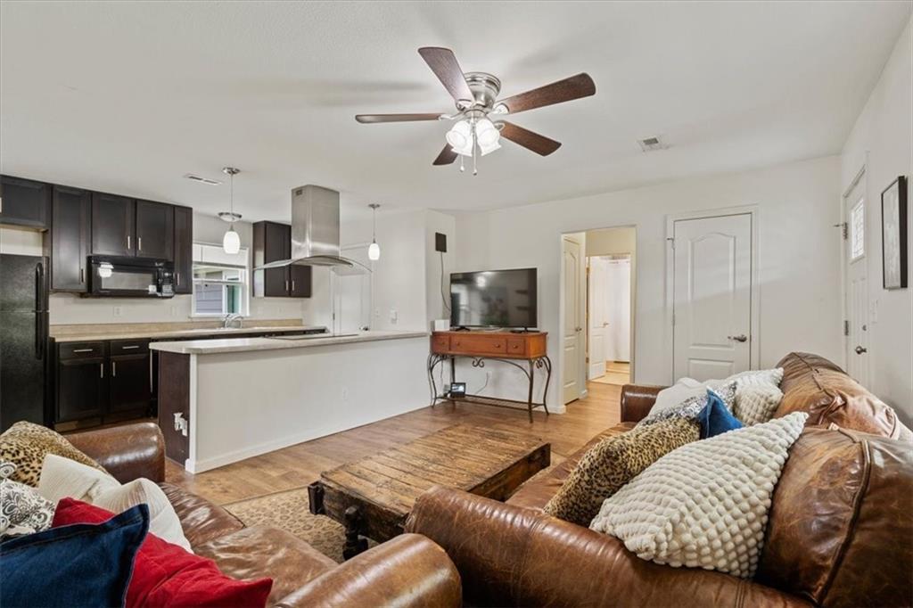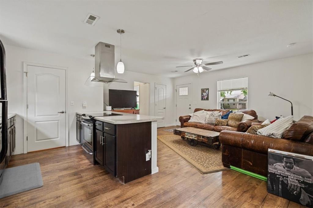 Inside, a smart open layout connects the kitchen and living area with a multi-use island, a cozy dining nook, and wood floors throughout, complemented by three comfortable bedrooms, or two with a home office option, a modern bath, and a dedicated laundry room.