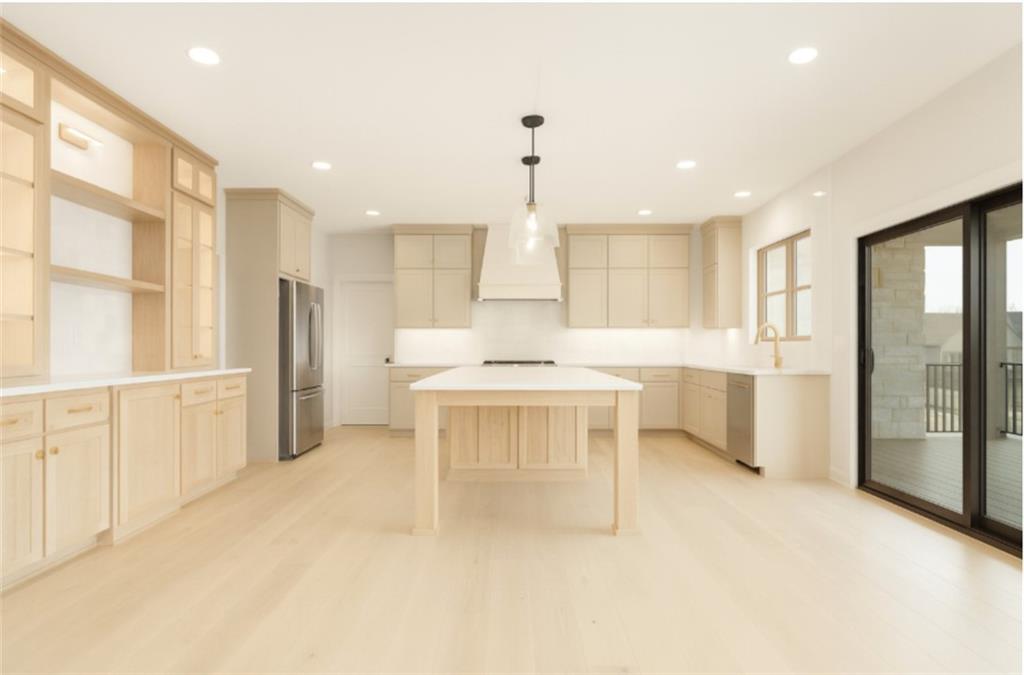 The open-concept kitchen is a true showpiece, featuring a table island, custom cabinetry with touches of white oak, and a large 48″ professional-grade range. White oak built-ins throughout the living areas add warmth and sophistication. Upstairs, a spacious loft provides extra room for a home office, play area, or cozy retreat.