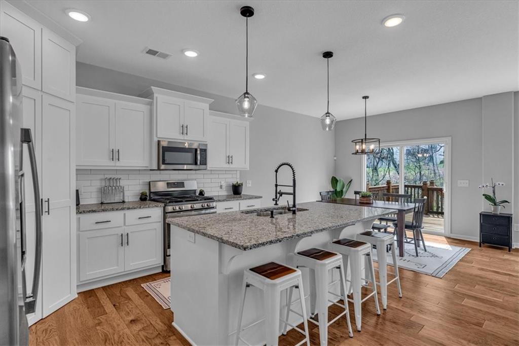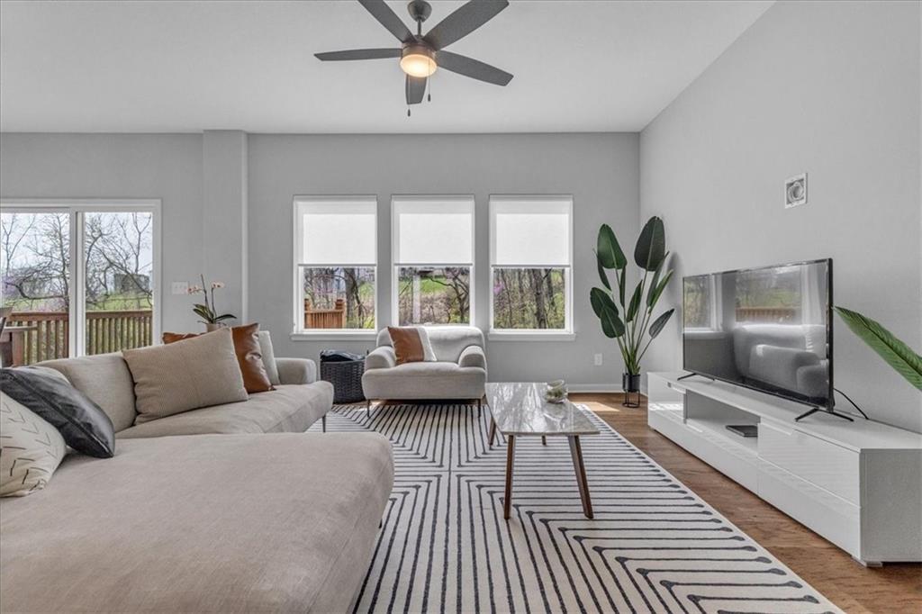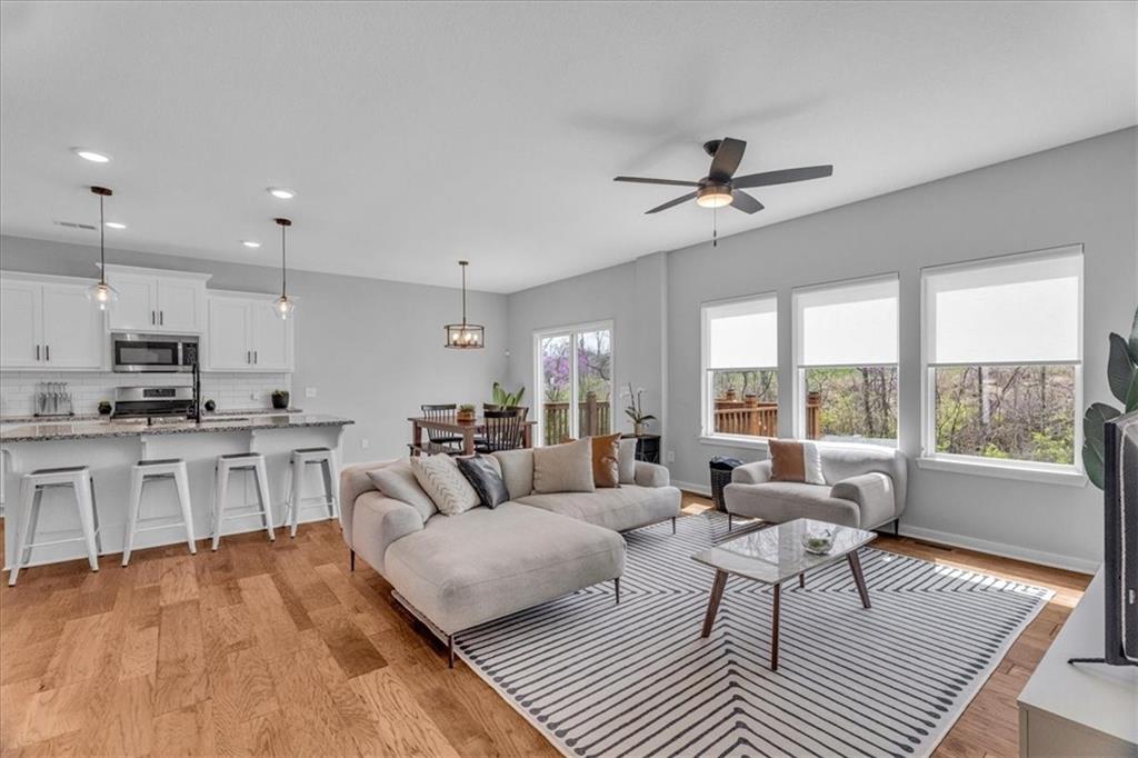 Step inside to discover a light and functional layout with the primary suite and laundry conveniently located on the main level. The open-concept main living area flows seamlessly to through the kitchen out to a large deck, perfect for grilling or entertaining. Head down the steps onto a large patio below offering even more space for outdoor enjoyment – all backed to a tree line for added privacy.