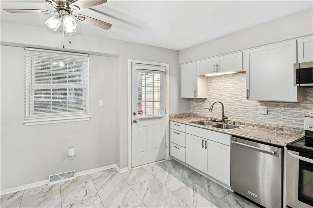 - Equipment Dishwasher, Disposal, Dryer, Microwave, Refrigerator, Electric Range, Stainless Steel Appliance(s), Washer
