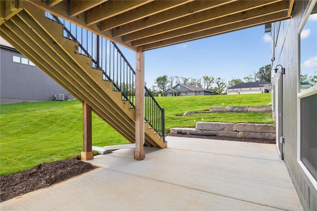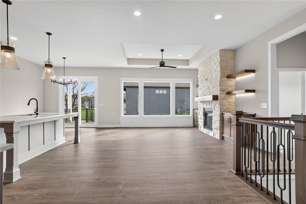 The Fairfield Reverse 1.5 By Inspired Homes displays a gorgeous, tray ceiling foyer that greets you and flows into an open main floor. A Spacious great room and kitchen features designer trim, and accented with oversized custom windows, a beautiful stone fireplace and custom cabinetry. Generous kitchen cabinets & counters plus an oversized island with quartz & XL walk-in pantry! All bathrooms have custom quartz countertops . Popular “Rev Wood” flooring in great room and main traffic areas. 10″ ceilings on the Main. This home boasts all one level living with the master suite on the main and features custom windows & spa bath with zero entry shower & dual vanities w/custom storage towers. The main floor laundry is located off the master walk-in closet for ultimate convenience! The 2nd Bedroom on Main Level ideal for office or guest room. Off the dining room is the Huge oversized 10×20 covered deck. Which walks down to the Enlarged covered patio for outdoor living! Lower level family room w/ 9′ ceilings is perfect for media/game room with wet bar. Plus, additional two bedrooms, bath and tons of storage space! Oversized 3rd car garage means room for the “toys”. This Home has Stunning features and Space for entertaining and storage. Located in Running Horse Subdivision and the Platte County School District. This homes estimated Completion is Early Fall.