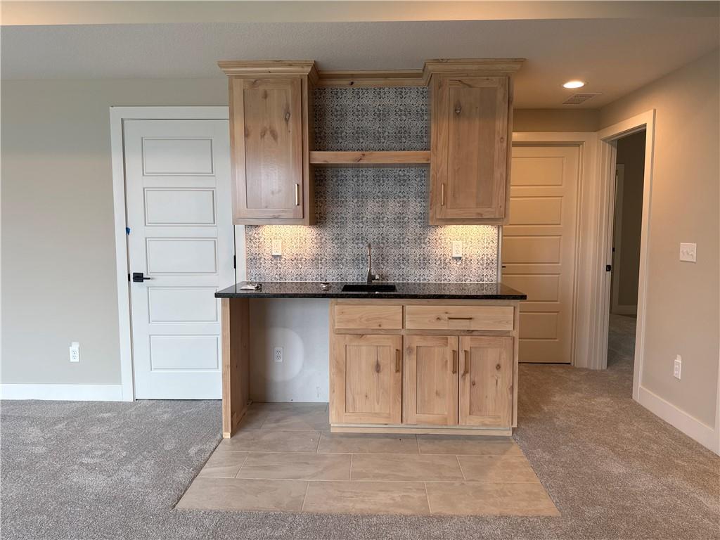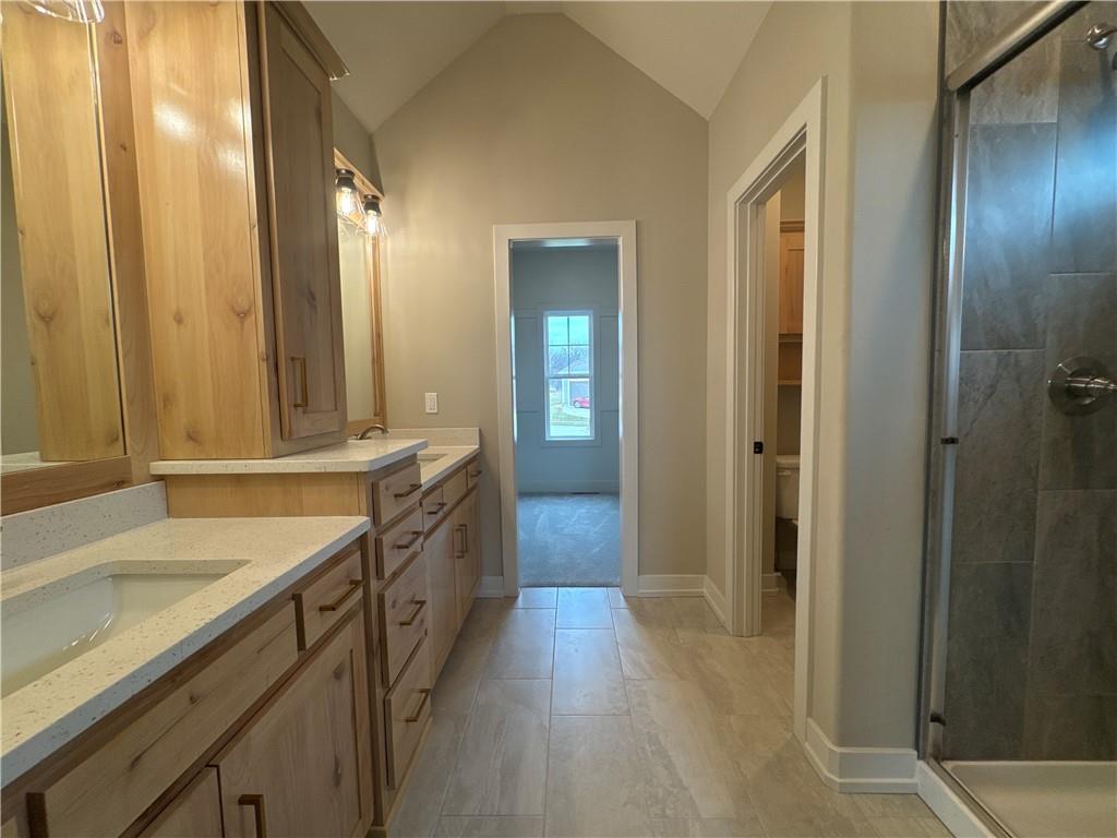 “The Ashton II,” an exquisite reverse 1.5 story residence with an extra large granite island, corner stone fireplace, private mud room, walkthrough master closet, jacuzzi tub in master, master shower with granite seat, dual quartz vanity in main, lot close to an acres, composite covered deck, extra large concrete pad in back, walkout basement, 2 full bathrooms in basement, HE furnace, blown in insulation. Laundry on main level. Wood floors through main floor primary bedroom. Walk in pantry. Wet bar in the walkout basement with room for a full size fridge. One bedroom in the basement has an en-suite bathroom. Beautiful front porch. In ground sprinkler system. All square footage is approximate. This home is complete and move-in-ready!