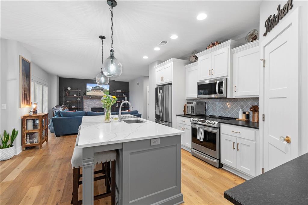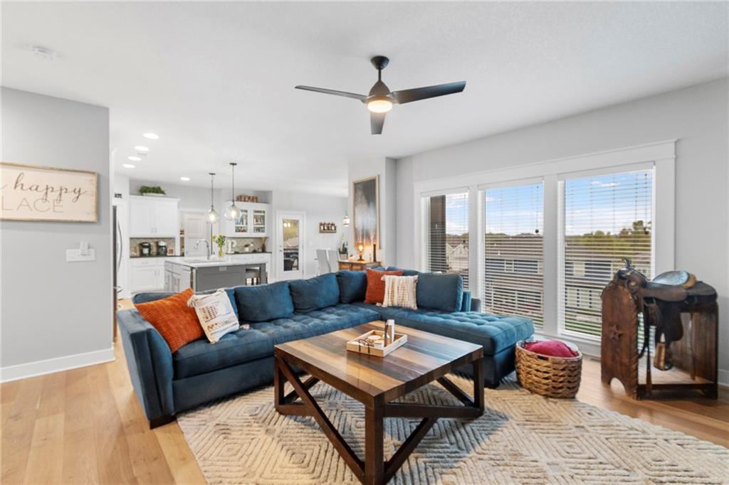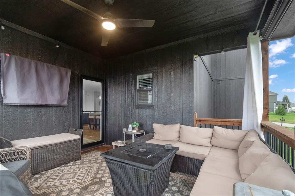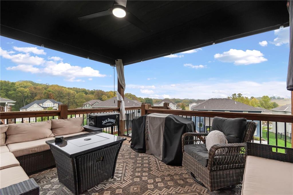 The kitchen, with its large quartz island, elegant gray arabesque backsplash, and walk-in pantry, opens to a cozy family room and covered deck. The adjoining patio, connected by the walkout basement, creates a seamless indoor-outdoor flow. Step outside to a giant backyard with fresh landscaping, full fencing, and a sprinkler system. The yard transitions beautifully from the neighborhood’s gentle landscape into wide-open green space beyond, making every sunset view unforgettable.