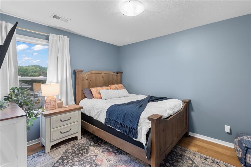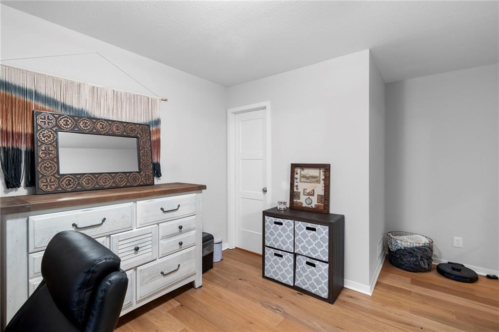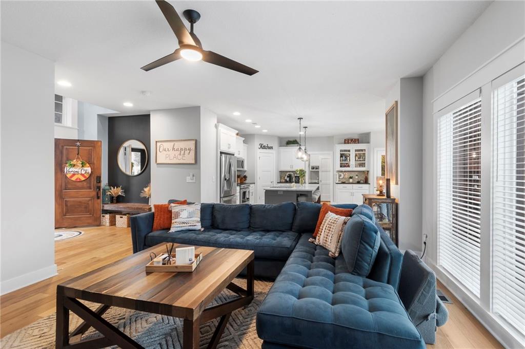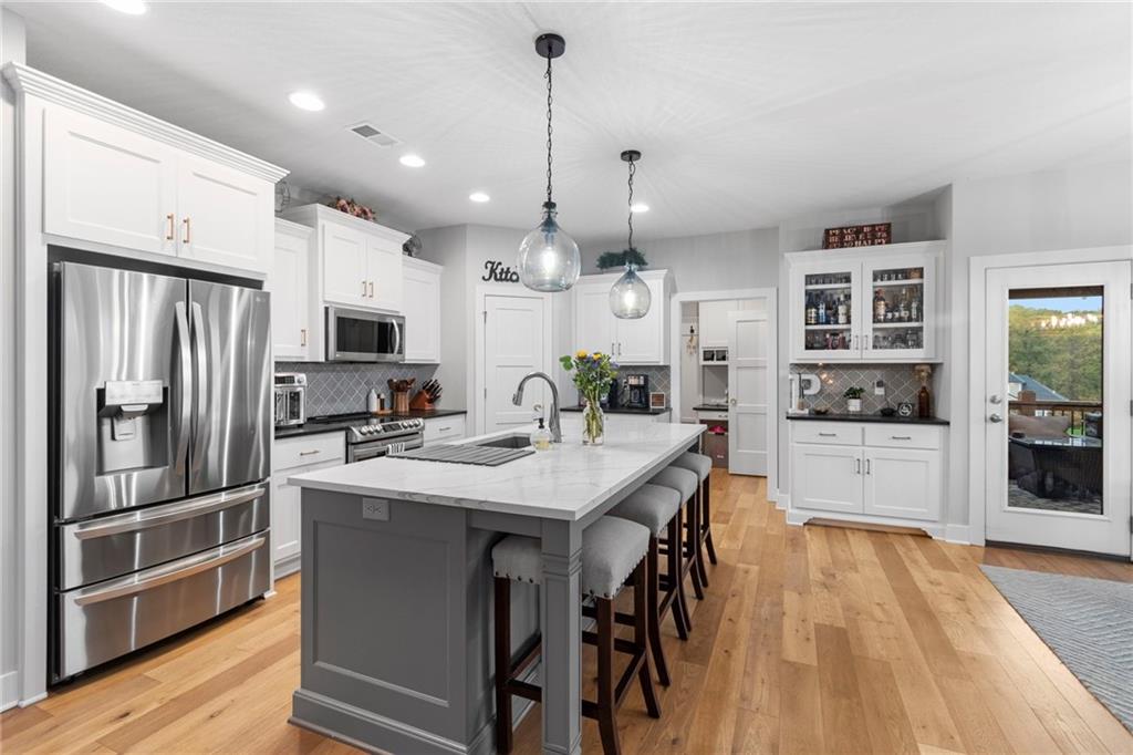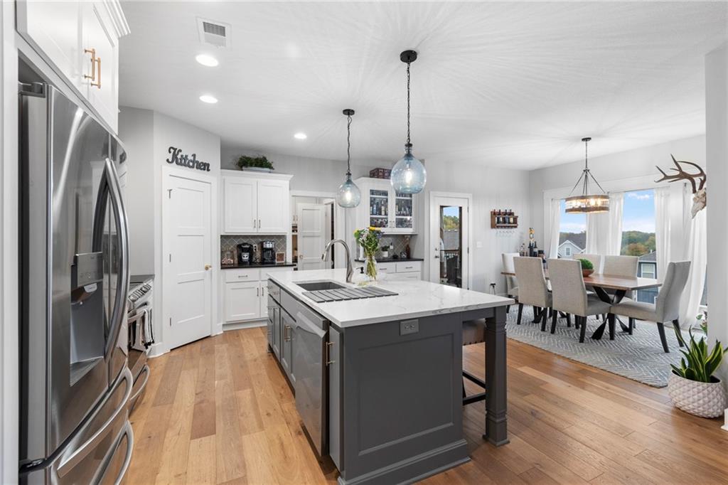 The kitchen, with its large quartz island, elegant gray arabesque backsplash, and walk-in pantry, opens to a cozy family room and covered deck. The adjoining patio, connected by the walkout basement, creates a seamless indoor-outdoor flow. Step outside to a giant backyard with fresh landscaping, full fencing, and a sprinkler system. The yard transitions beautifully from the neighborhood’s gentle landscape into wide-open green space beyond, making every sunset view unforgettable.