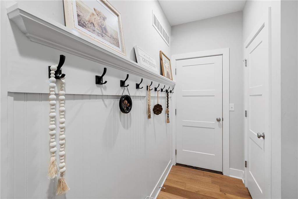 This home includes abundant storage closets, a practical mudroom with a built-in desk, and a deep utility sink in the laundry room. The primary suite feels like a private retreat with an oversized walk-in closet that connects directly to the laundry room. The spa-style bath features double vanities, a freestanding tub, a dual-head tile shower, and an elegant cascading chandelier.