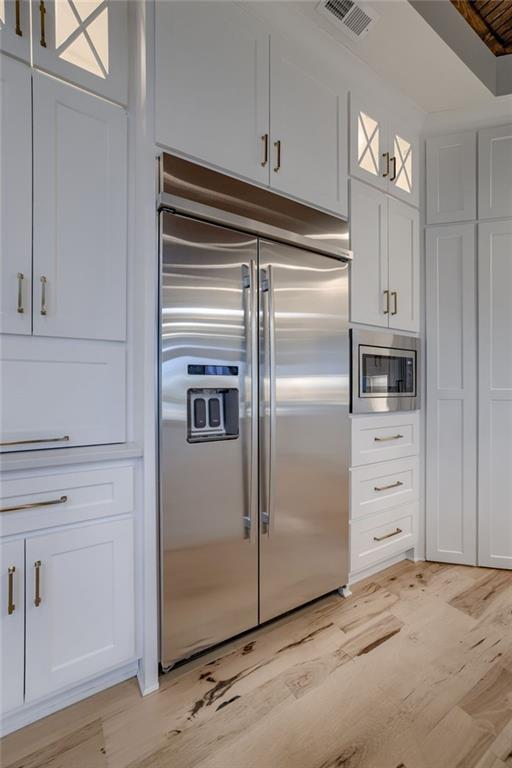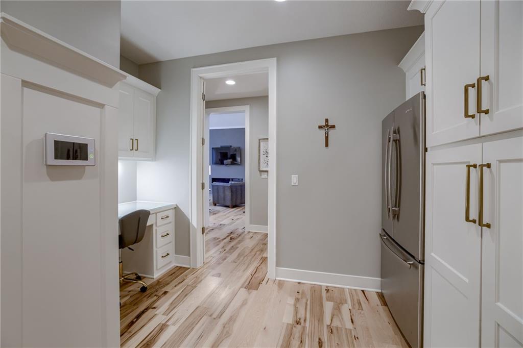 Inside, the home’s neutral interiors are a harmonious blend of rustic and modern design. Coffered ceilings, white cabinets with gold hardware, and rich wood accents create an elegant yet inviting atmosphere. The kitchen is a chef’s dream, featuring a stunning white quartz island, ideal for both meal prep and social gatherings.