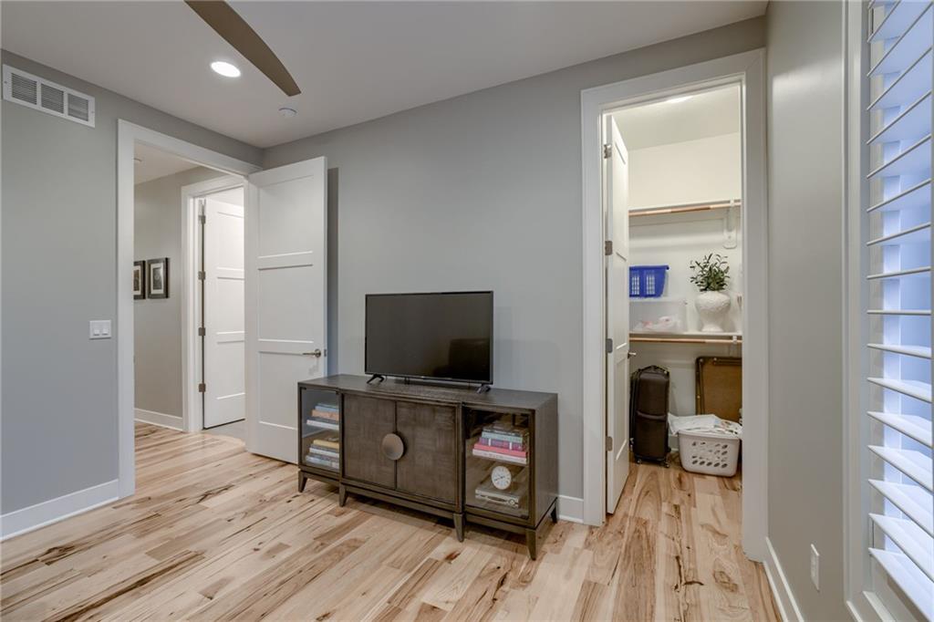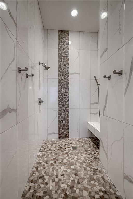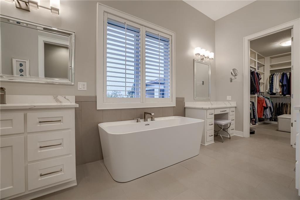 The opulent primary suite offers a spa-like retreat with a luxurious soaking tub, dual separate vanities, and an abundance of natural light. Throughout the home, large windows frame breathtaking views of the city skyline, creating a serene backdrop in every room.