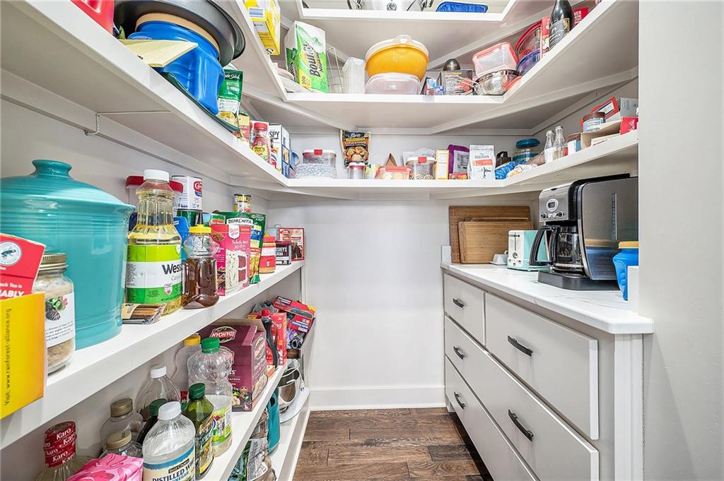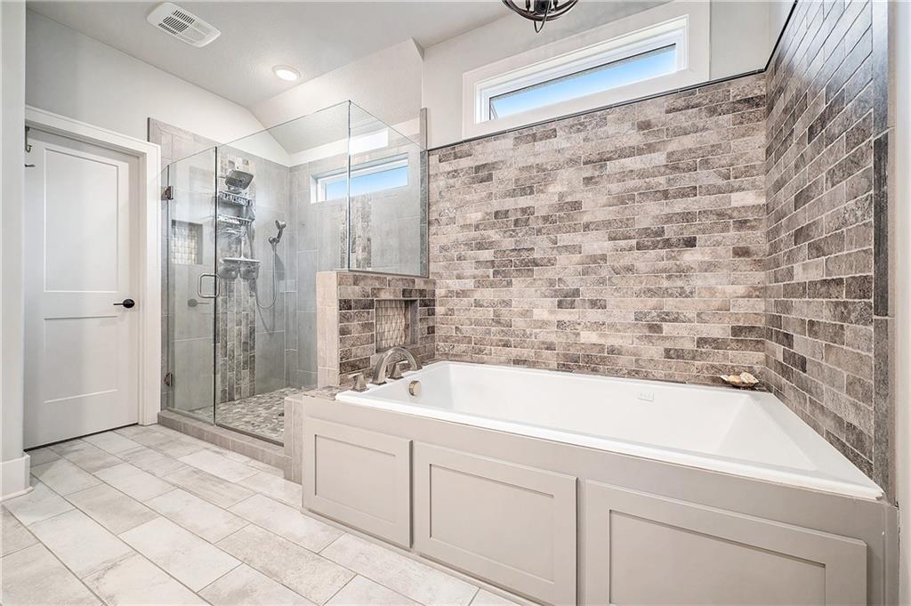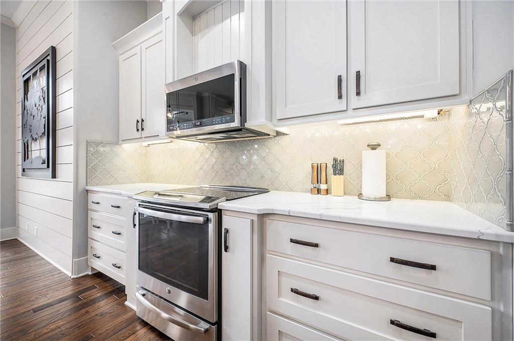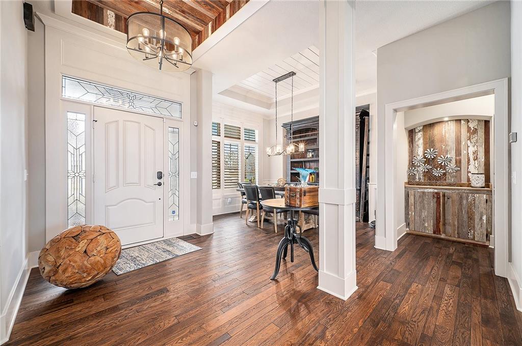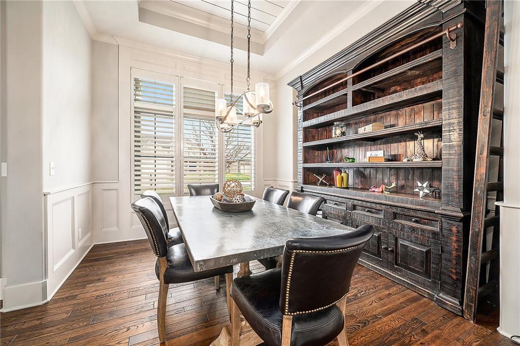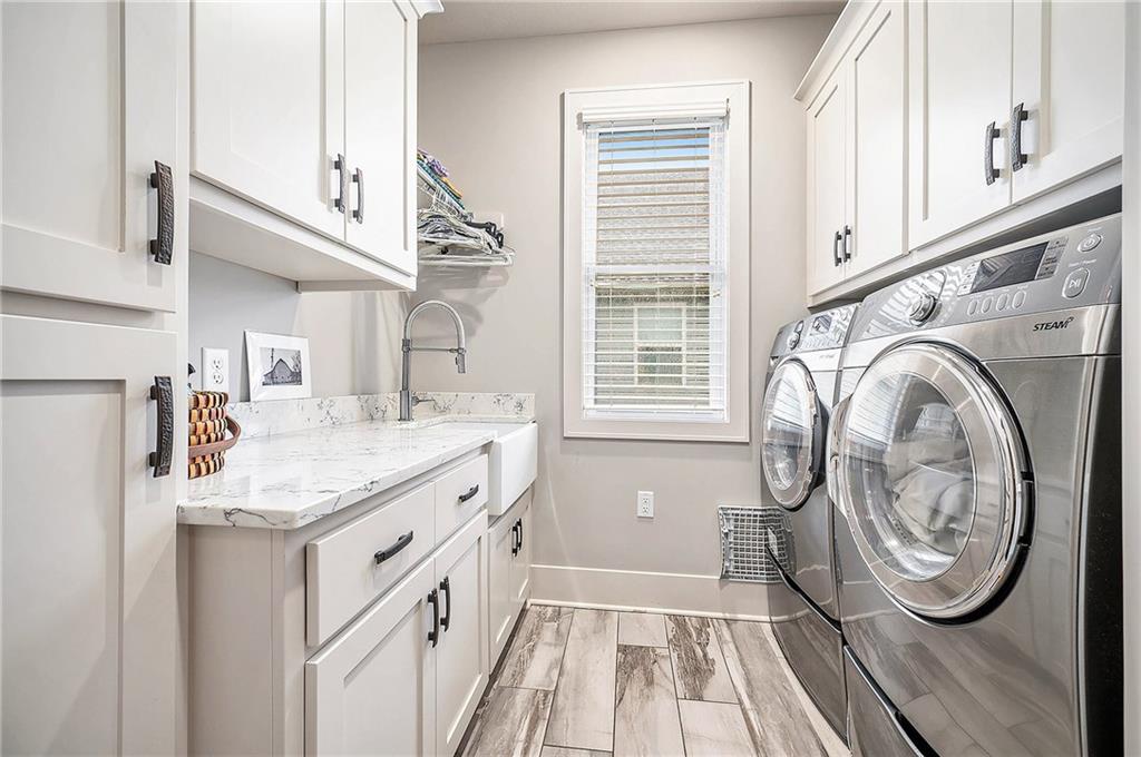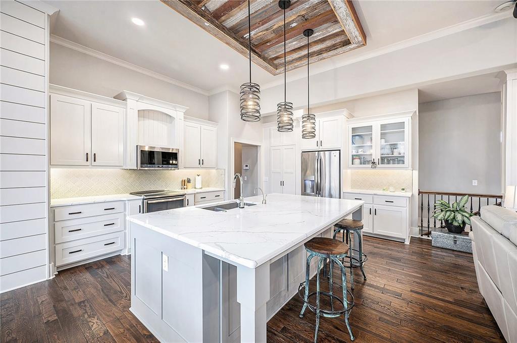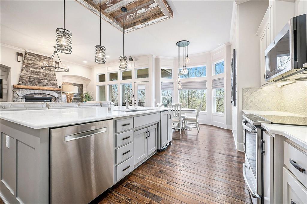 Inside, you’ll be wowed by the thoughtful details, including ceiling accents, shiplap walls, and premium finishes throughout. The light-filled living room features a striking stone fireplace and flows effortlessly into the spacious, two-toned kitchen. The kitchen is a chef’s dream with a large island, quartz countertops, a walk-in pantry with countertop storage, upgraded stainless steel appliances, and a stylish tile backsplash. Enjoy casual meals in the cozy breakfast nook or host gatherings in the elegant formal dining room.