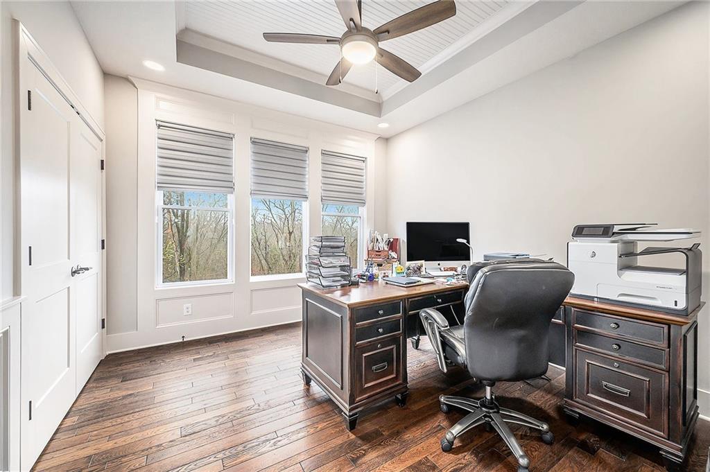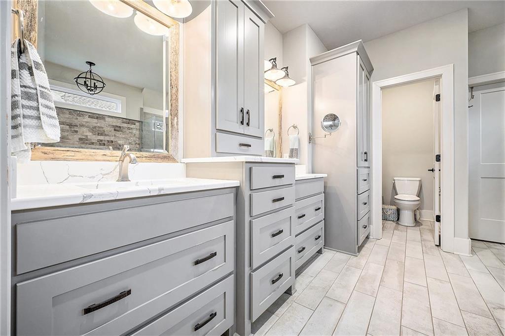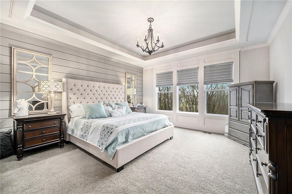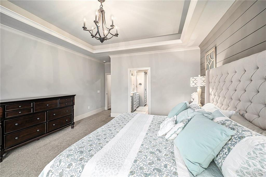 Conveniently located nearby is the laundry room, complete with storage cabinets, a small pantry, and an apron soaking sink. The main level primary suite is a true retreat, featuring a custom accent wall, chandelier, and recessed ceilings. The luxurious en-suite bath offers a soaking tub, large walk-in shower, generous storage, and an expansive walk-in closet. A secondary bedroom on the main level serves perfectly as a guest room or home office.